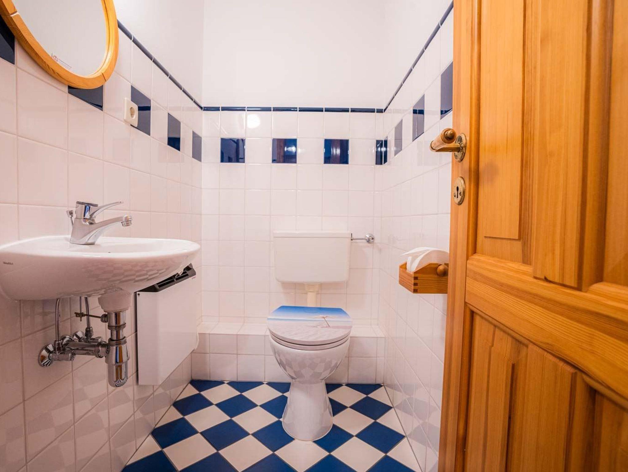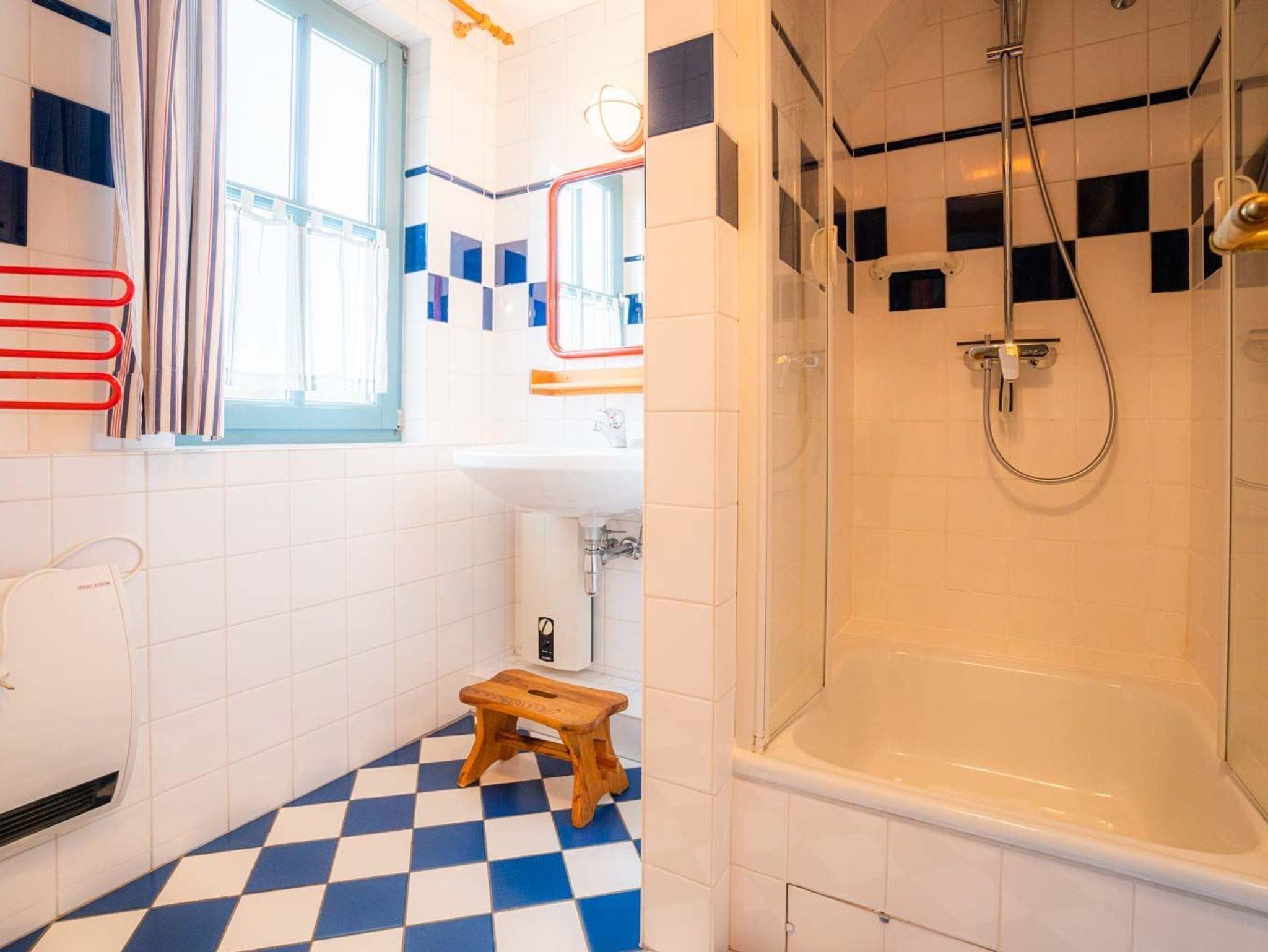 Badezimmer (Duschbad) mit Dusche, Föhn und Tageslicht. Separates WC mit Waschbecken.