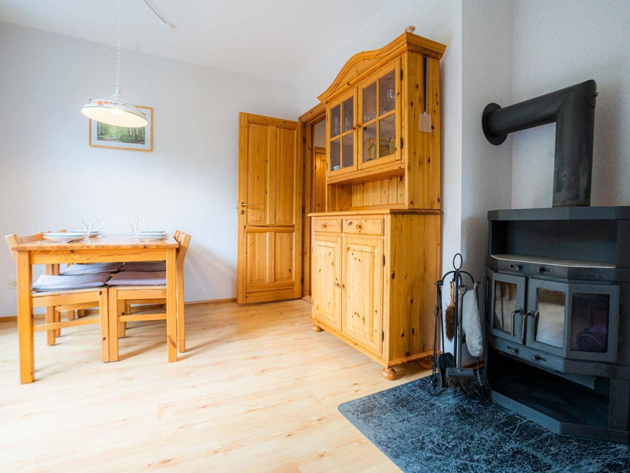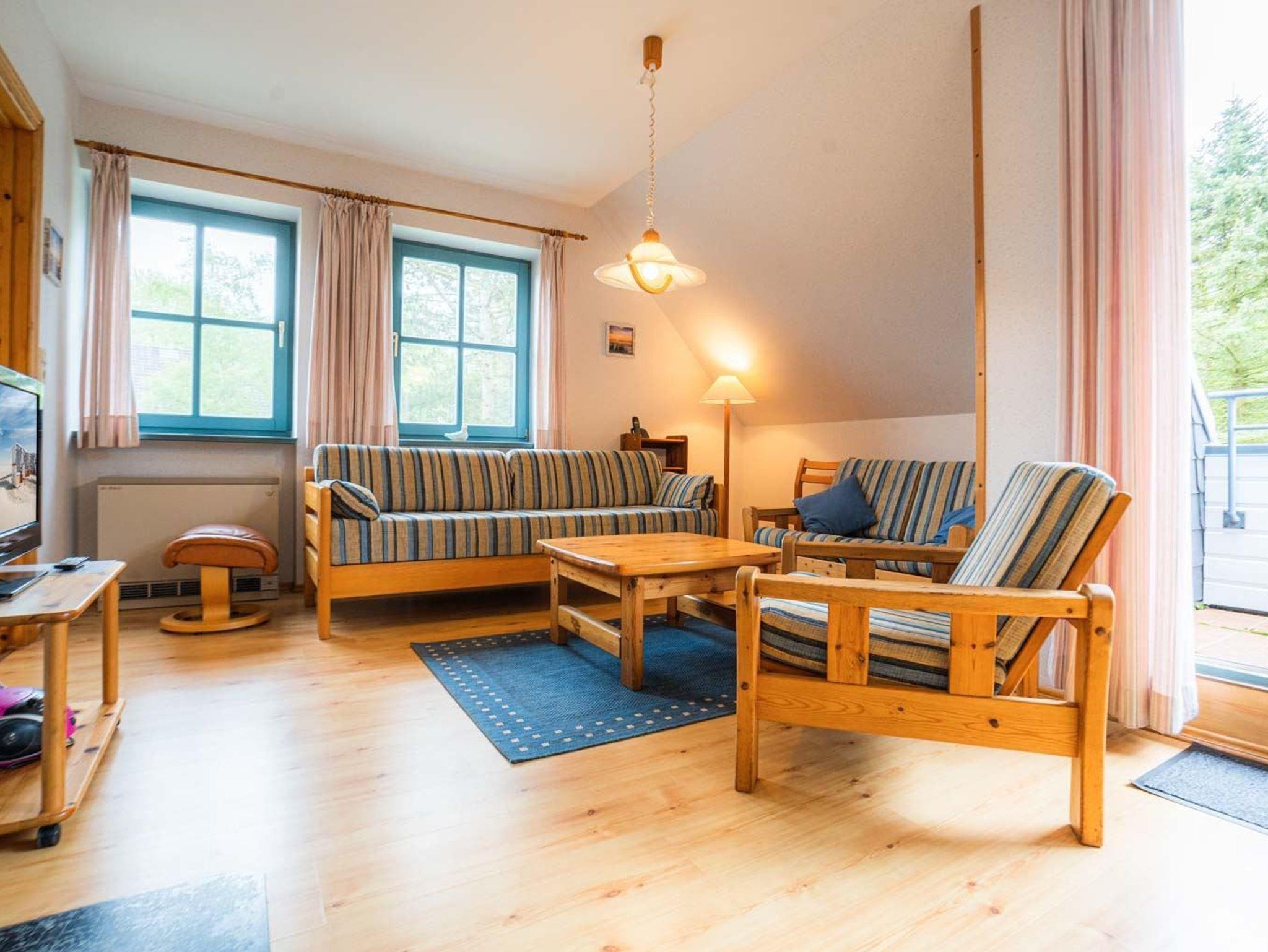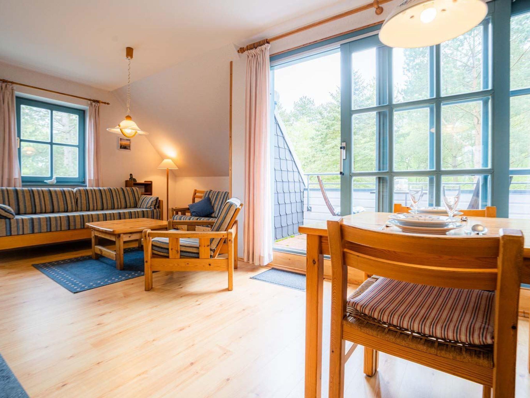 Wohnzimmer mit 2 Sofas (3er und 2er), Sessel, TV (Kabel), Radio mit CD-Player, Esstisch mit 4 Stühlen und Kaminofen. Direkter Zugang zum möblierten, windgeschützten Balkon nach Südwesten mit schönem Ausblick auf das angrenzende Wäldchen.