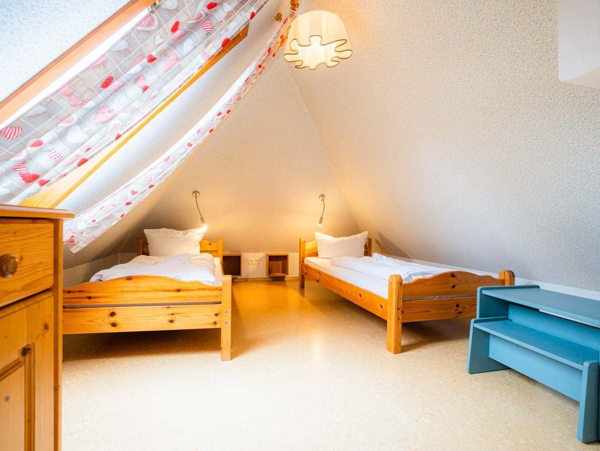 2. Schlafzimmer mit 2 Einzelbetten (je 90x200cm), Kleiderschrank, Kommode, 2 Sesseln, Radio. Zugang zu diesem Schlafzimmer über eine sehr steile Treppe mit Kindergitter.