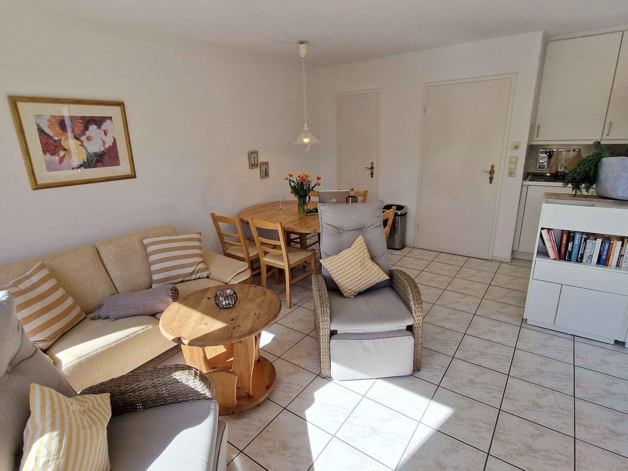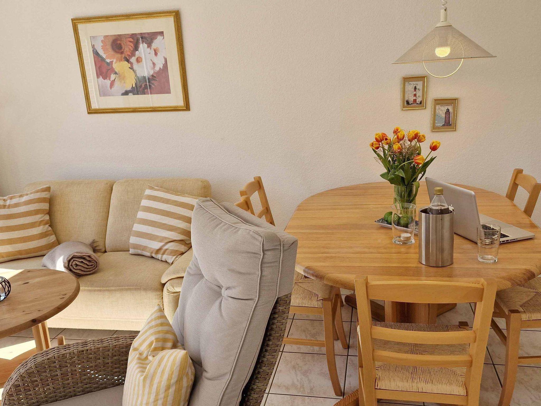 Nach dem Betreten des Flures gelangen Sie in den Wohnbereich mit Wohnküche und Zugang zu den beiden großzügigen Terrassen. Der großzügige Esstisch im Wohnbereich ist ideal für die Zubereitung köstlicher Mahlzeiten und das Verbringen gemeinsamer Momente mit Ihren Liebsten.