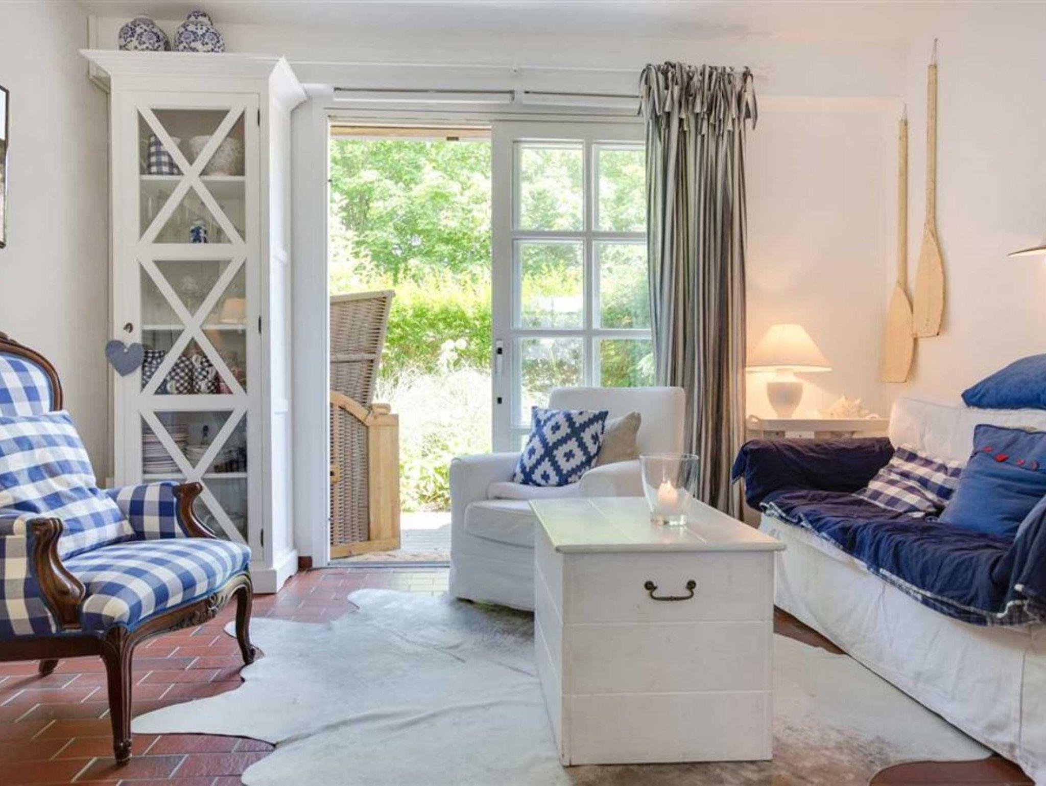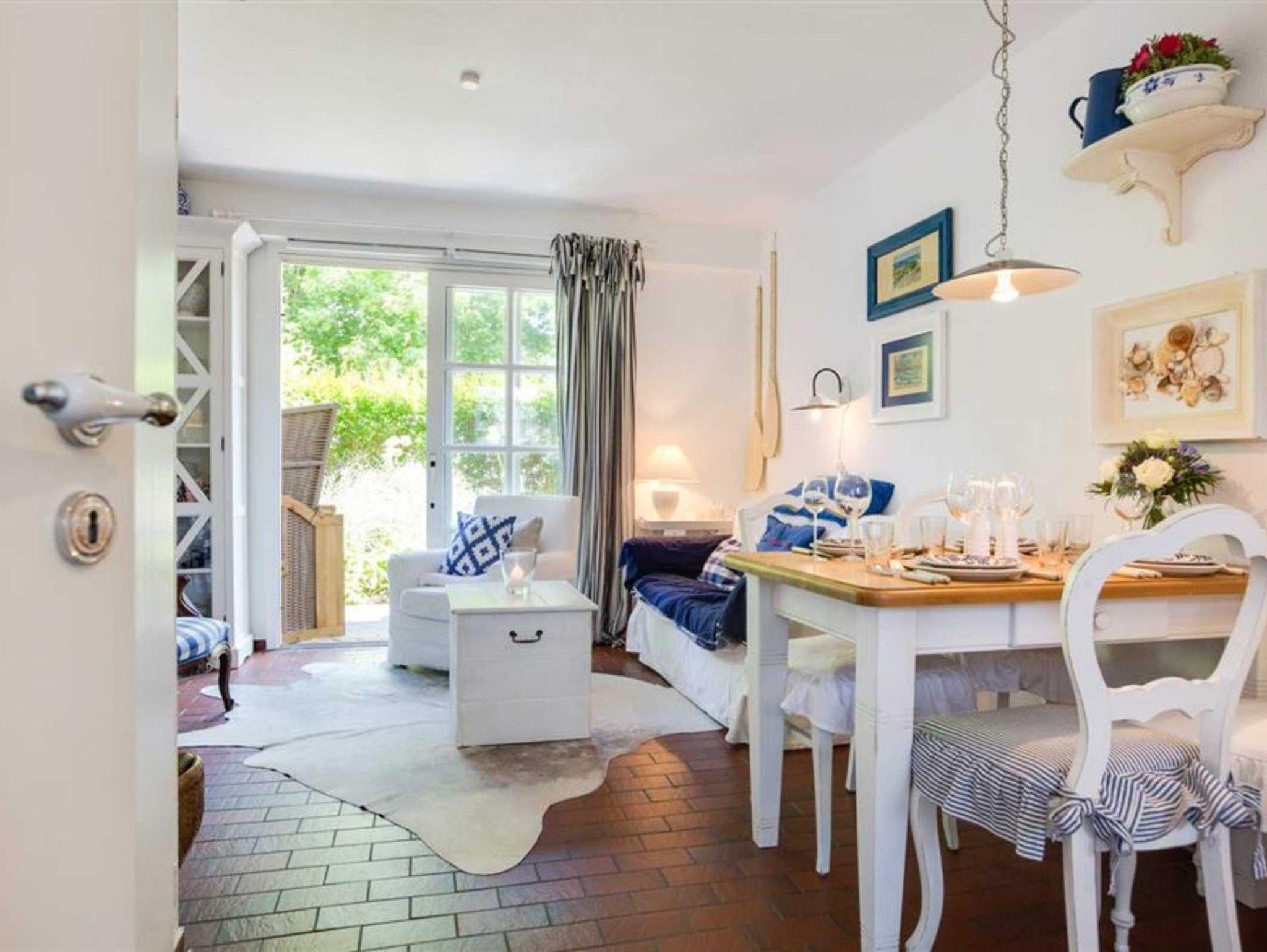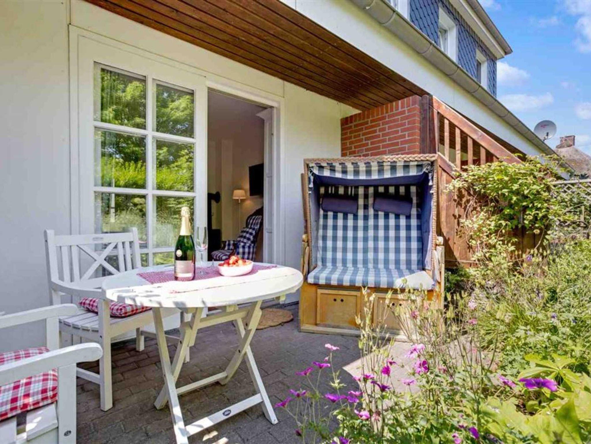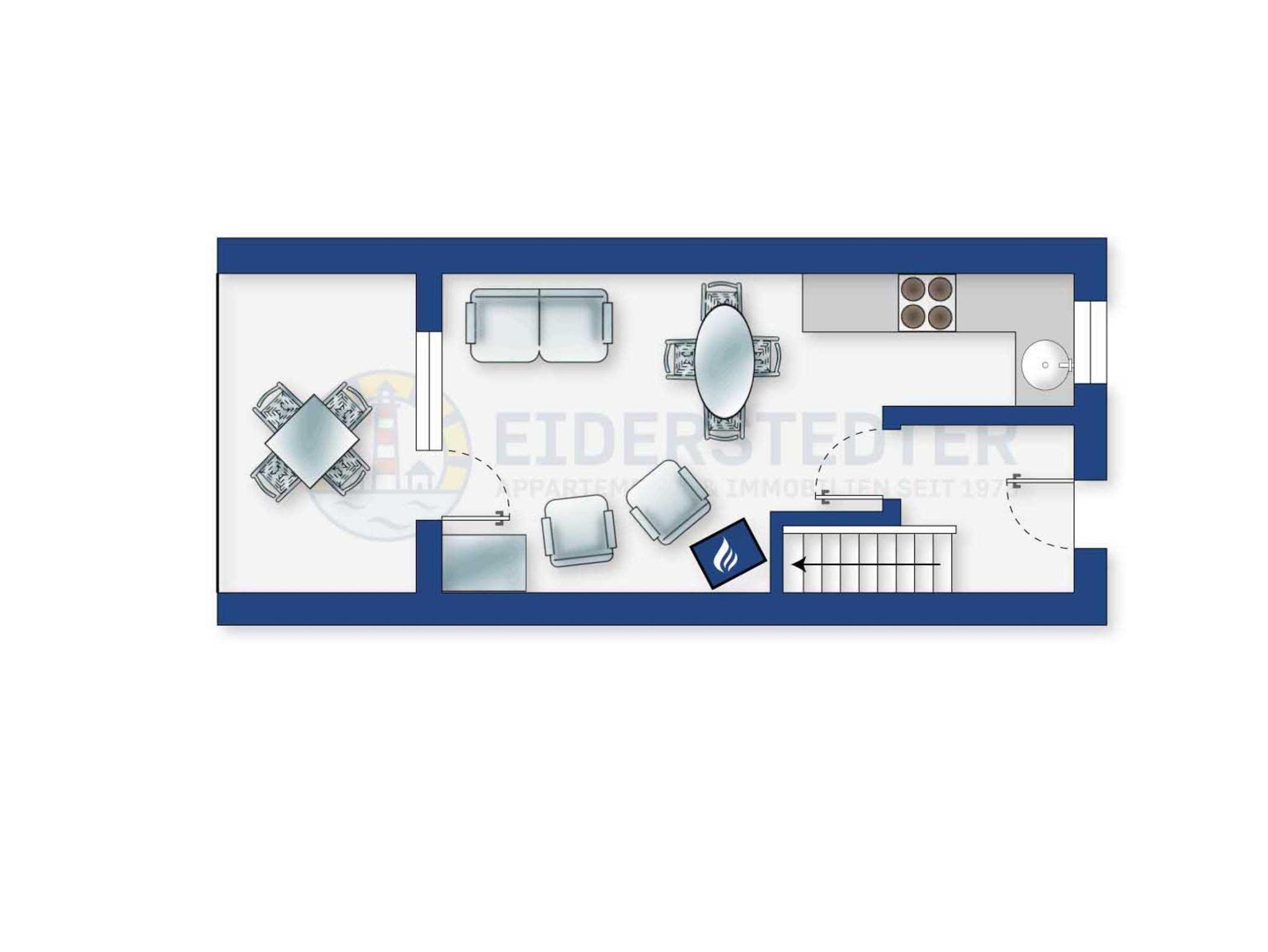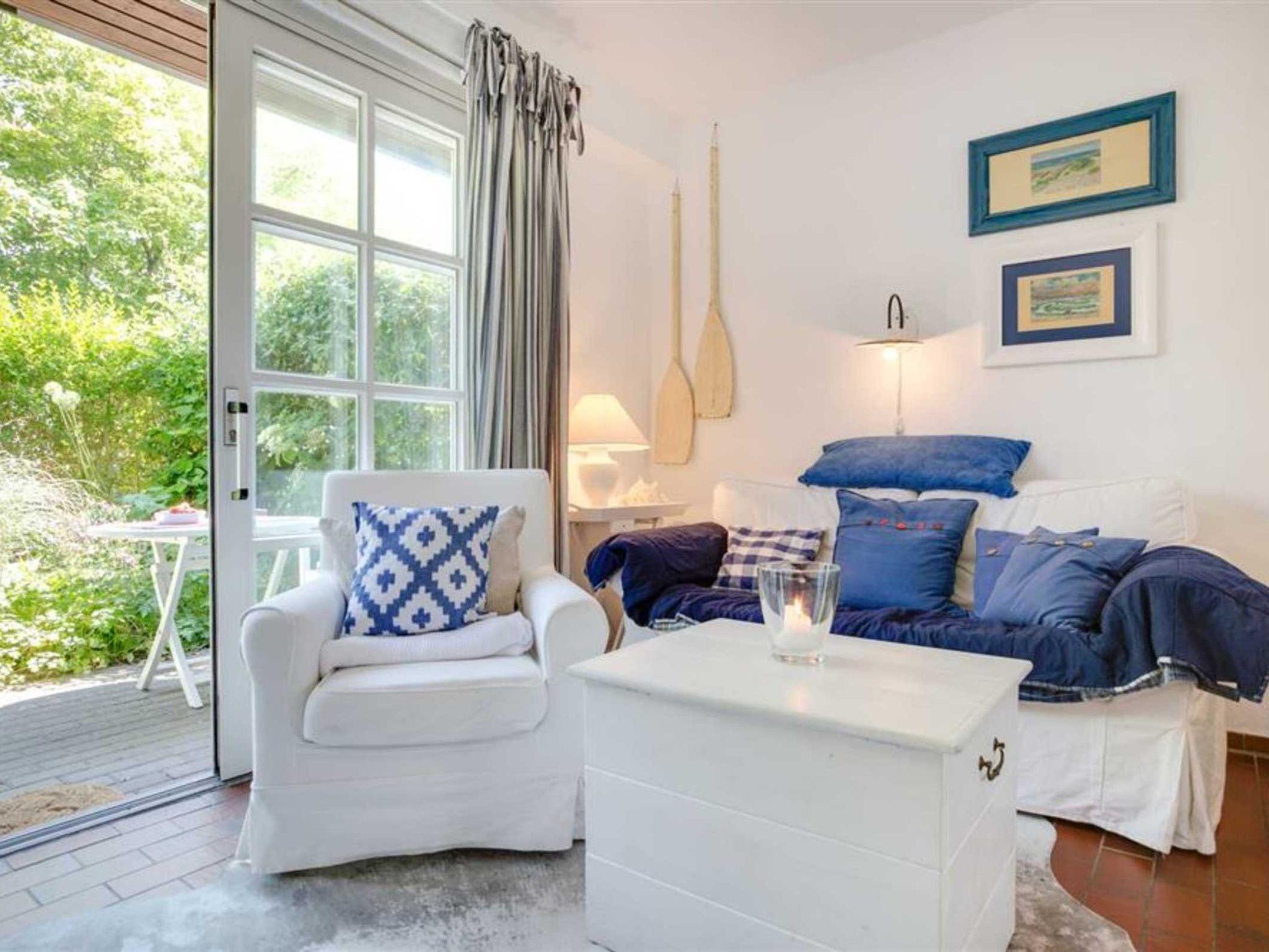 Wohnzimmer mit Sofa (2er), 2 Sesseln, Kaminofen, TV (Sat), Radio mit CD-Player und Esstisch mit 4 Stühlen. Direkter Zugang zur windgeschützten, möblierten Terrasse nach Osten. Ein Tischgrill ist ebenfalls vorhanden. Offene Küche mit Backofen, Kühlschrank mit Gefrierfach und Geschirrspüler. Abstellraum mit Mikrowelle, Staubsauger und Bügelset.