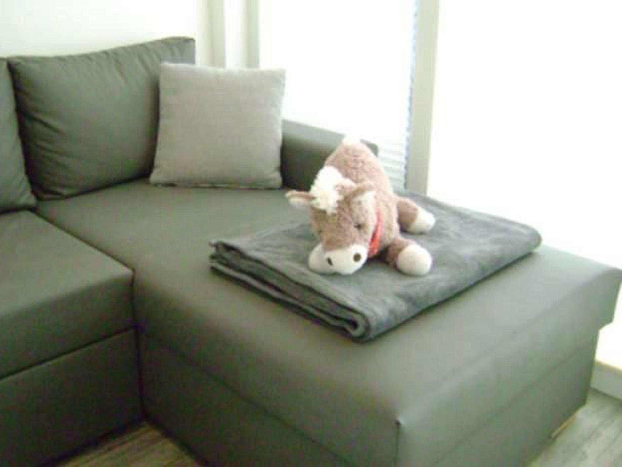 Im Wohnzimmer steht zudem ein gemütliches ausklappbares Ecksofa zur Verfügung, das bei Bedarf eine zusätzliche Schlafmöglichkeit bietet.