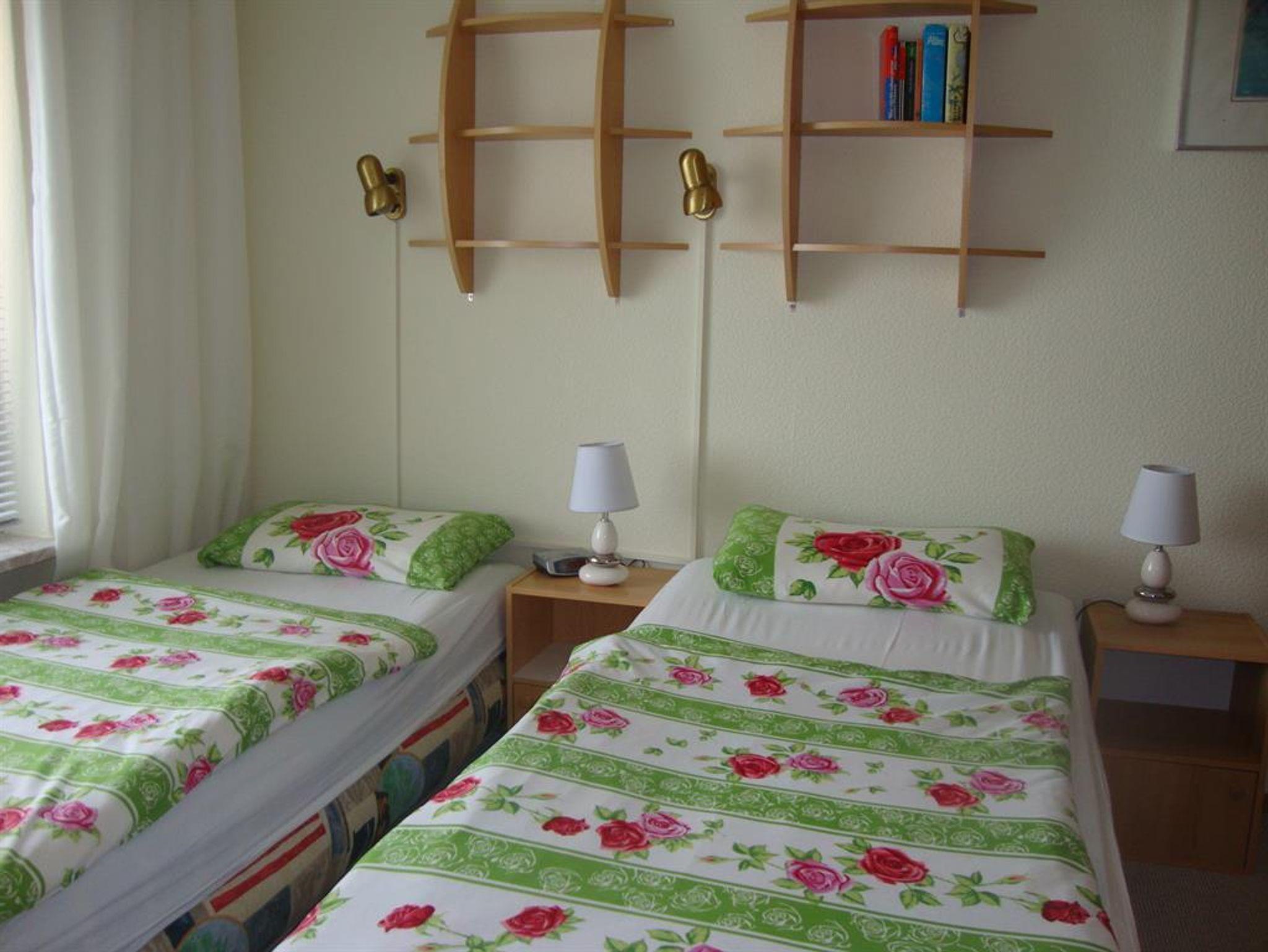Schlafzimmer mit Doppelbett, auch einzelnd stellbar mit Nachtschränke, Einbaukleiderschrank, Duschbad mit WC, Fön.