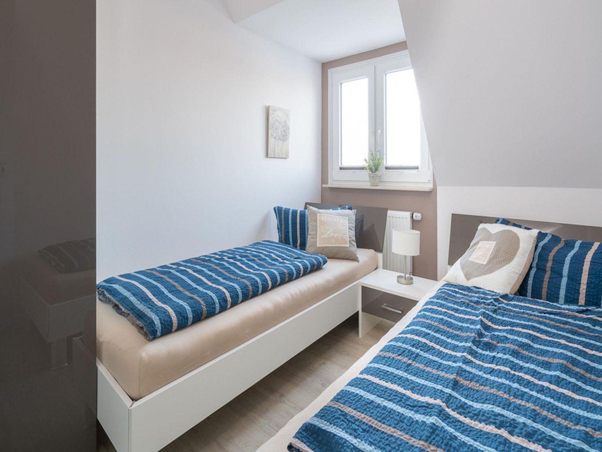 Der lichtdurchflutete Wohnraum mit einem Sofa und Sessel, einem TV und einem gemütlichen Essbereich bietet jeden Komfort. Die Küche, mit hochwertigen Geräten, grenzt direkt am Wohnzimmer an. Das Duschbad ist großzügig gestaltet und bietet genügend Platz für Ihre Utensilien. Die beiden Schlafzimmer, eines mit mit einem Doppelbett und ein weiteres mit 2 Einzelbetten, sorgen für ruhevolle Erholung.