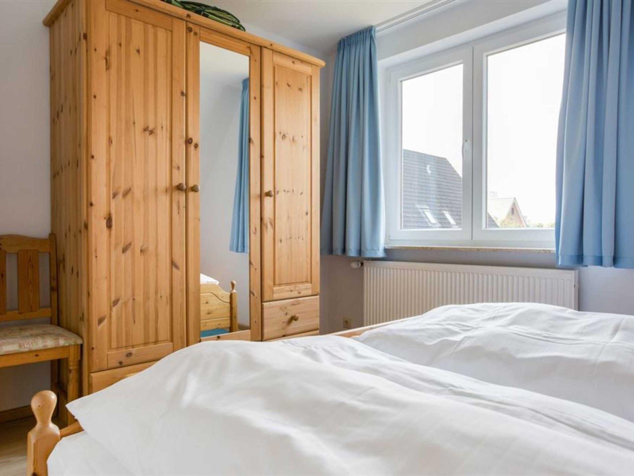 Schlafzimmer mit Doppelbett (2x 90x200cm), Stuhl und Kleiderschrank.