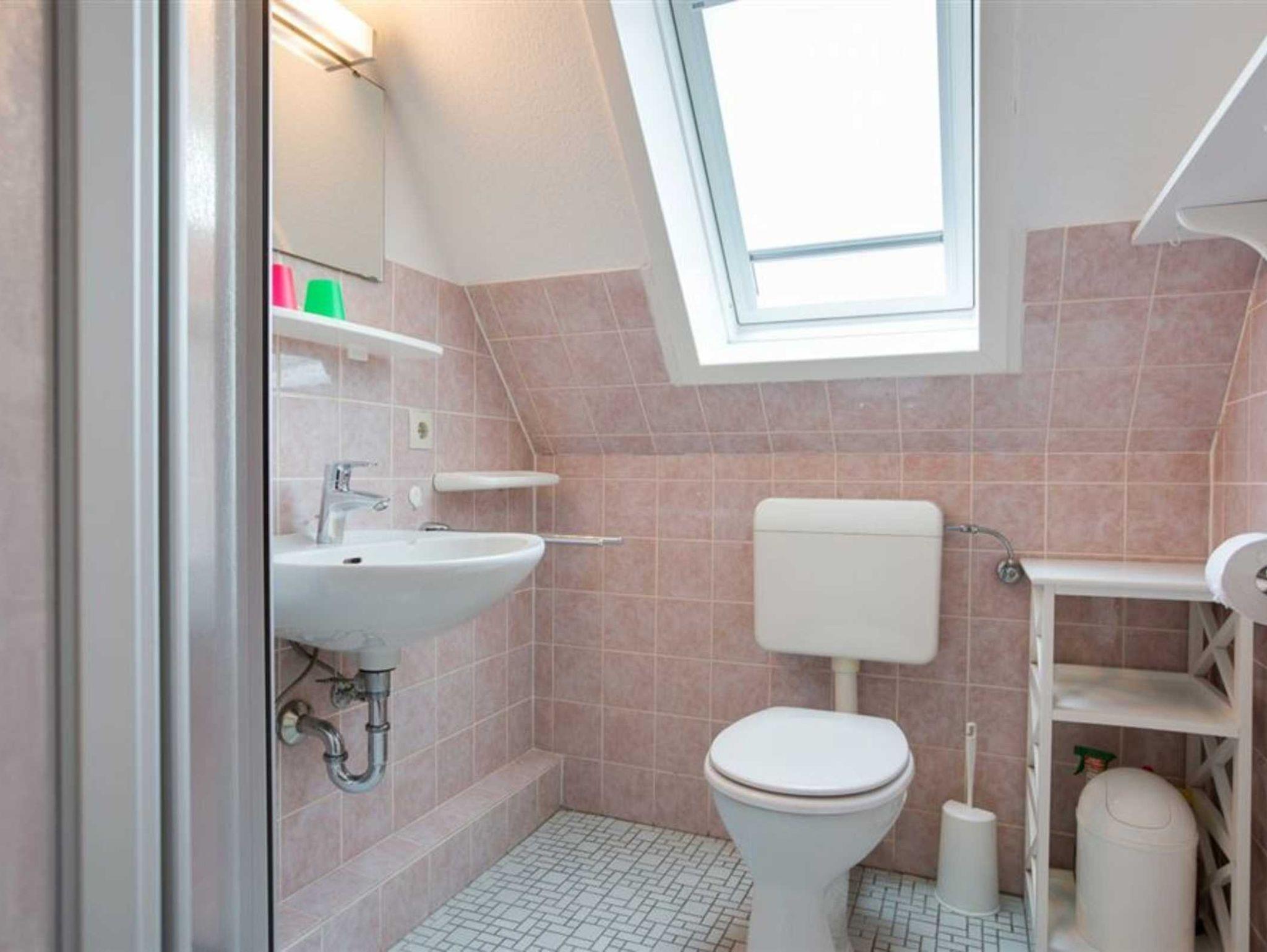 Badezimmer (Duschbad) mit Dusche, WC und Tageslicht. Kein Föhn.