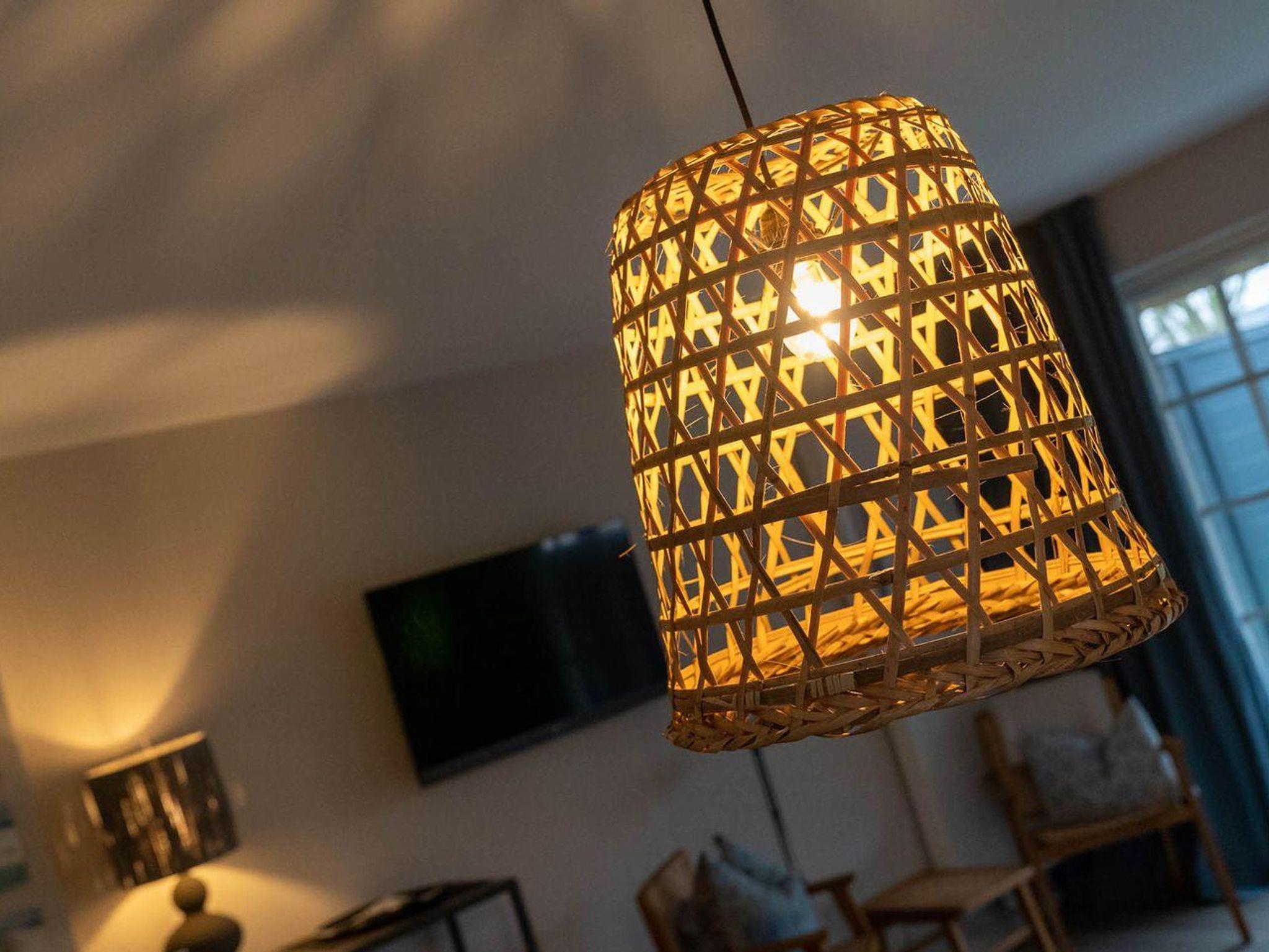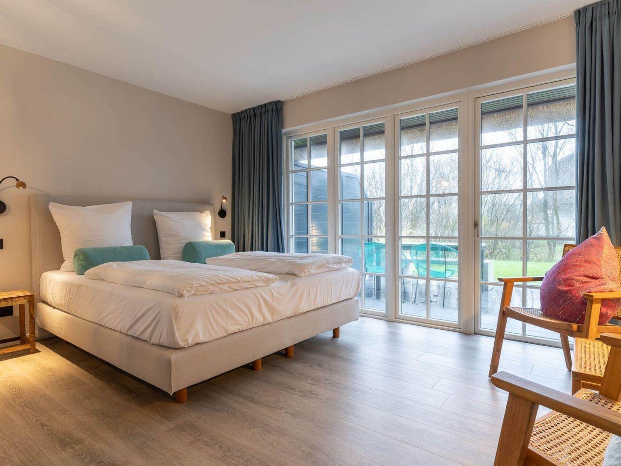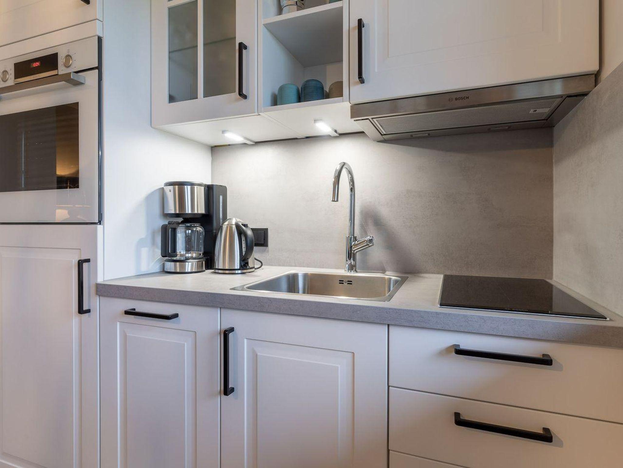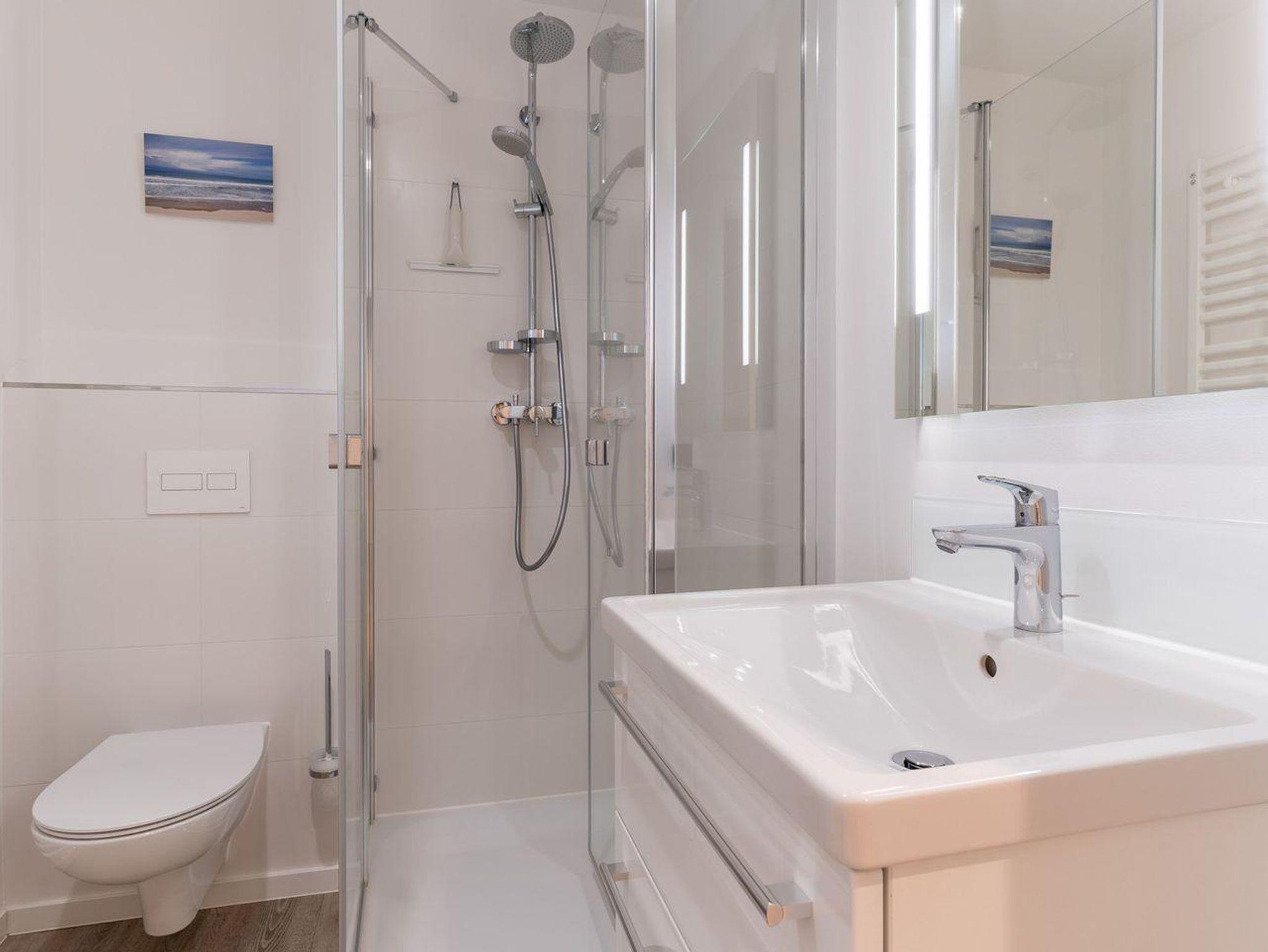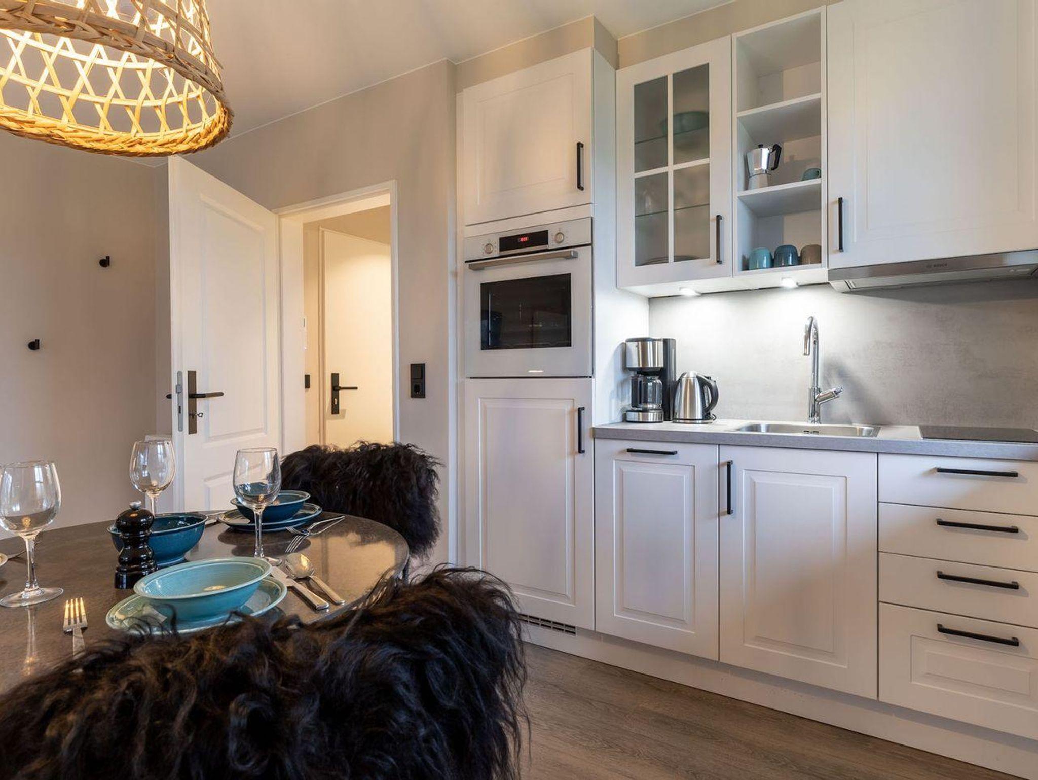Der lichtdurchflutete Wohnraum mit einer offenen Wohnküche und einem gemütlichen Essbereich bietet jeden Komfort. Eine Kochnische mit einer umfangreich ausgestatteten Pantryküche fügt sich passend ein und hat mit einem 2-Felder-Ceranfeld, Spülmaschine, Espressokocher, Kühlschrank samt Gefriermöglichkeit usw. so einiges zu bieten. Am Esstisch oder auf der möblierten, eigenen Süd-West Terrasse, lässt es sich mit frischen Brötchen vom nahegelegenen Bäcker wunderbar in den Urlaubstag starten. Der Blick in die gepflegte Grünanlage und auf das reetgedeckte Haus sind einfach herrlich und locken nach draußen. Am Abend erholen Sie sich im gemütlichen Doppelbett (180x200cm). Das moderne Bad mit Fenster verfügt über eine bodentiefe Regendusche, Handtuchheizung, Waschbecken und WC.