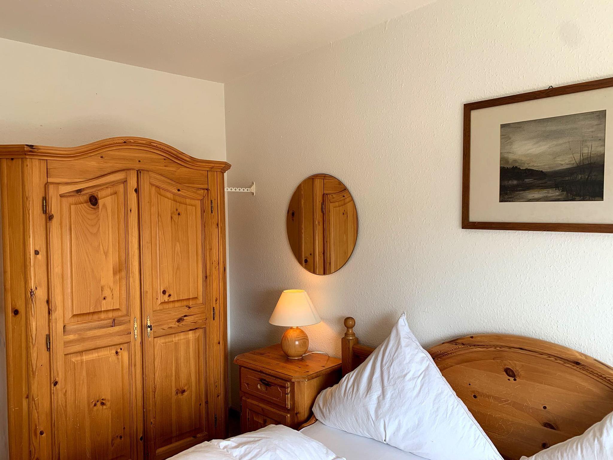 SchlafzimmerDoppelbett, 2 Nachttische, Schrank, Spiegel, Stuhl, Nachtspeicherofen