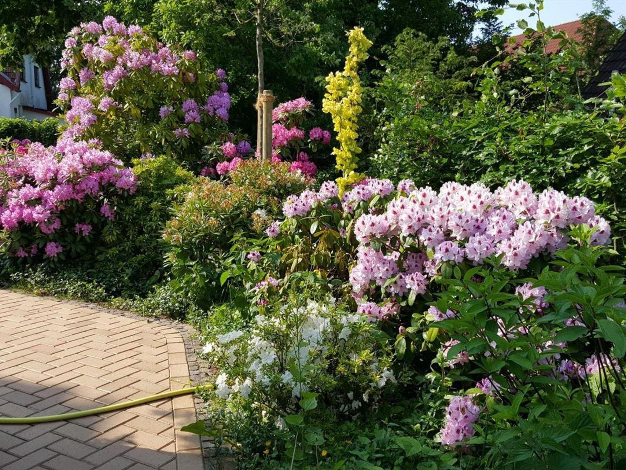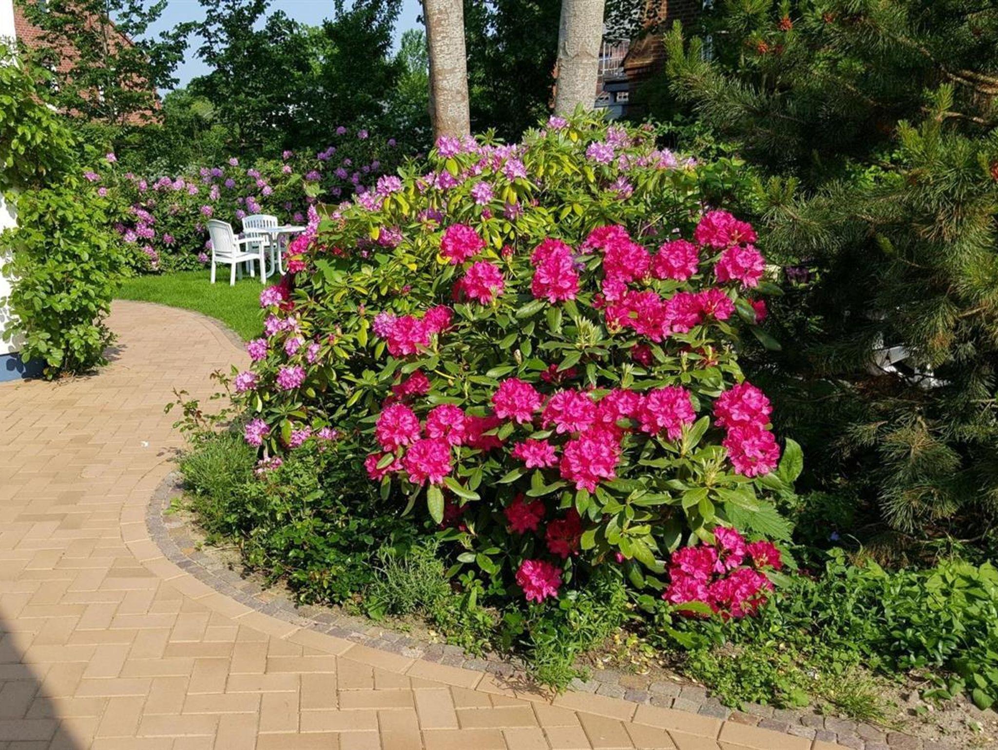 Ein hübscher von Bäumen, Rhododendronbüschen und Rosen eingerahmter Garten mit Liegen, Tischgruppen