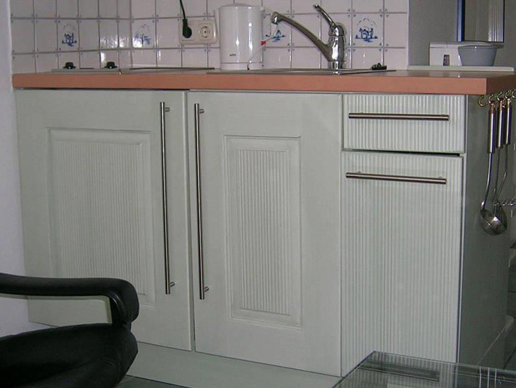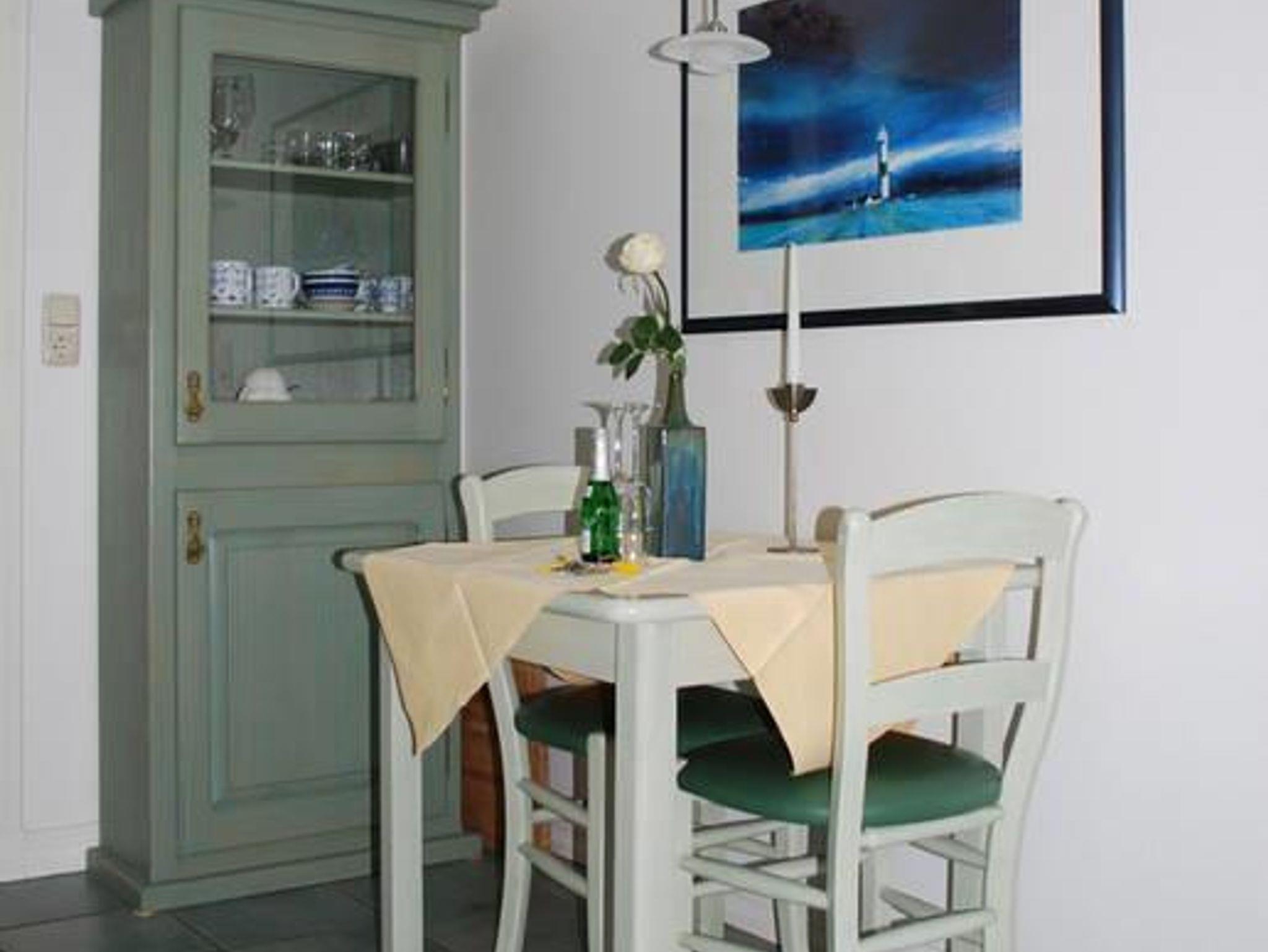 Die Wohnung Everschop ist stilvoll und individuell eingerichtet mit Ledercouch, bequemem Ledersessel und Glastisch sowie integrierter Küchenzeile mit Kühlschrank und 2-Plattenherd, die mit einer grün lasierten Holzfront verkleidet ist. Auf einem Bord oberhalb steht eine zusätzliche Mikrowelle. Kaffeemaschine, Toaster und Mixer sind vorhanden. Farblich passend hierzu sind eine Vitrine aus Massivholz für das Porzellan und die Gläser und die Essgruppe. Ein großes Sprossenfenster nach Osten lässt die Morgensonne ein. Vom Wohnraum führt eine Tür zum Schlafraum mit Doppelbett (1,8 x 2,0 m) und von dort in das Duschbad (mit Föhn).