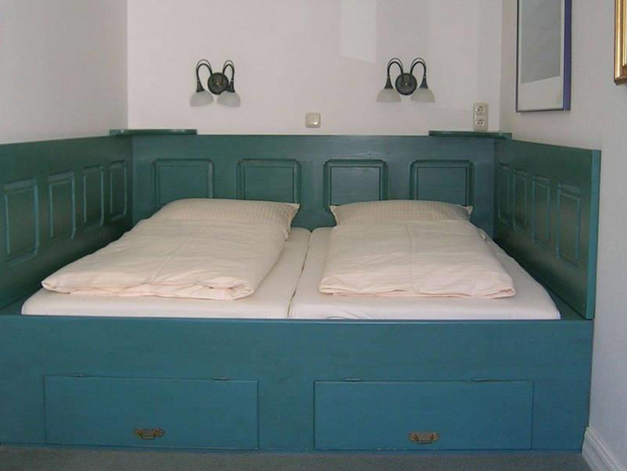 Das mit blau lasiertem Holzpanel eingerahmte Doppelbett ist besonders bei jungen Leuten sehr beliebt. Die Wohnung ist mit gebührenfreiem Telefon, Internetzugang (WLAN), großem Flachbild-Fernseher und Stereoanlage ausgestattet.