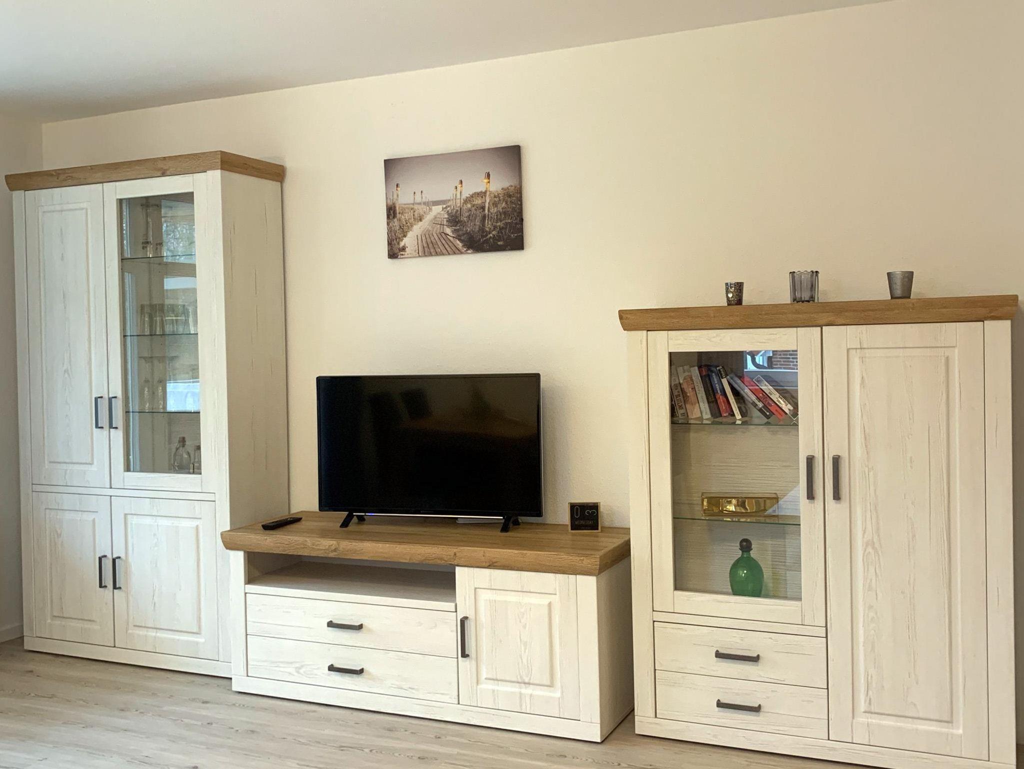 Wohnzimmer: 1 Schlafcouch, Couchtisch, Esstisch, 4 Stühle, 2 Hochschränke, 1 Sideboard, Kabel-TV