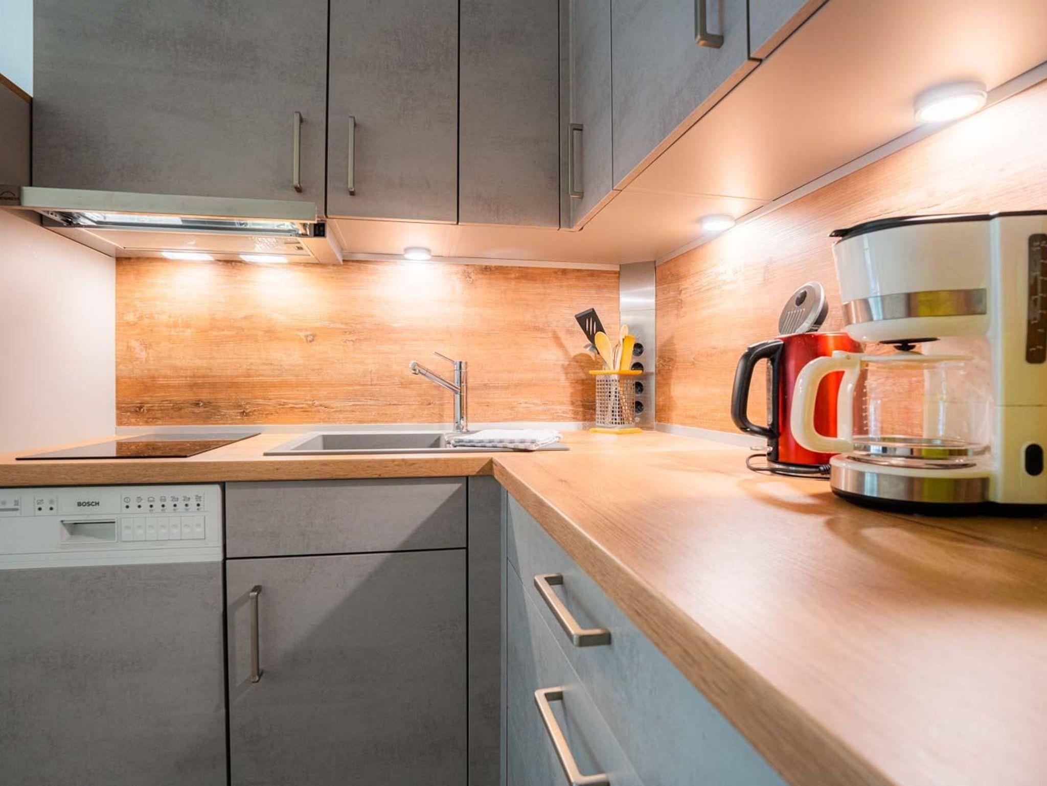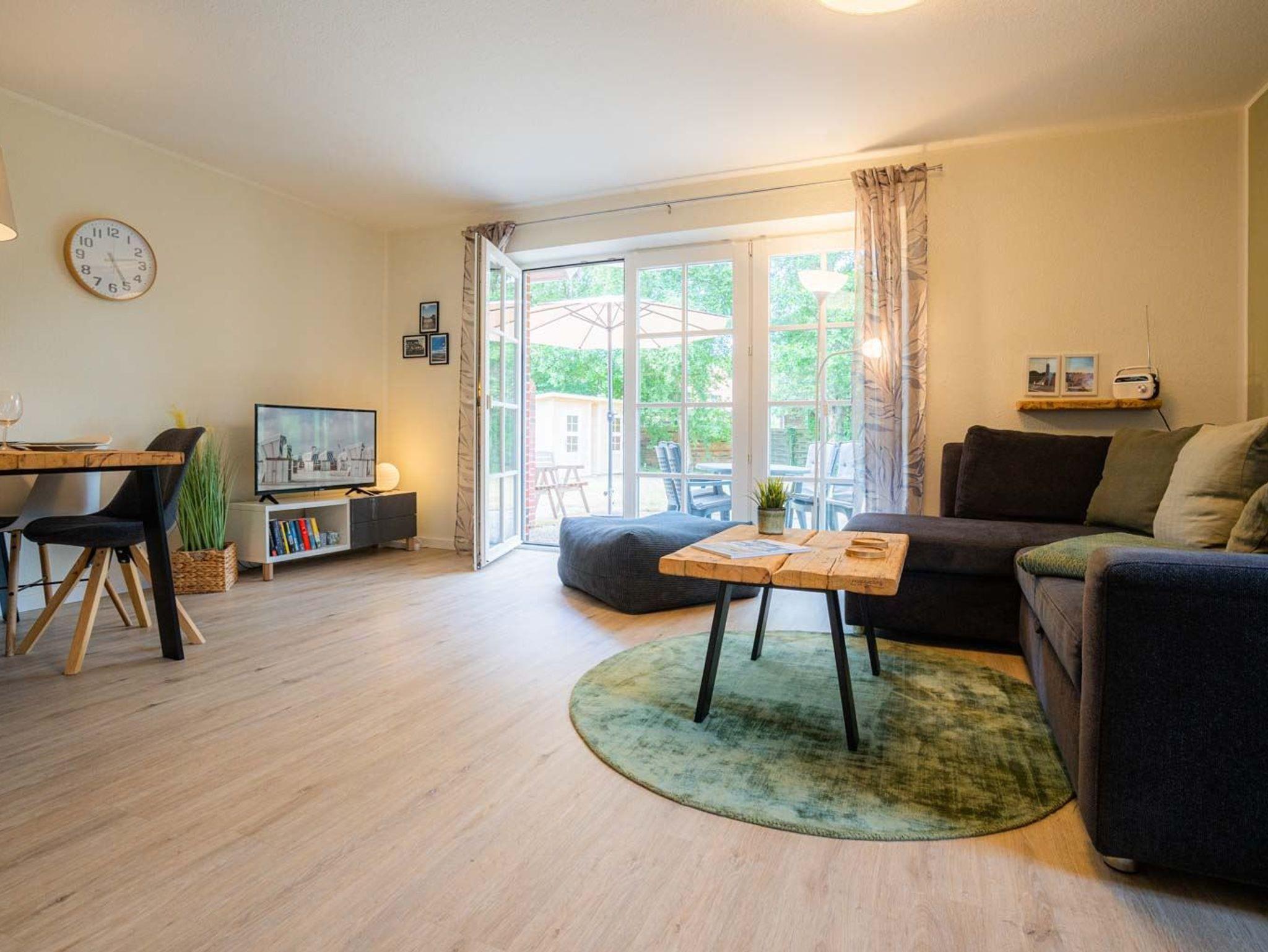 Wohnzimmer mit (ausklappbarem Schlaf-) Sofa (120x190cm), TV (Kabel), Radio mit CD-Player und Esstisch mit 4 Stühlen. Offene Küche mit Backofen, Geschirrspülmaschine und Kühlschrank mit Gefrierfach. Direkter Zugang zur möblierten Garten-Terrasse nach Westen.
