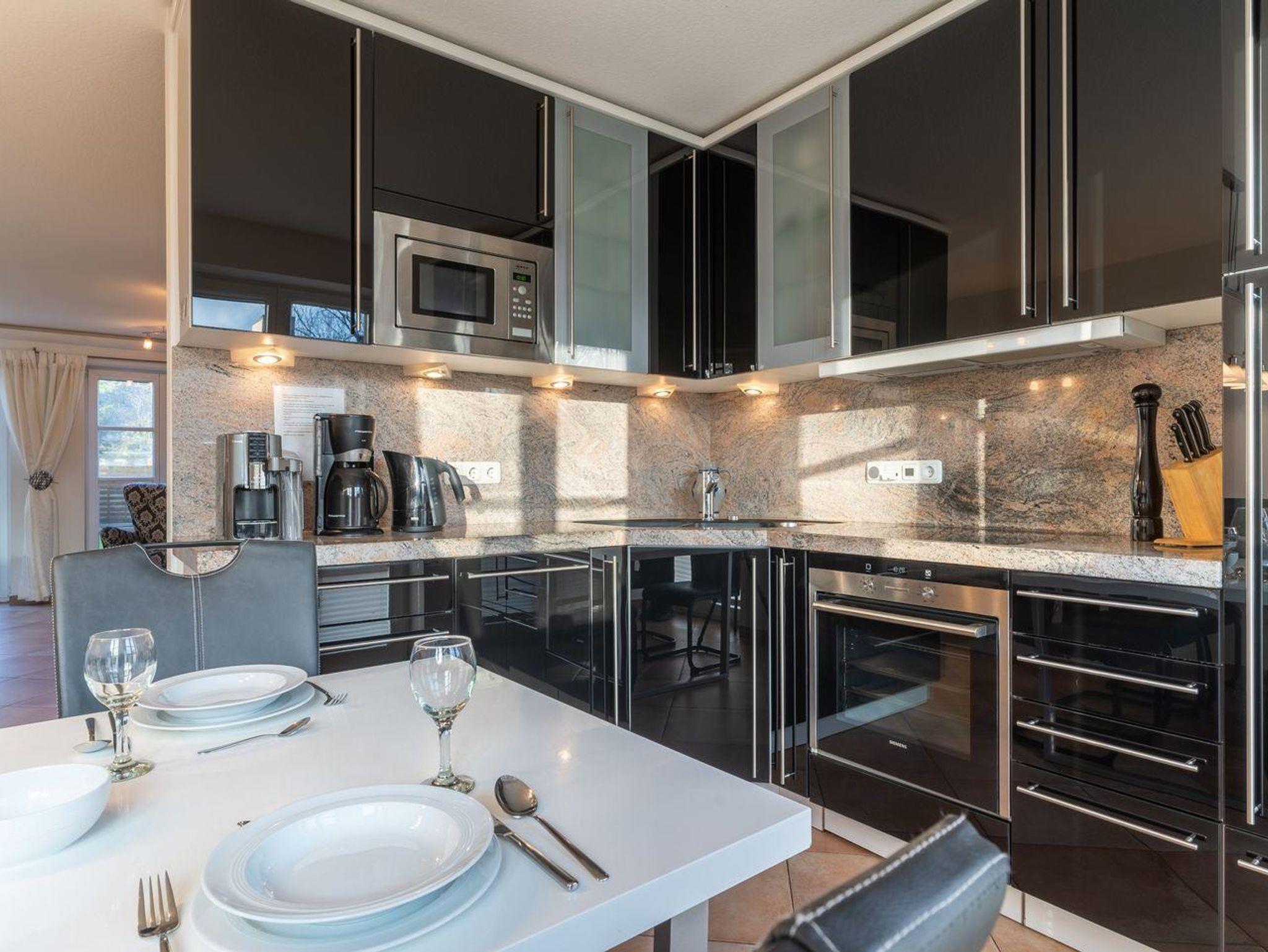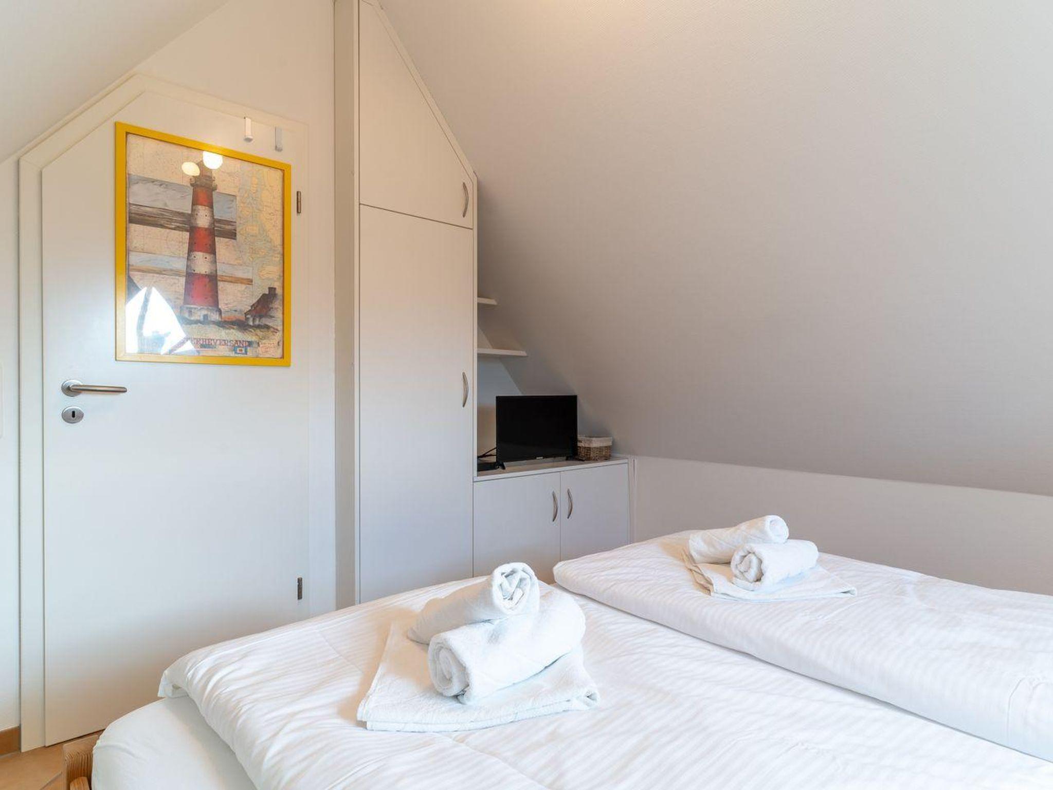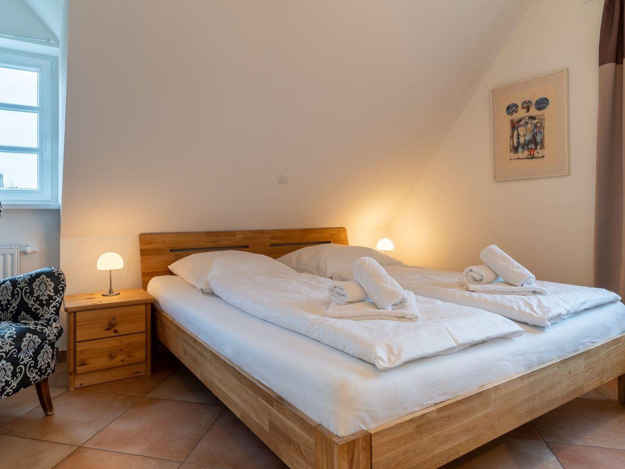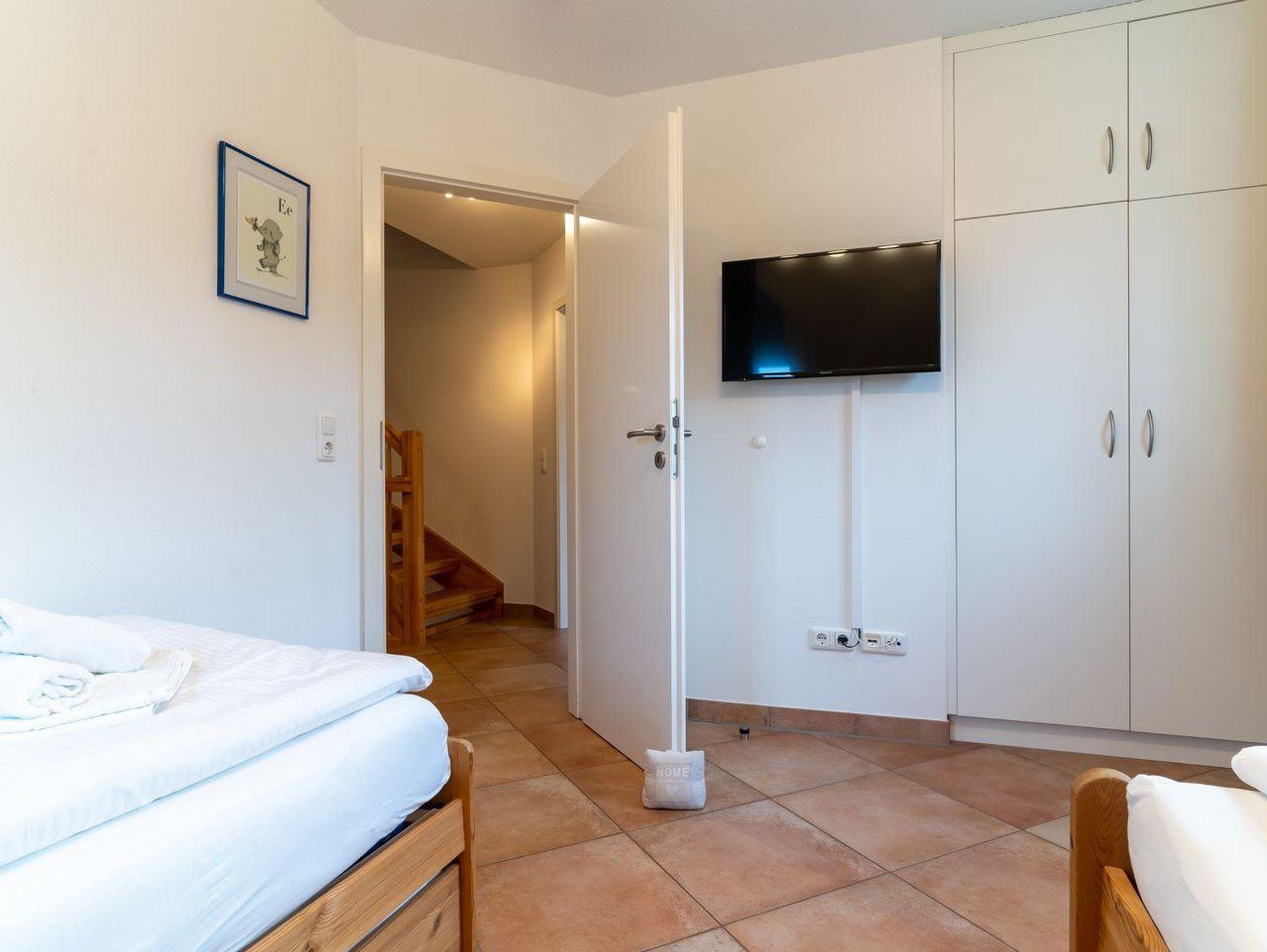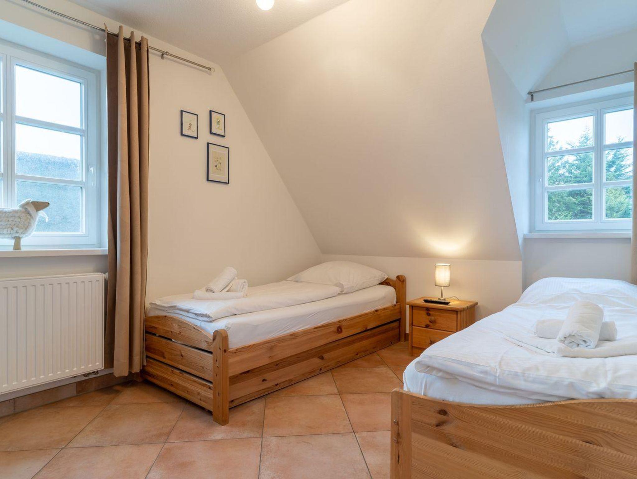 Eine elegante hölzerne Treppe führt Sie ins 1. Obergeschoss, wo zwei der insgesamt drei Schlafzimmer auf Sie warten. Das erste Schlafzimmer ist mit einem komfortablen Doppelbett (180x200 cm), einem zusätzlichen Fernseher und einem praktischen Einbauschrank ausgestattet. Im zweiten Schlafzimmer finden Sie zwei Einzelbetten (90x200 cm), ebenfalls mit Fernseher und Einbauschrank. Das Dachgeschoss bietet zwei weitere gemütliche Schlafplätze in zusammengestellten Einzelbetten (2x90x200 cm).