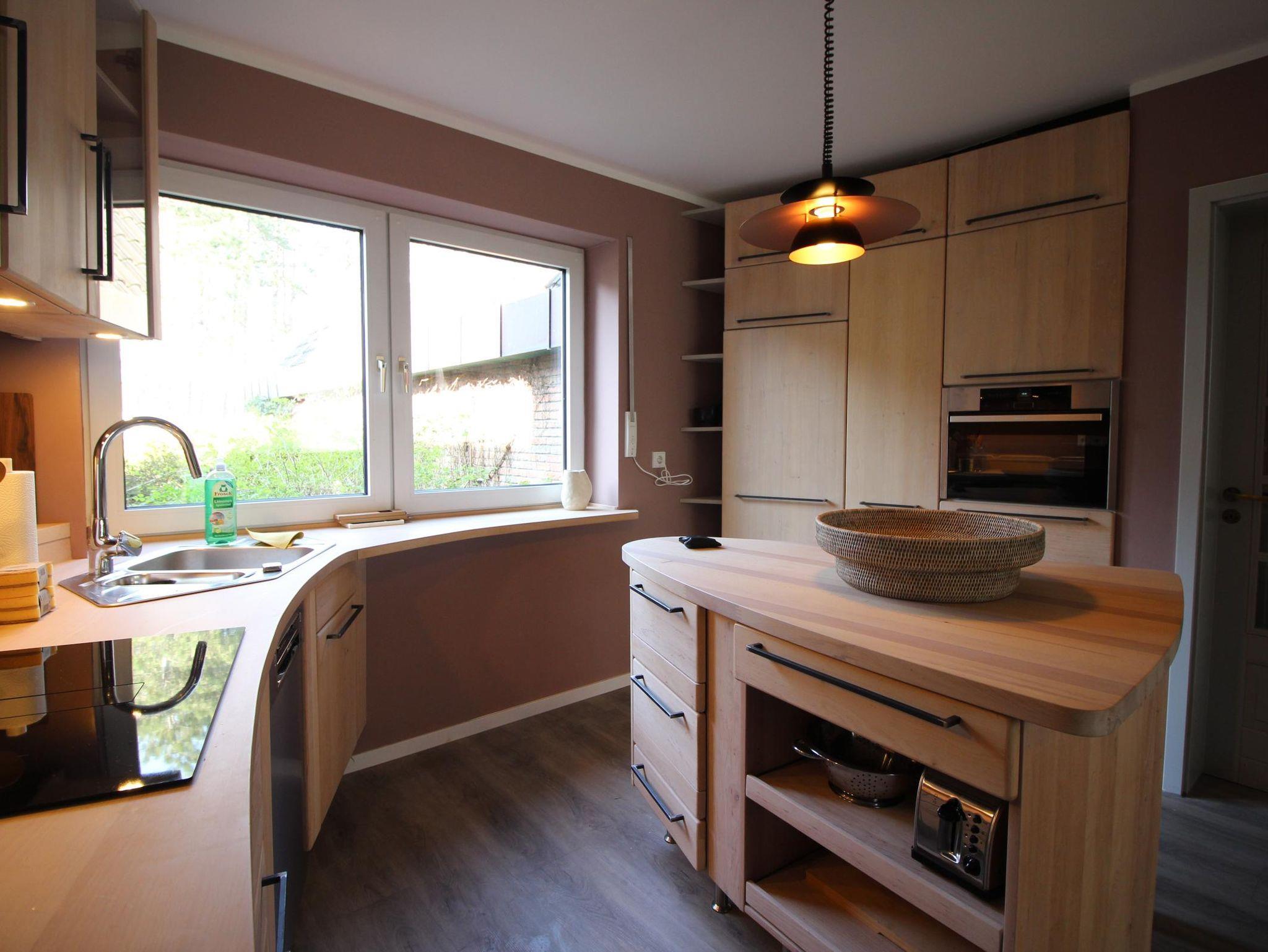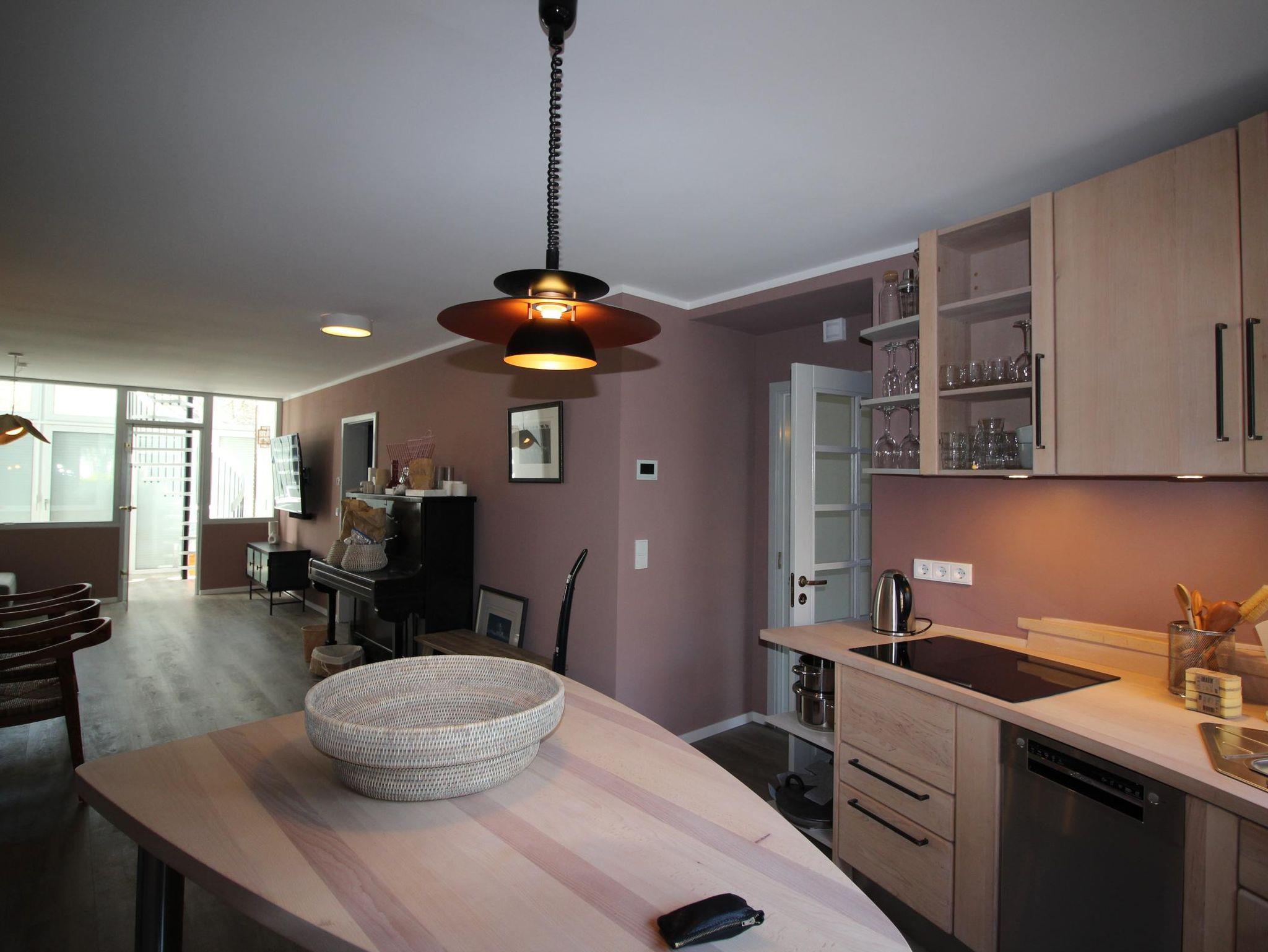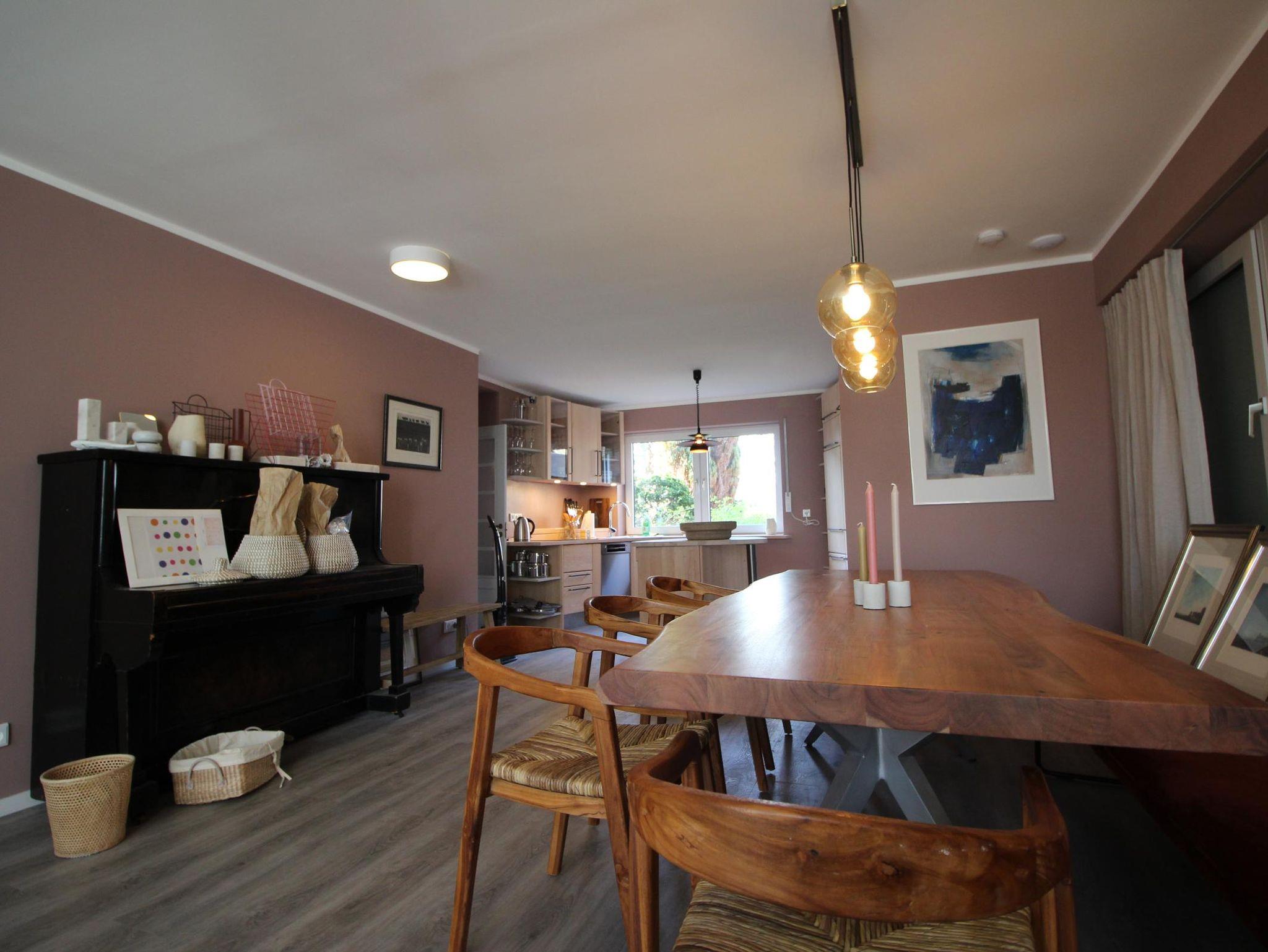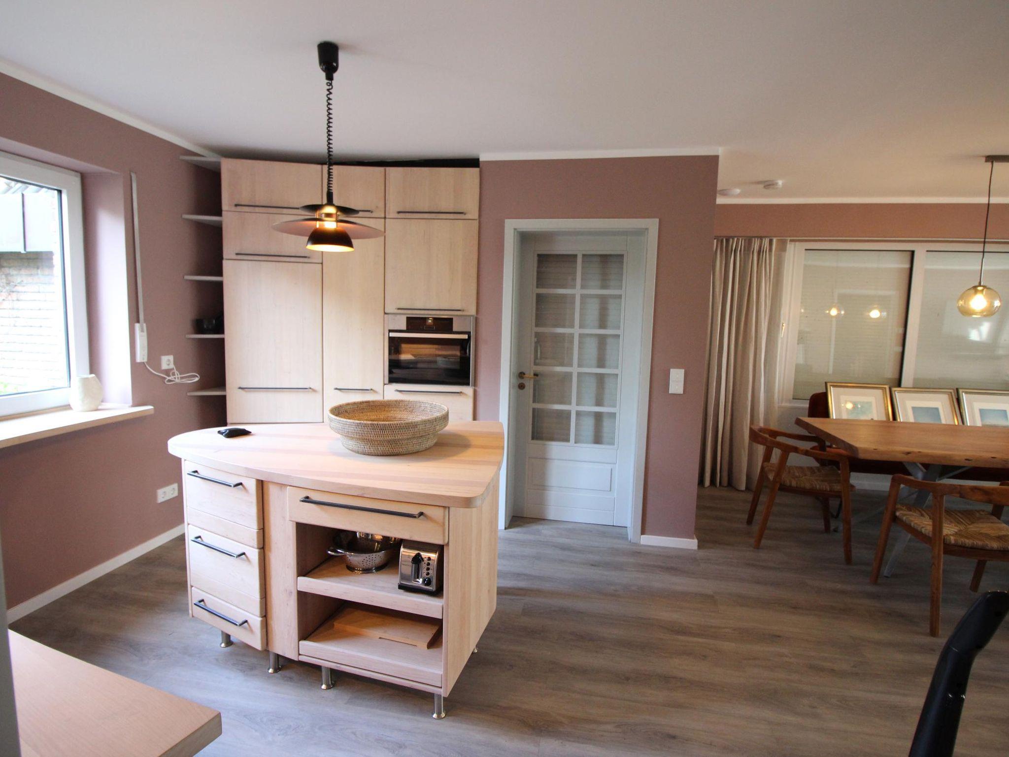 Vom Autounterstand mit Elektrolademöglichkeit durch den kleinen, gemütlichen Vorgarten, der auch als natürlicher Sichtschutz dient, wird man bei seiner Ankunft gleich von der gesunden Salzluft und dem ruhigen Ambiente in Empfang genommen. Nach Eintritt in das nachhaltig geplante und ausgestattete Haus gelangt man zuerst in den Hausflur mit einer handgefertigten Garderobe, einem Gäste-WC und dem Treppenaufgang in die 1. Etage. Links befindet sich die Tür zur gemütlichen Küche mit restaurierten Holzelementen und einer neuen und modernen Kochinsel. Mit voller Ausstattung versehen, lässt es sich hier den Urlaub über hervorragend als Selbstversorger – auch für große Familien und Freunde – aushalten. Neben der Küche liegt der ebenfalls von außen erreichbare Hauswirtschaftsraum (für z.B. feuchte Strandkleidung) inkl. Waschmaschine und Trockner.