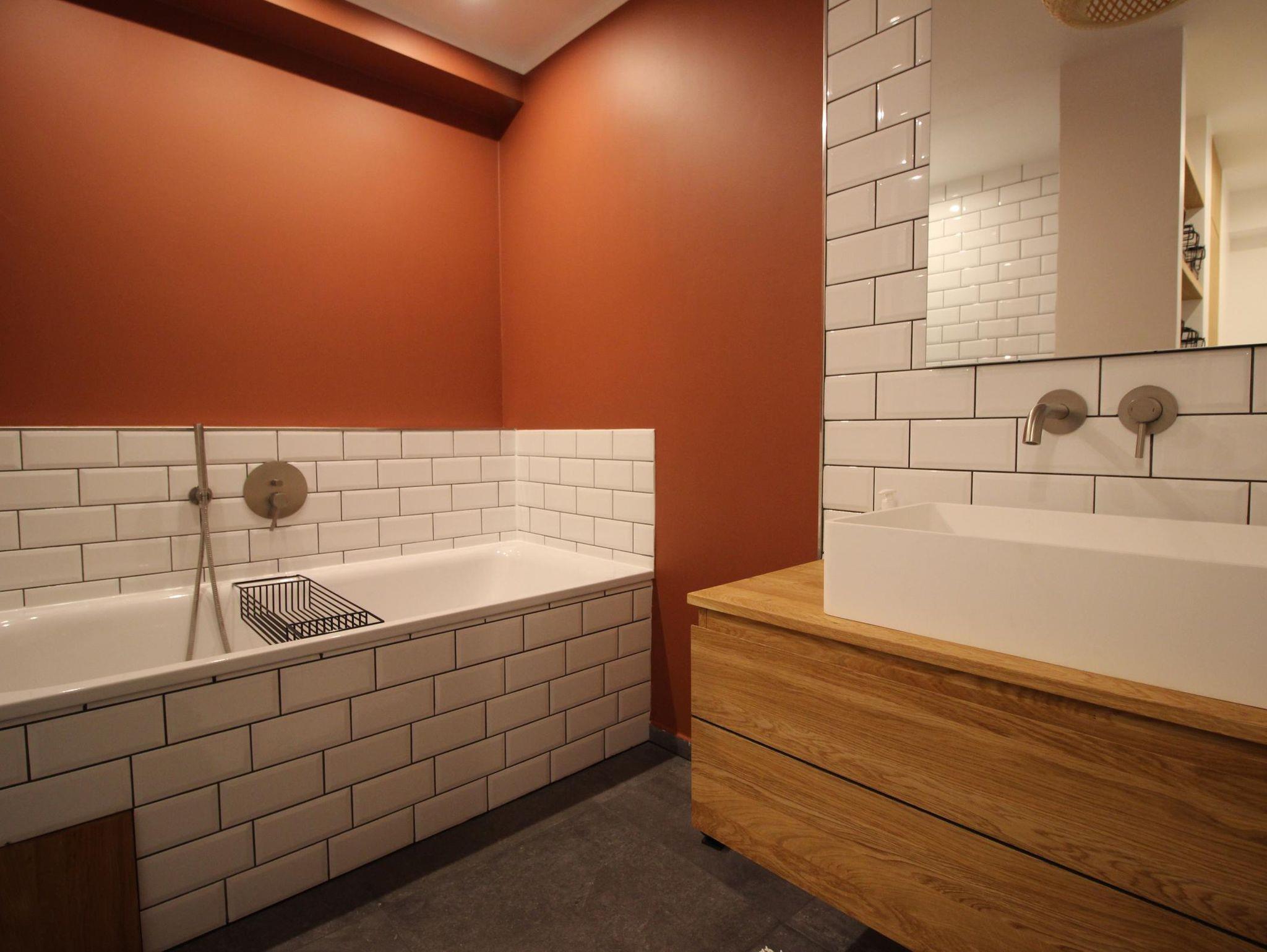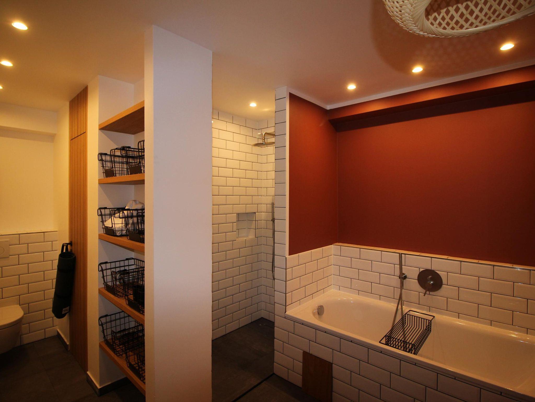 Im EG befindet sich ein großer und heller Wohn/Ess/Kochbereich zum geselligen Beisammensein – in Anlehnung an die immer gastlichen Strandsegler:innen, die den gemeinsamen Sport stets mit einem Snack und guten Getränken ausklingen lassen. Außerdem findet sich im EG ein Schlafzimmer mit komfortablem Doppelbett und dem angrenzenden völlig neu geplanten Bad mit Dusche sowie Badewanne. Hier fallen v.a. kleine Details wie der handgefertigte Waschtisch aus Holz und die sorgsam ausgewählte Farbgestaltung ins Auge, die Wärme und Behaglichkeit ausstrahlen.