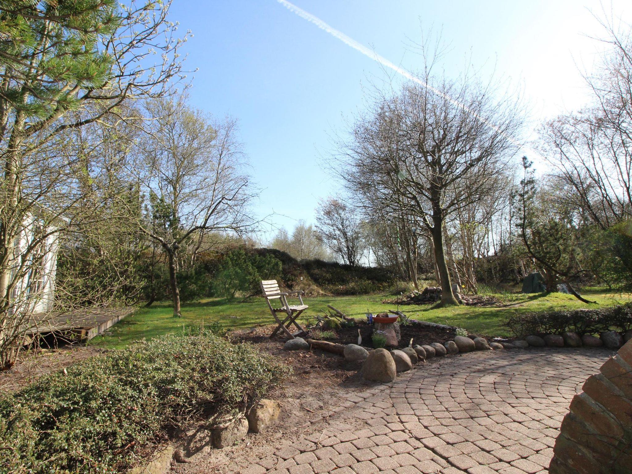 Hinterm Haus befindet sich eine möblierte Terrasse mit Markiese, eine große Gartenfläche mit angrenzender Dünenlandschaft.