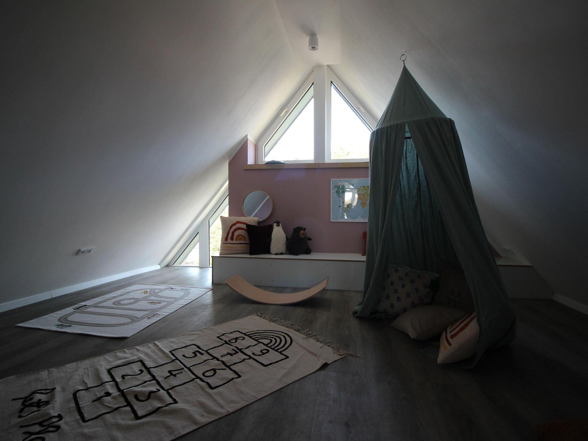 Für die Kleinen gibt es im Dachgeschoss ein eigenes Spielzimmer. Dieses ist über eine Wendeltreppe und – ein weiteres Highlight des Hauses – über einen freischwebenden Steg erreichbar. Auch eine Rückzugsmöglichkeit für die Großen ist unter dem Dach angesiedelt und bietet einen Ort der Entspannung mit Lounge Kissen und Leseecke sowie TV.