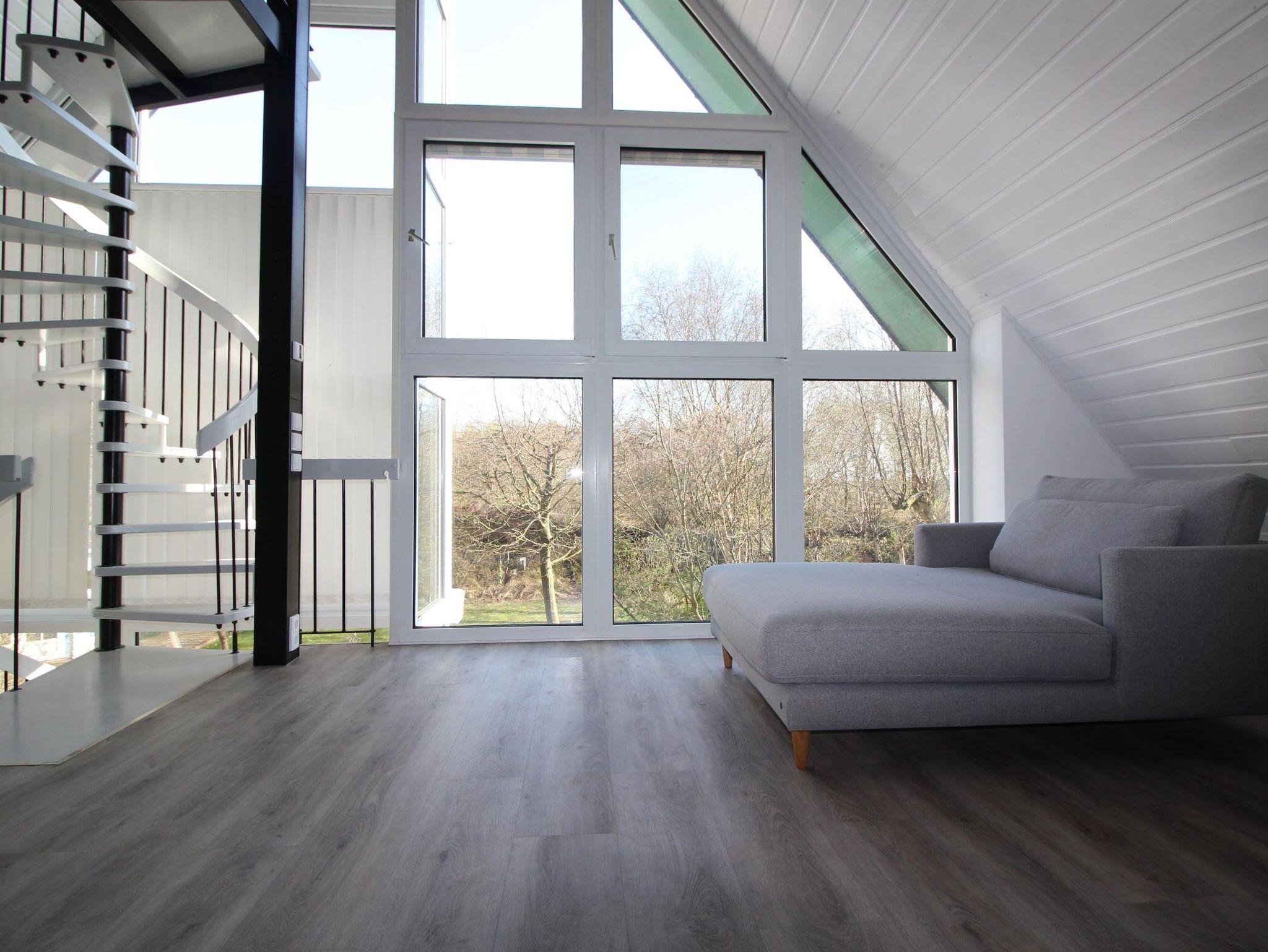 Die Rückwand des Hauses ist komplett aus Glas und garantiert damit einen sonnendurchfluteten Aufenthalt sowie einen grandiosen Ausblick auf die weite Dünenlandschaft (Naturschutzgebiet) hinter dem Haus. Hat man dann das Herzstück der Wohnung, das 1. Obergeschoss, erreicht, empfängt einen eine absolute Wohlfühloase mit großzügiger Lounge Sitzfläche, Kamin und bequemen Sesseln, die zur absoluten Entspannung oder zu einem gemütlichen Abend einladen. Angrenzend hierzu befindet sich ein weiteres Schlafzimmer und ein Duschbad.