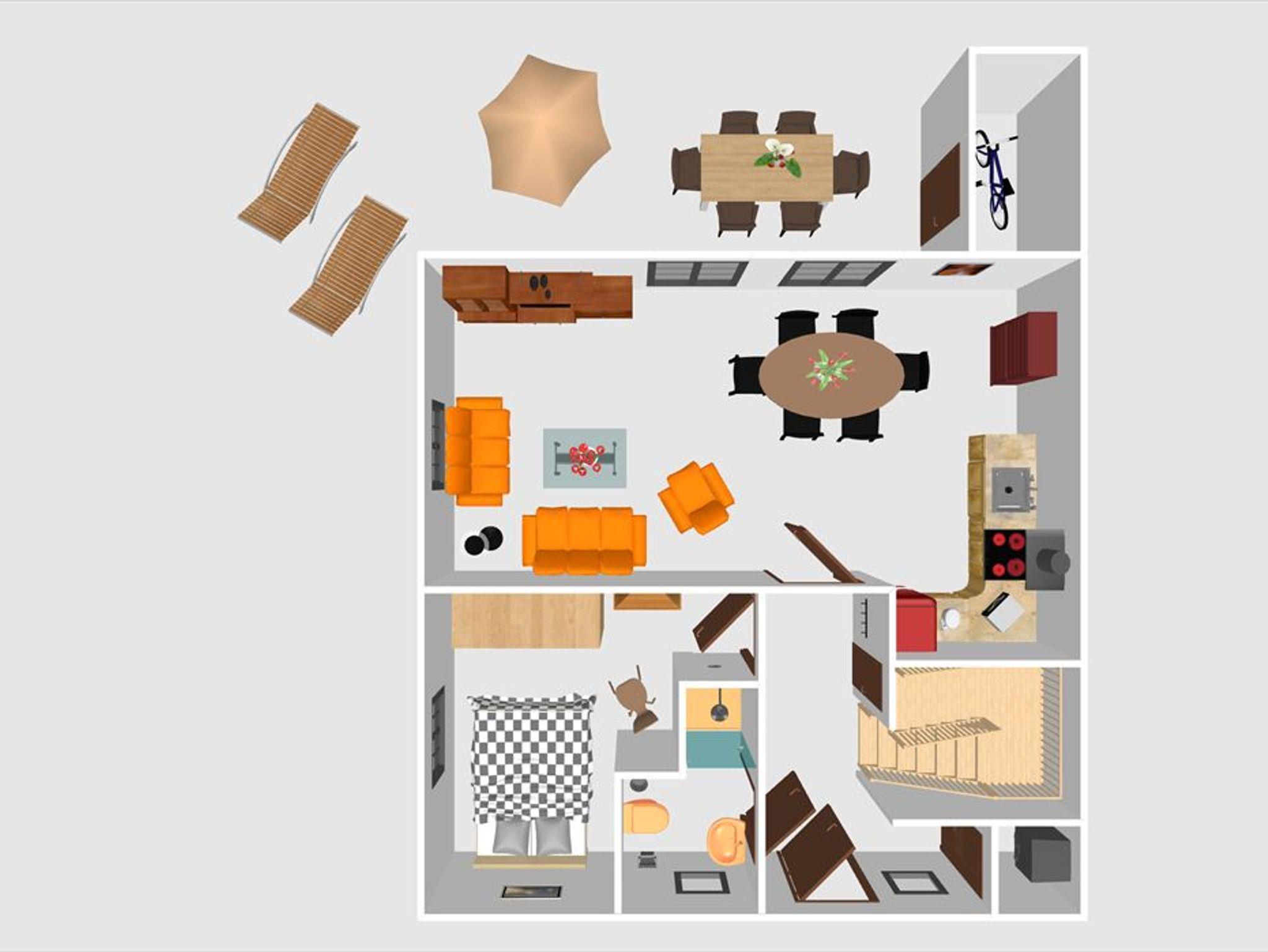 Im Obergeschoss befindet sich ein Schlafzimmer mit zwei Einzelbetten (90x200) sowie ein weiteres Schlafzimmer mit einem Doppelbett (180x200). Beide Zimmer sind mit einem Flatscreen-TV ausgestattet.