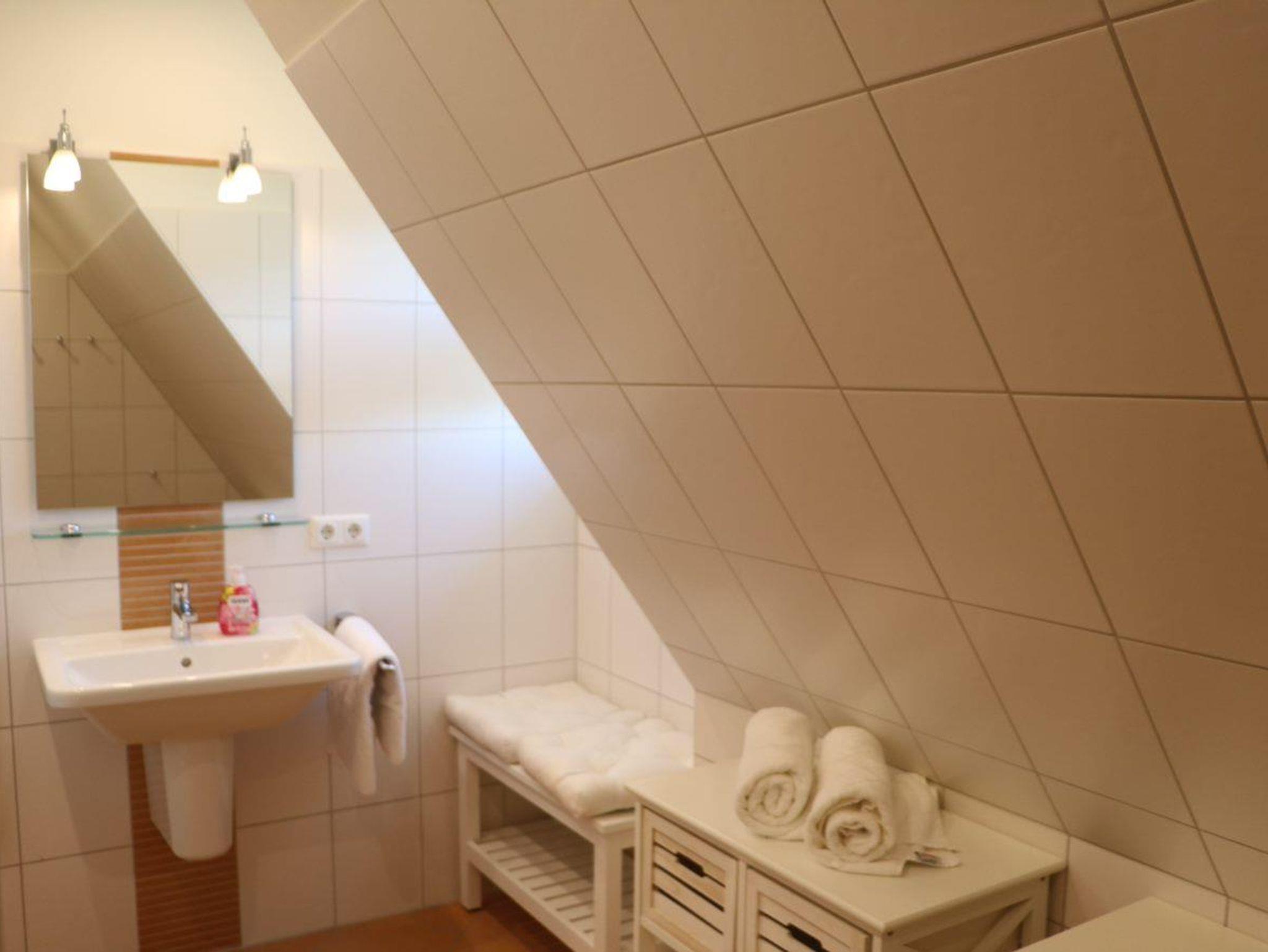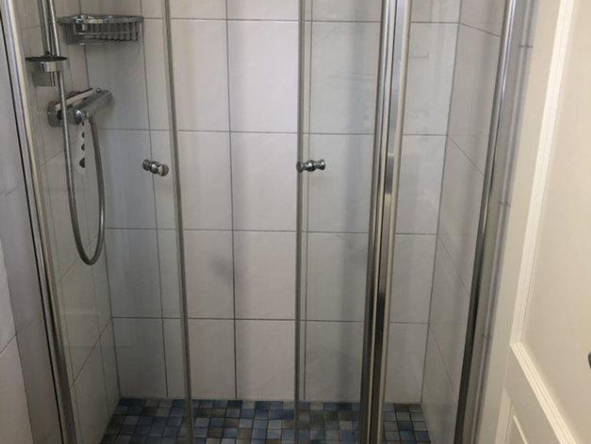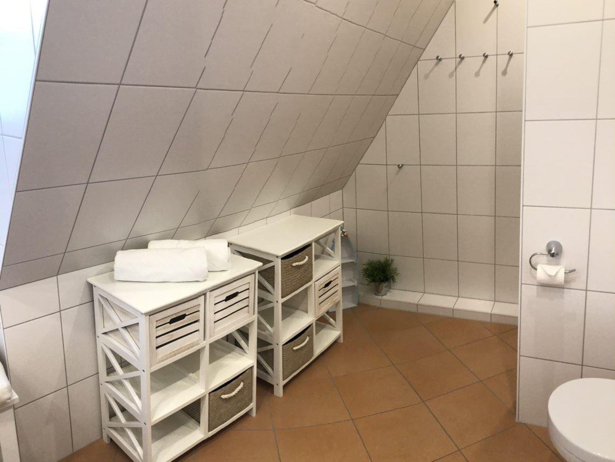 Das Duschbad wird per Handtuchheizkörper sowie einer Fußbodenerwärmung beheizt. Die Dusche verfügt über einen niedrigen Einstieg.