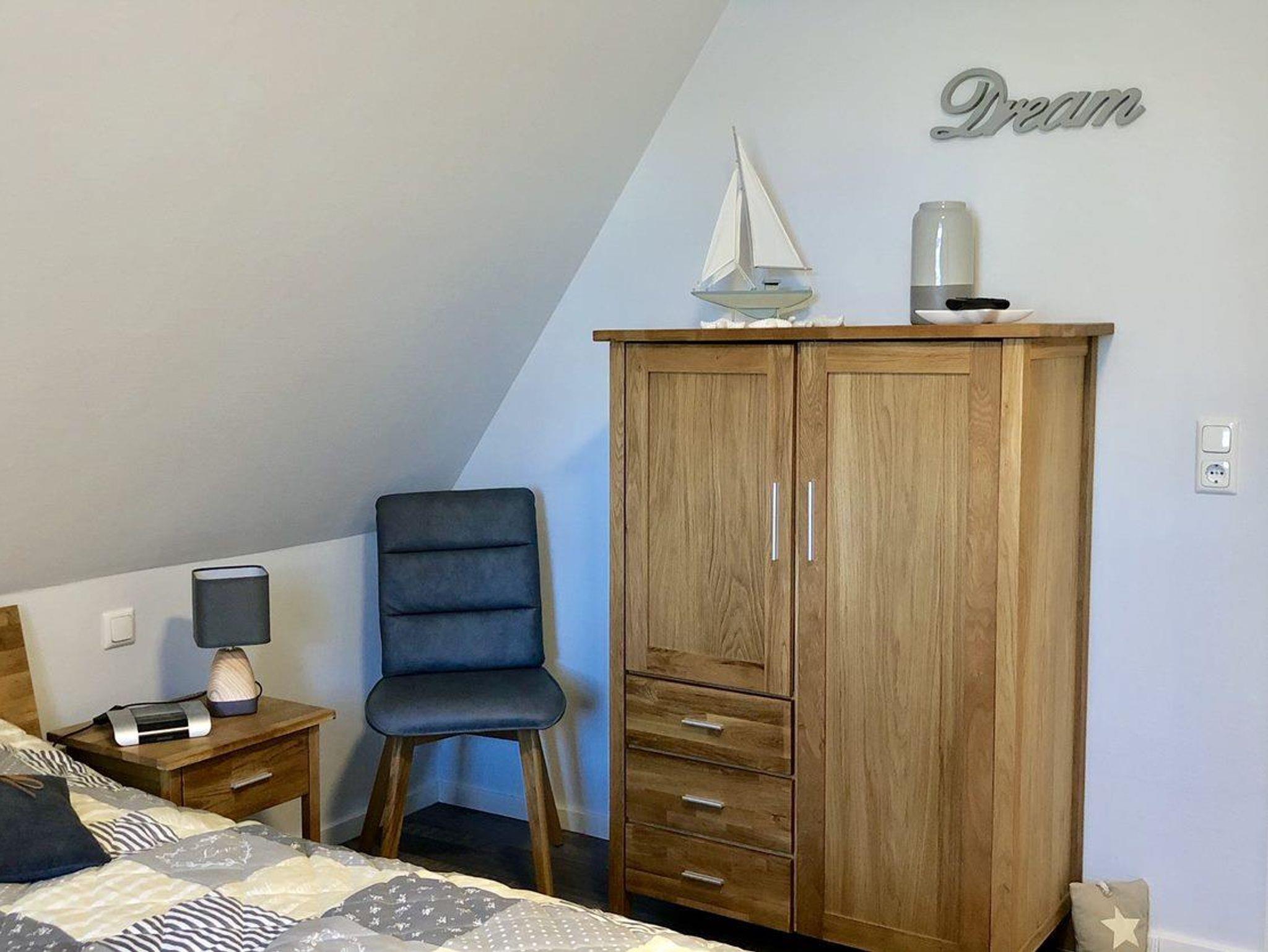 Das Schlafzimmer im Erdgeschoss ist mit einem Boxspringbett (160x200), einem Kleiderschrank, einer Schrankkommode sowie einem Nachttisch ausgestattet ist.