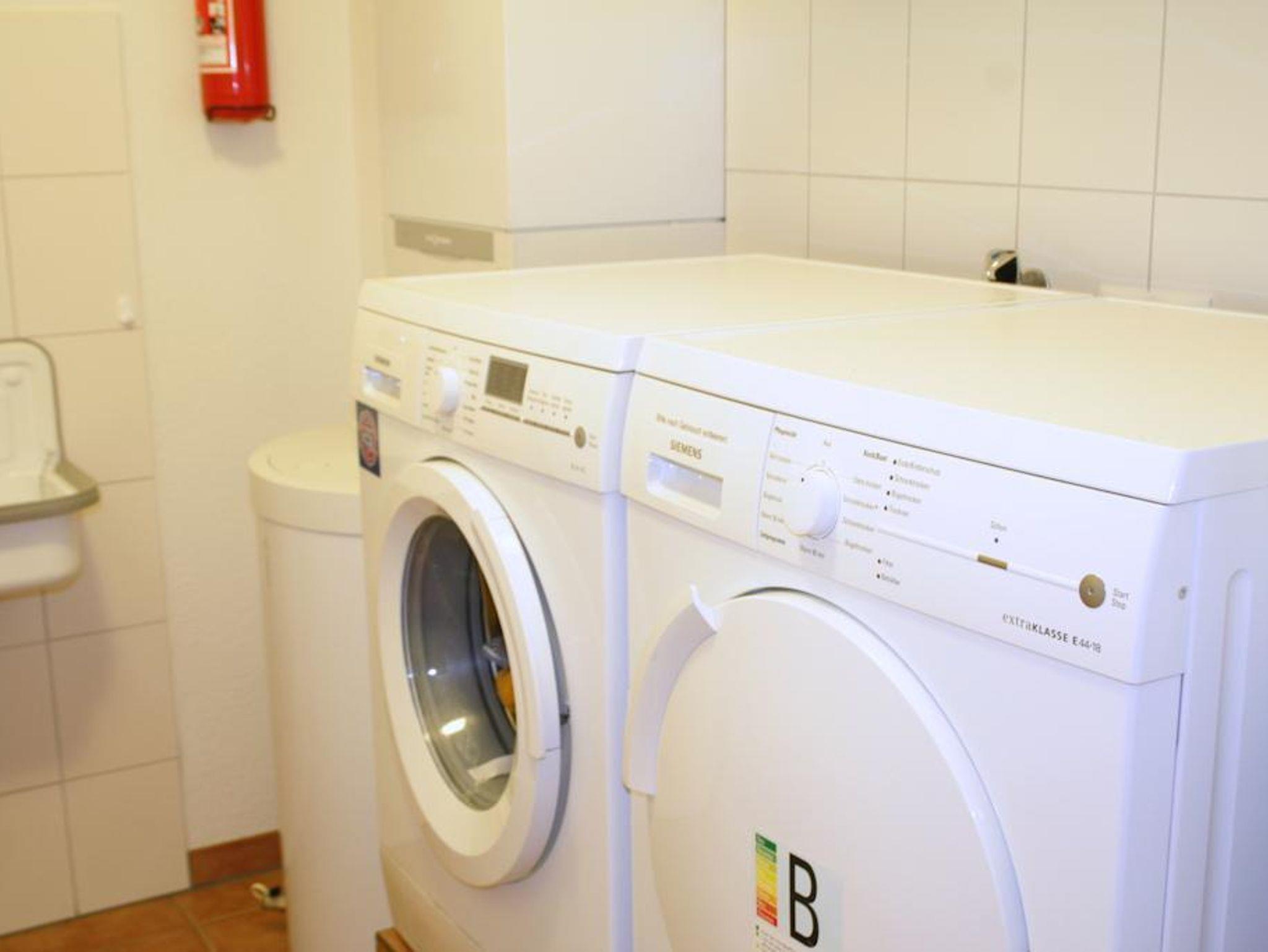 Im gefliesten Hauswirtschaftsraum finden Sie Waschmaschine und Trockner.