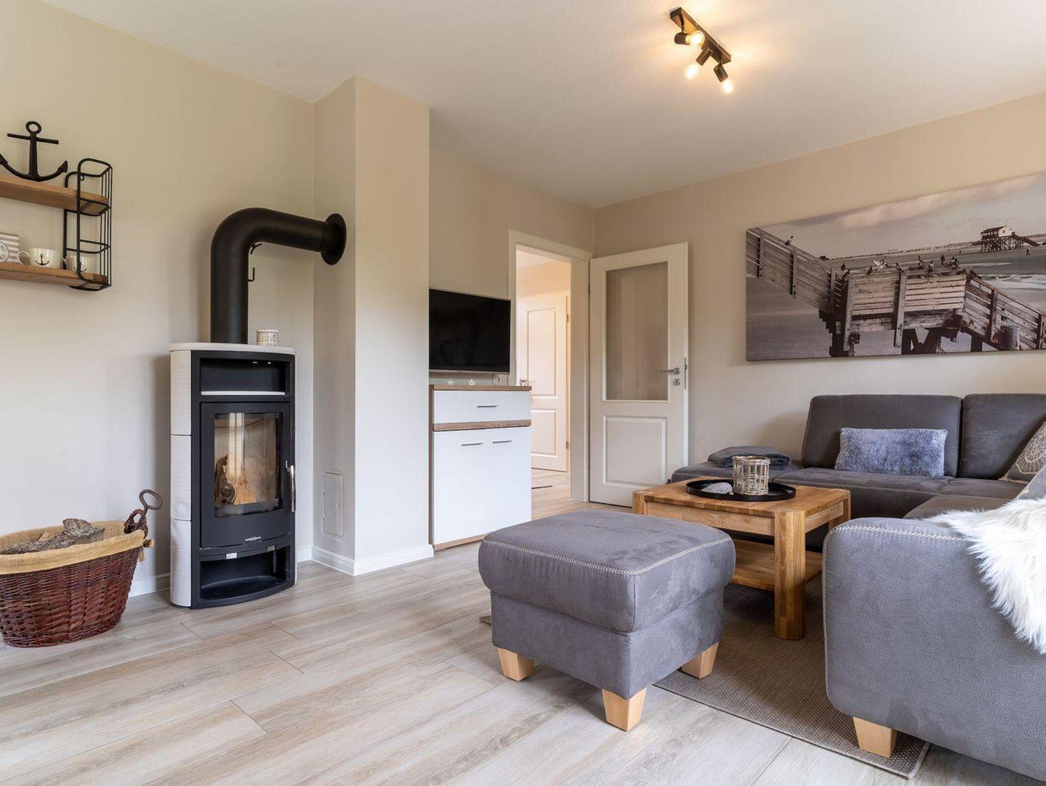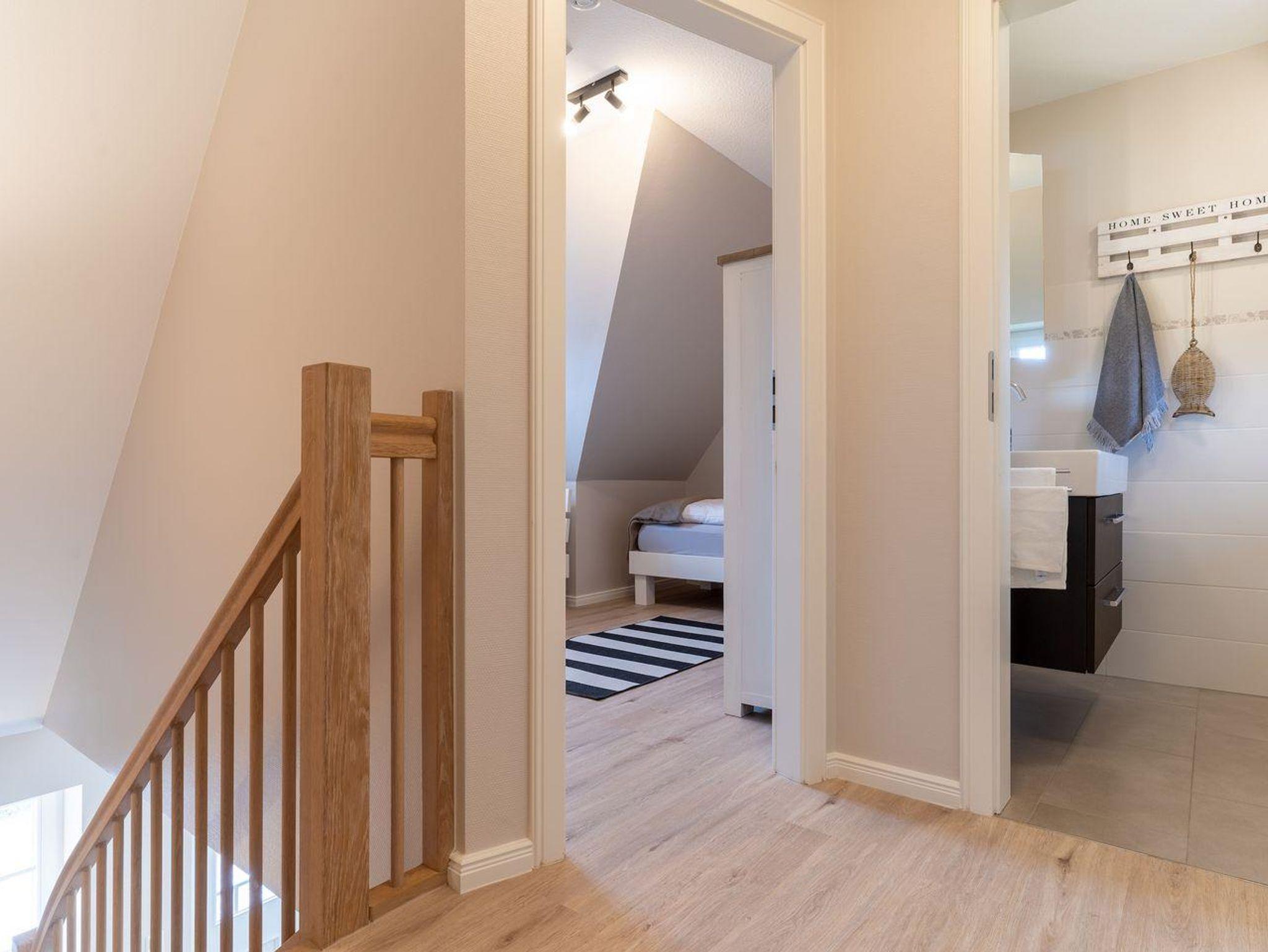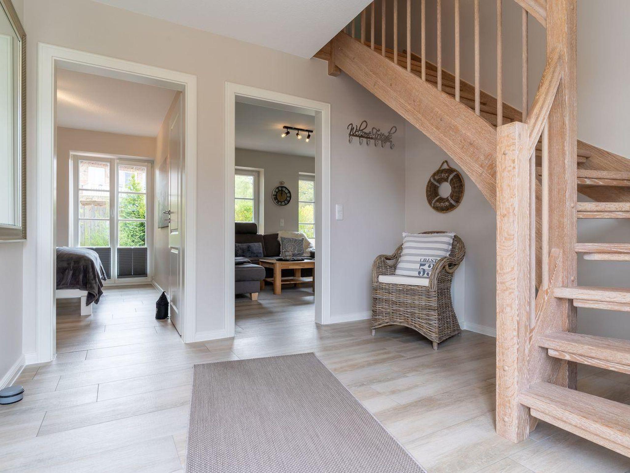 Im Erdgeschoss befindet sich ein lichtdurchflutetes Wohnzimmer mit einem Kamin, einer offenen Küche sowie einem Essbereich. Die Küche verfügt über hochwertige Elektrogeräte und bietet genügend Platz zum gemeinsamen Kochen. Im Erdgeschoss ist ebenso ein großer Flur, ein Duschbad und ein Doppelschlafzimmer mit Zugang auf die Terrasse. Über eine Holztreppe im Flur gelangt man in das Obergeschoss mit zwei Schlafzimmern. Ein Schlafzimmer ist mit einem Doppelbett ausgestattet und bietet jeden Komfort. Darüber hinaus befindet sich im Obergeschoss ein weiteres Schlafzimmer mit zwei Einzelbetten und einem TV. Außerdem ist im Obergeschoss ein weiteres Duschbad.