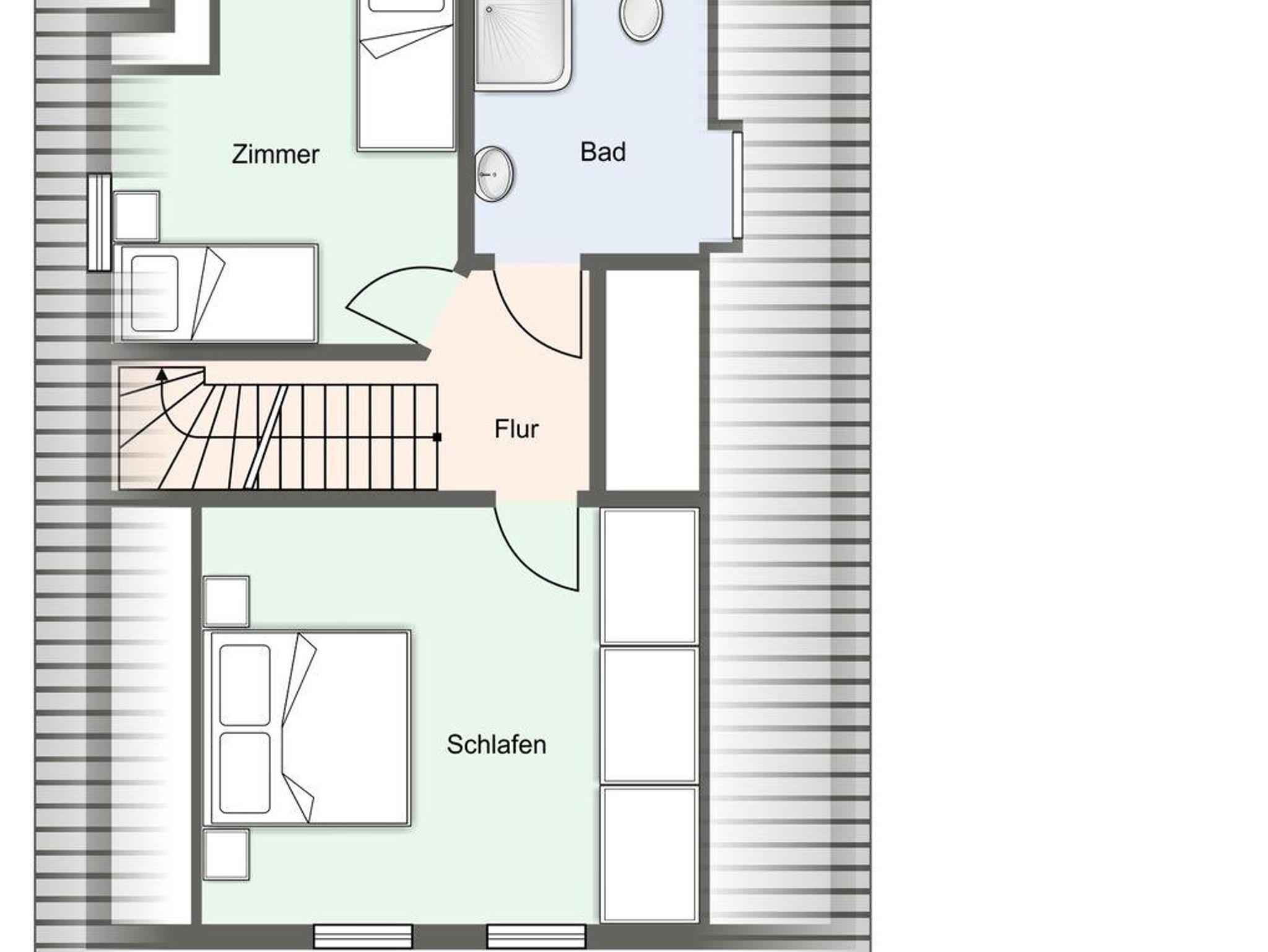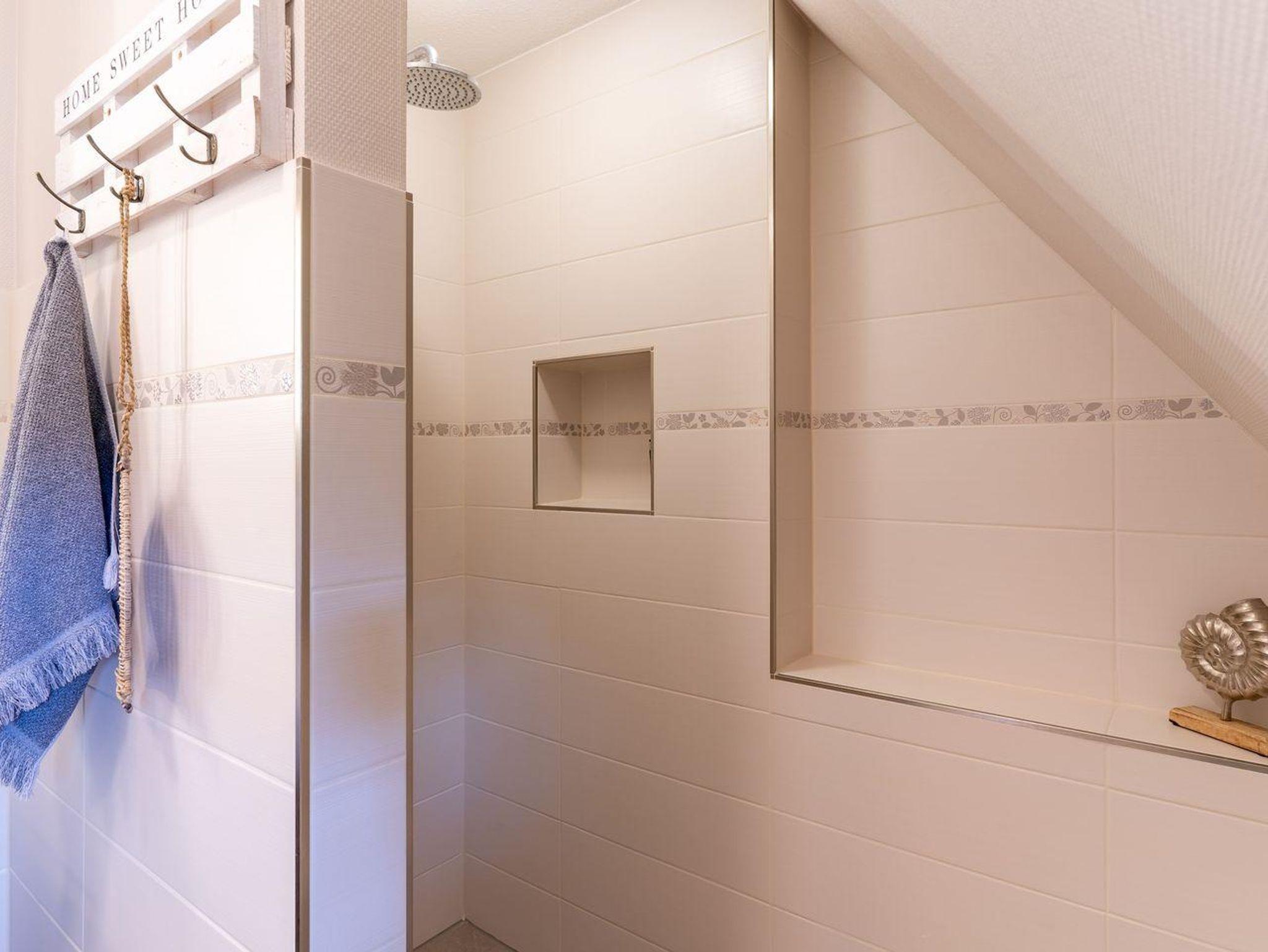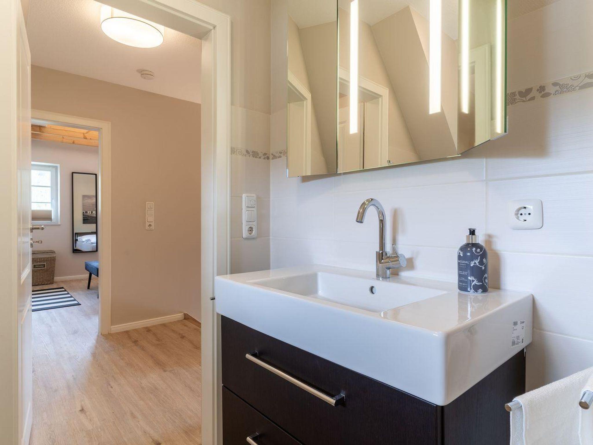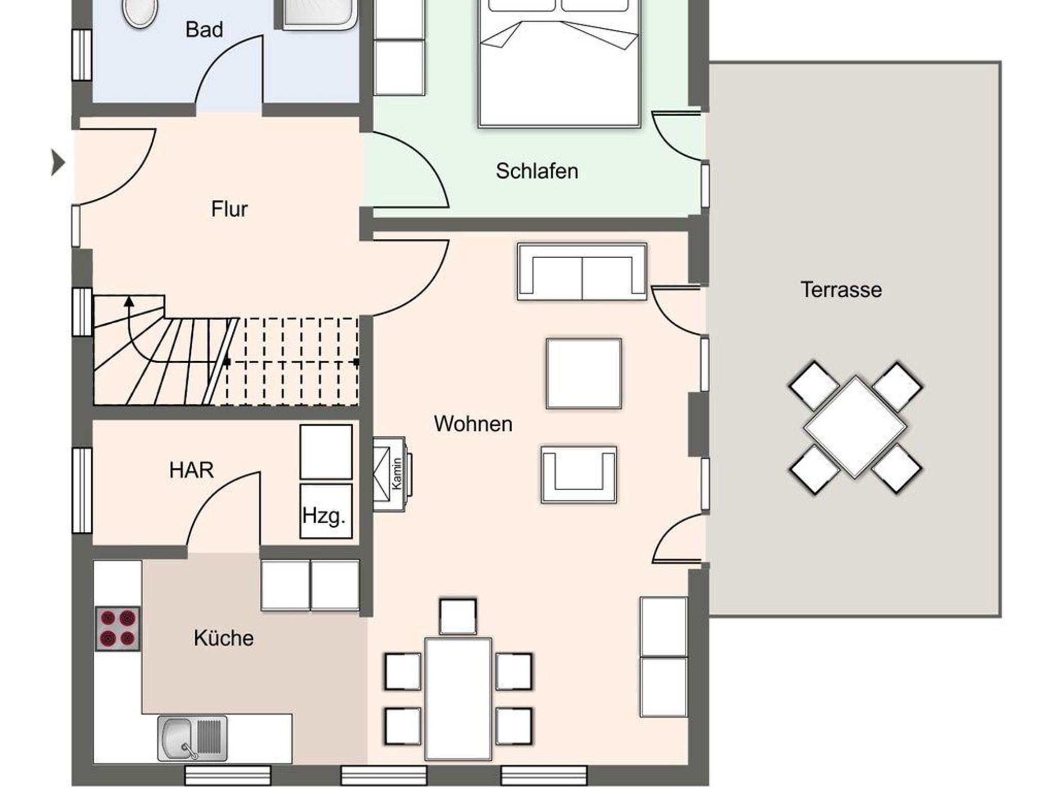 Im Erdgeschoss befindet sich ein lichtdurchflutetes Wohnzimmer mit einem Kamin, einer offenen Küche sowie einem Essbereich. Die Küche verfügt über hochwertige Elektrogeräte und bietet genügend Platz zum gemeinsamen Kochen. Im Erdgeschoss ist ebenso ein großer Flur, ein Duschbad und ein Doppelschlafzimmer mit Zugang auf die Terrasse. Über eine Holztreppe im Flur gelangt man in das Obergeschoss mit zwei Schlafzimmern. Ein Schlafzimmer ist mit einem Doppelbett ausgestattet und bietet jeden Komfort. Darüber hinaus befindet sich im Obergeschoss ein weiteres Schlafzimmer mit zwei Einzelbetten und einem TV. Außerdem ist im Obergeschoss ein weiteres Duschbad.