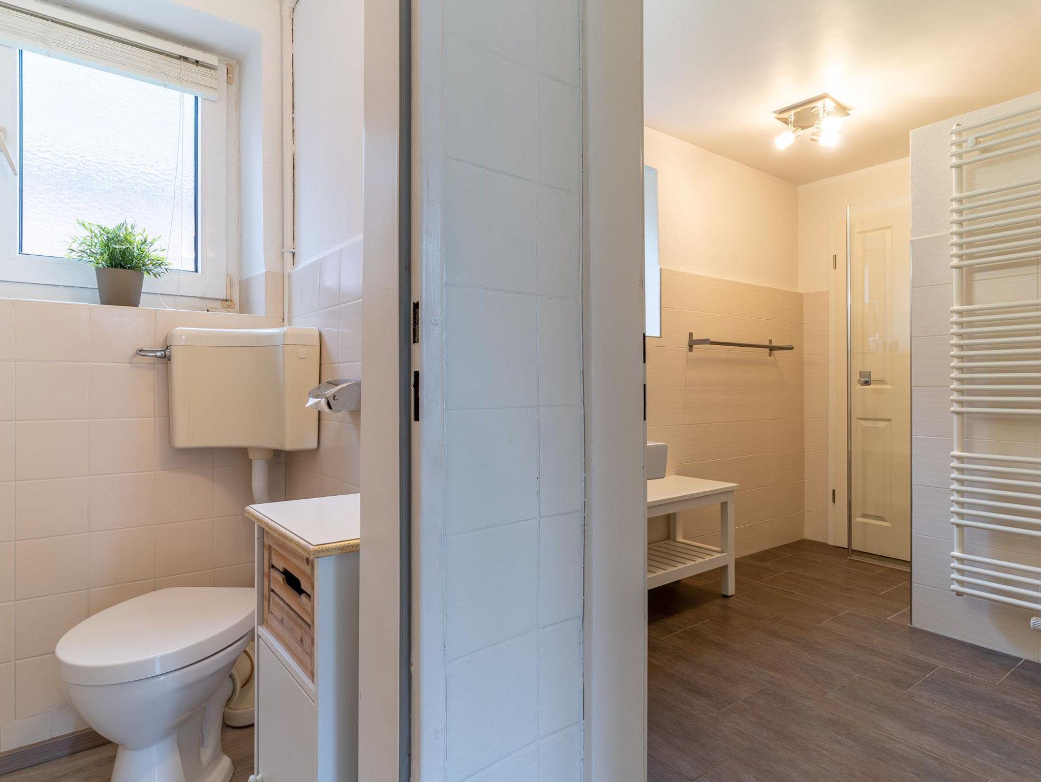 Im Tageslicht-Duschbad finden sie reichlich Ablagefläche. Das WC ist separat.