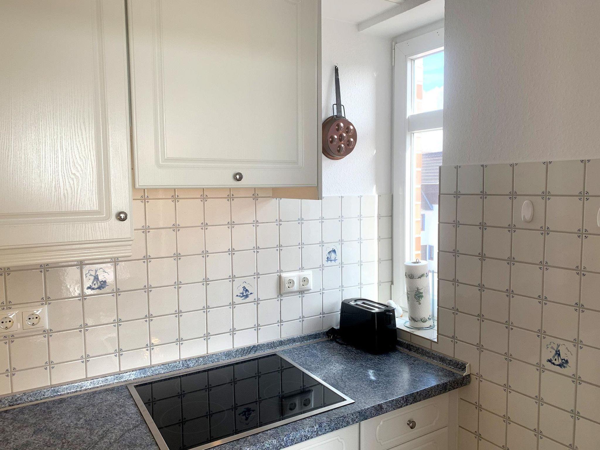 Küche: Einbauküche, 4 Plattenherd, Dunstabzugshaube, Kühlschrank, Spülmaschine, Kaffeemaschine, Wasserkocher, Toaster, Geschirr, Kochtöpfe