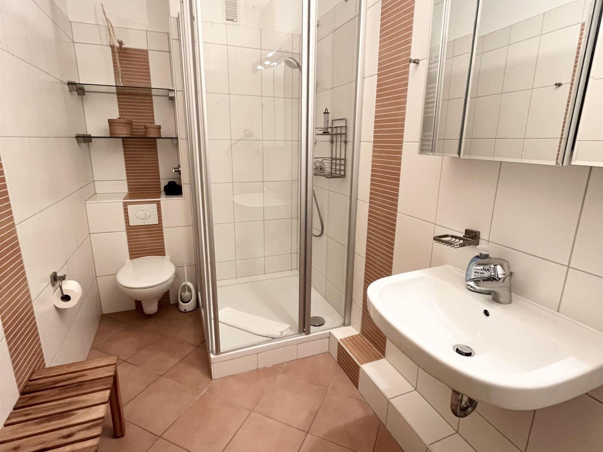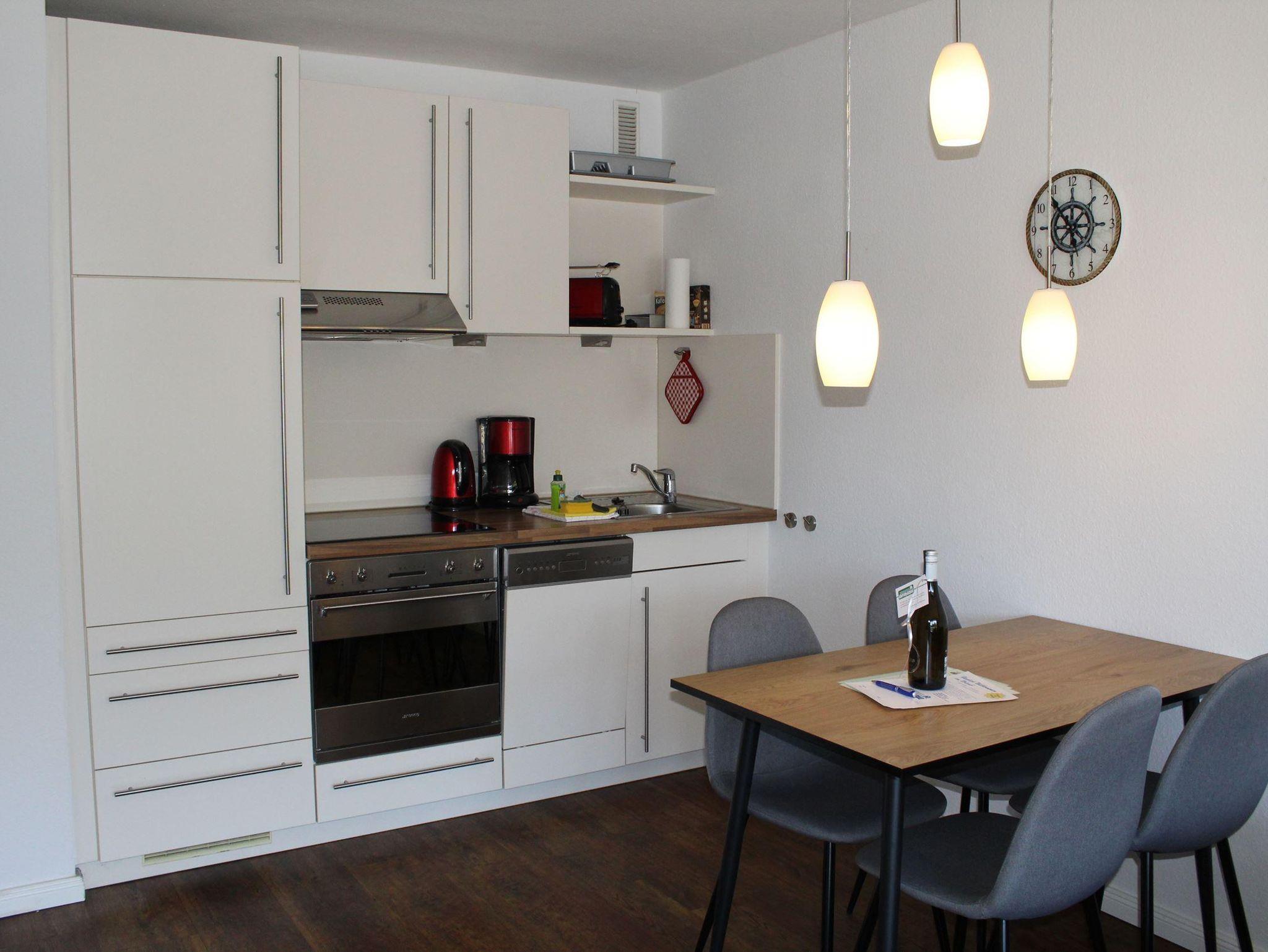 Sitzecke, Essecke, Küchenzeile mit Backofen und Geschirrspüler, Dusche/WC,