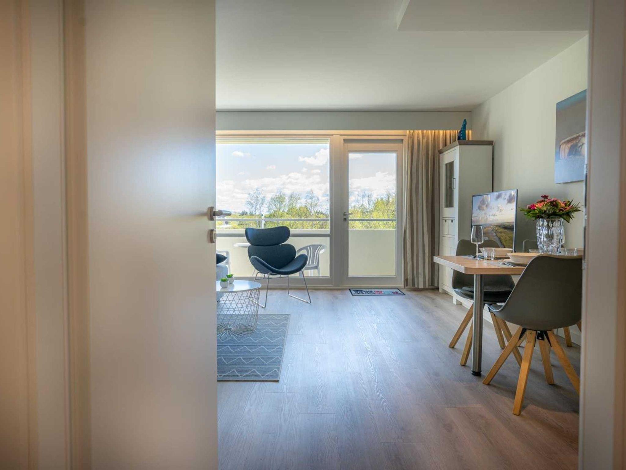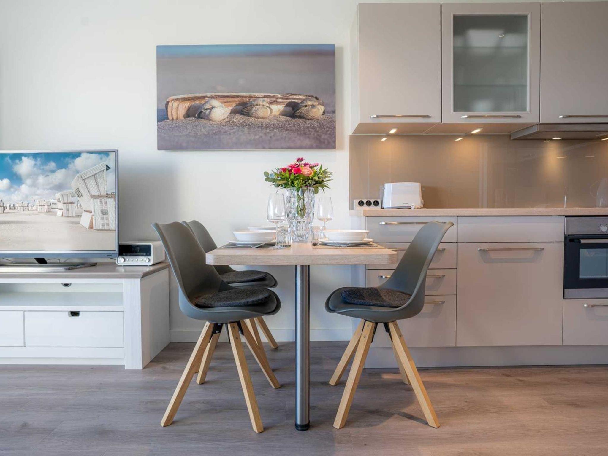 Wohnzimmer mit ausziehbarem Schlafsofa (160x195cm, mit Lattenrost und Matratze), Einbauschrank, großem TV (Sat) und Stereo-Kompaktanlage. Direkter Zugang zum möblierten Balkon nach Südosten mit Blick ins Grüne. Offene Küche mit Induktionsherd, Backofen, Kühlschrank mit Gefrierfach, Geschirrspüler und Esstisch für 4 Personen.