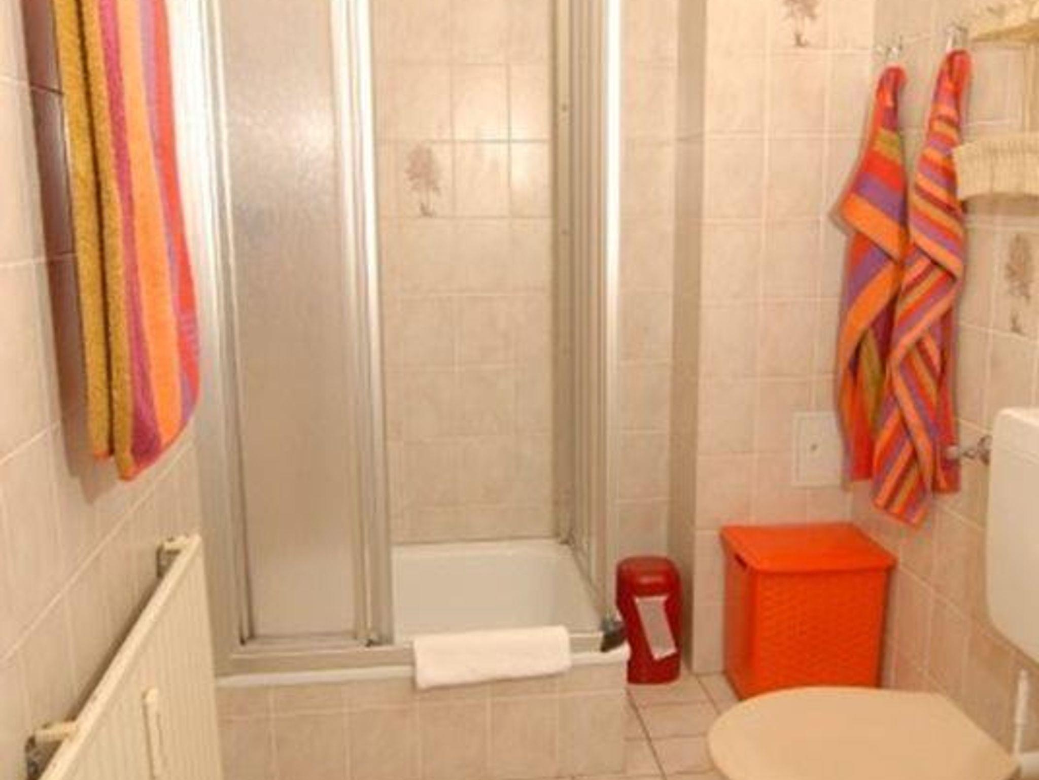 Bad: Dusche, Waschbecken, WC, Wäscheeimer, Duschkabine