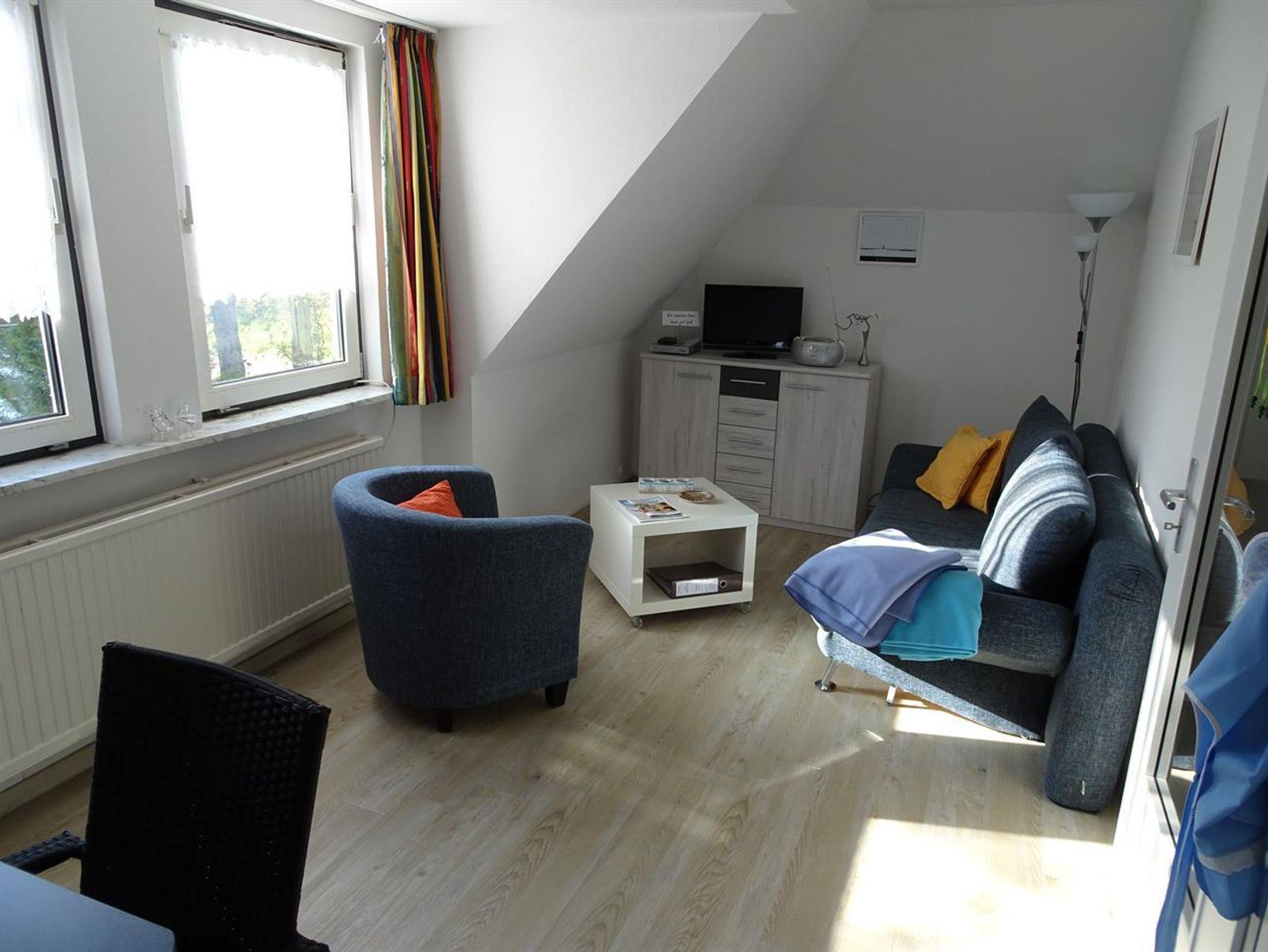 1 Wohnschlafraum mit Schlafcouch, kompl. eingerichteter Küchenzeile, Geschirrspüler, E-Herd, Backofen, Kühlschrank, Wasserkocher, Toaster, Eierkocher, Eßecke, Farb-TV mit SAT-Receiver, Stereoanlage. DVD-Player.
