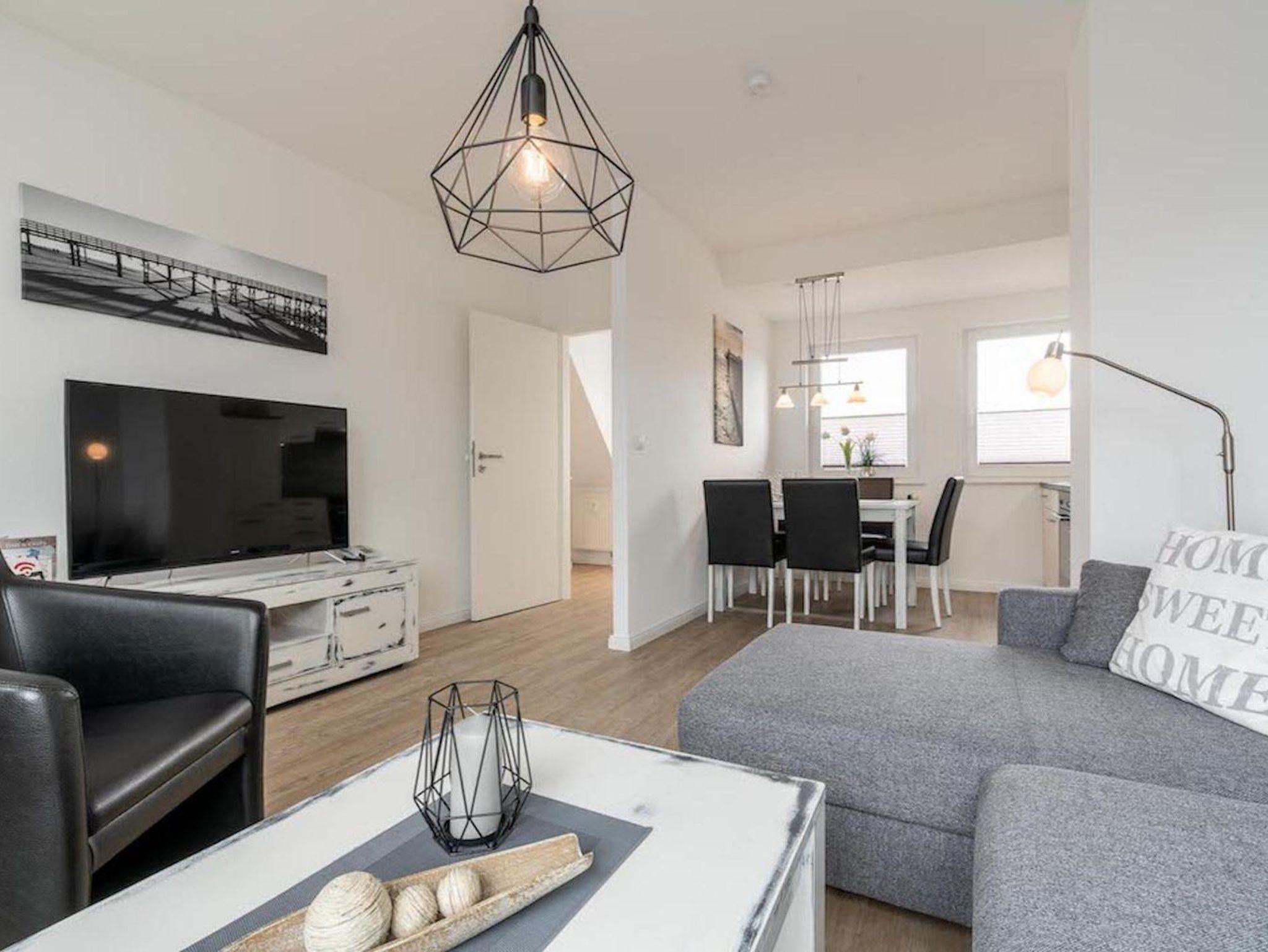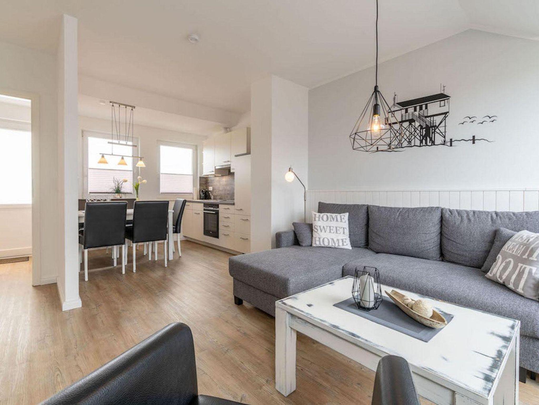 Viel Raum für 4 Personen auf 68 qm im 2. Obergeschoss direkt an der Strandüberfahrt von St. Peter-Ording bietet dieses moderne Appartement mit Blick auf und über den Deich vom Ordinger Strand für die ganze Familie. Die Ferienwohnung für 4 Personen verfügt über einen schönen und hellen Wohnbereich. Hier finden Sie eine Couch mit 2 Sessel und einem Couchtisch. Des weiteren erwartet Sie ein Esstisch mit 6 Stühlen. Die Küchenzeile des Hauses ist ausgestattet mit einem Ceran-Kochfeld, mit Backofen, Anrichte, Dunstabzugshaube, Geschirr, Kaffeemaschine, Kochtöpfe, Kühlschrank, Mikrowelle, Geschirrspüler, Toaster und einem Wasserkocher.