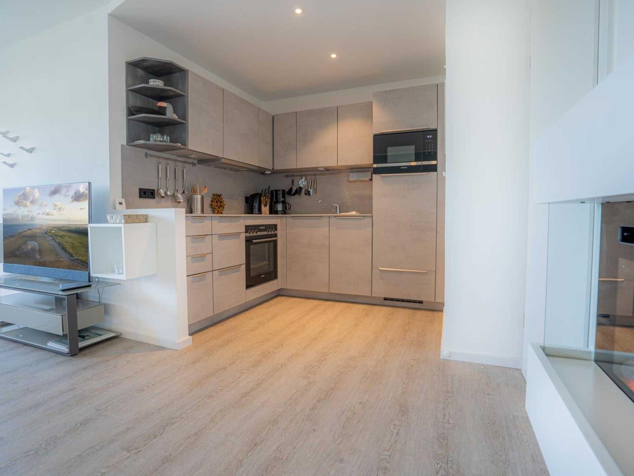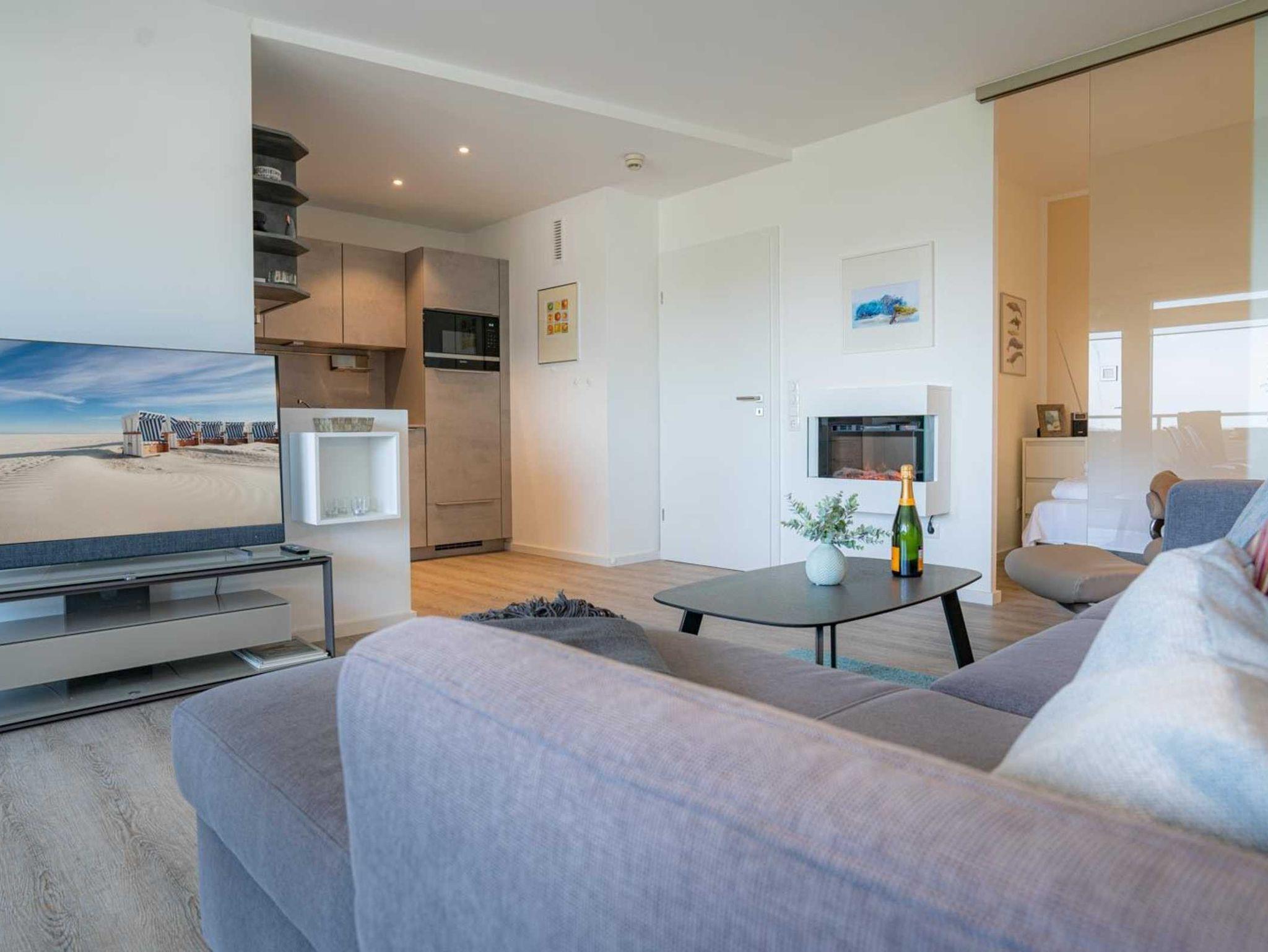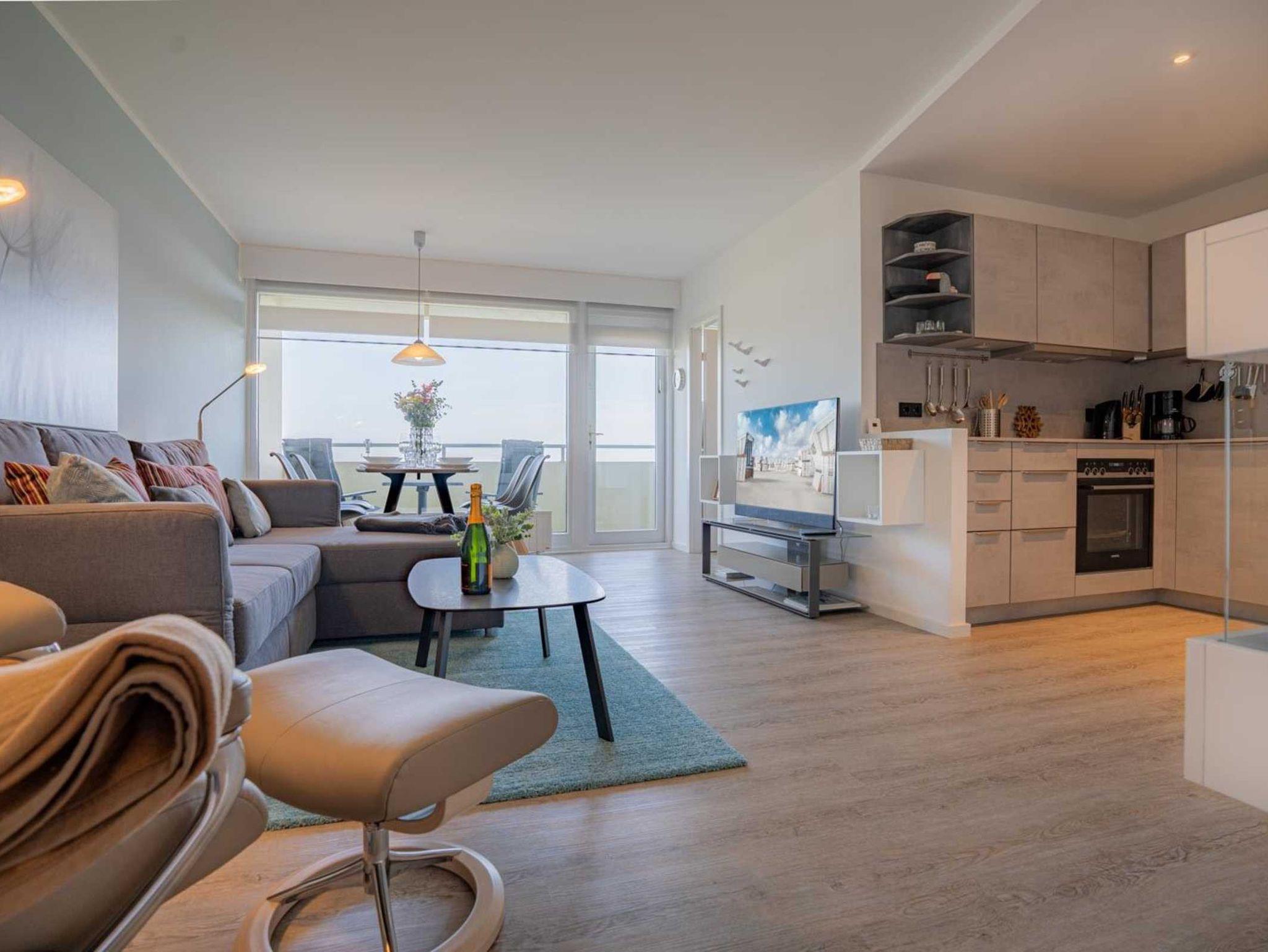 Wohnzimmer mit Ecksofa, Relax-Sessel, Elektro-Kamin mit Heizgebläse, Essplatz für 4 Personen, großes SMART-TV (Sat, SKY-Abo) und Radio. Direkter Zugang zum möblierten Balkon nach Südosten. Offene Küche mit Induktionsherd, Backofen, Mikrowelle, Geschirrspüler und Kühlschrank mit Gefrierfach.