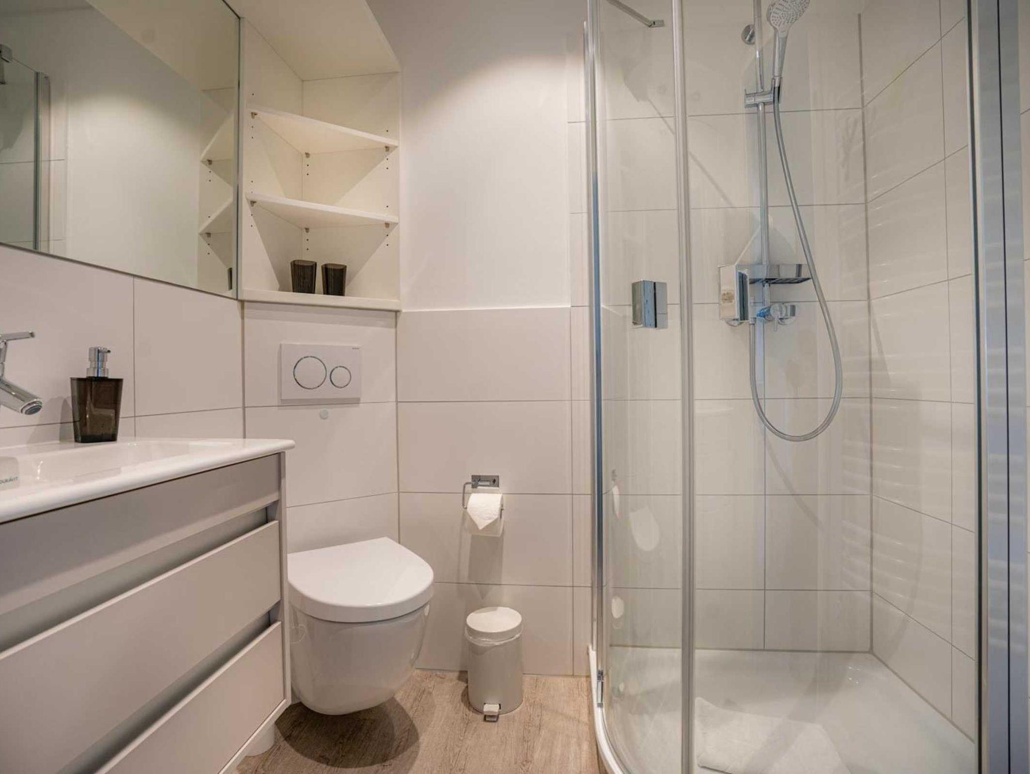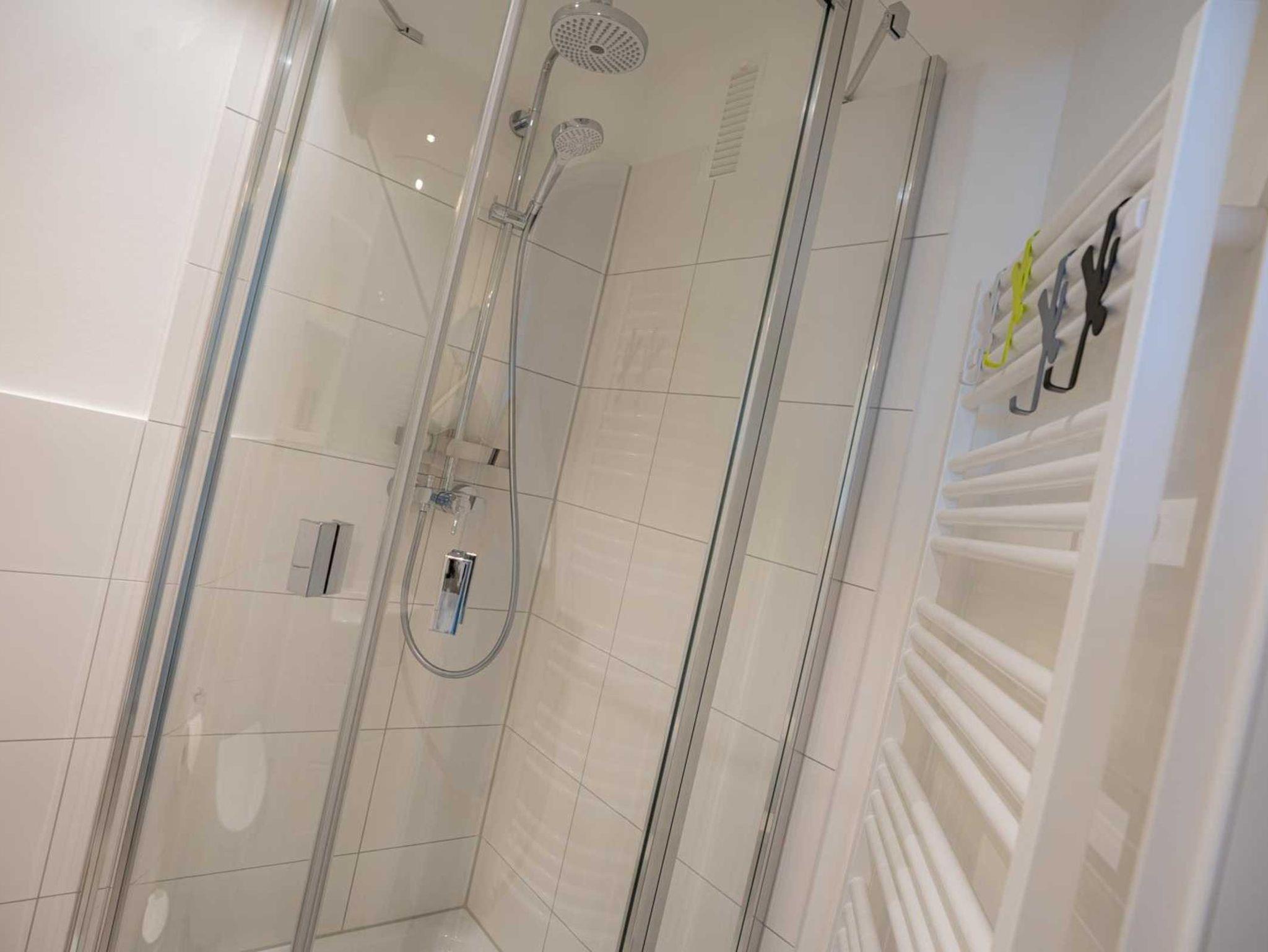 Badezimmer (Duschbad) mit Dusche, WC, Handtuchwärmer und Föhn.