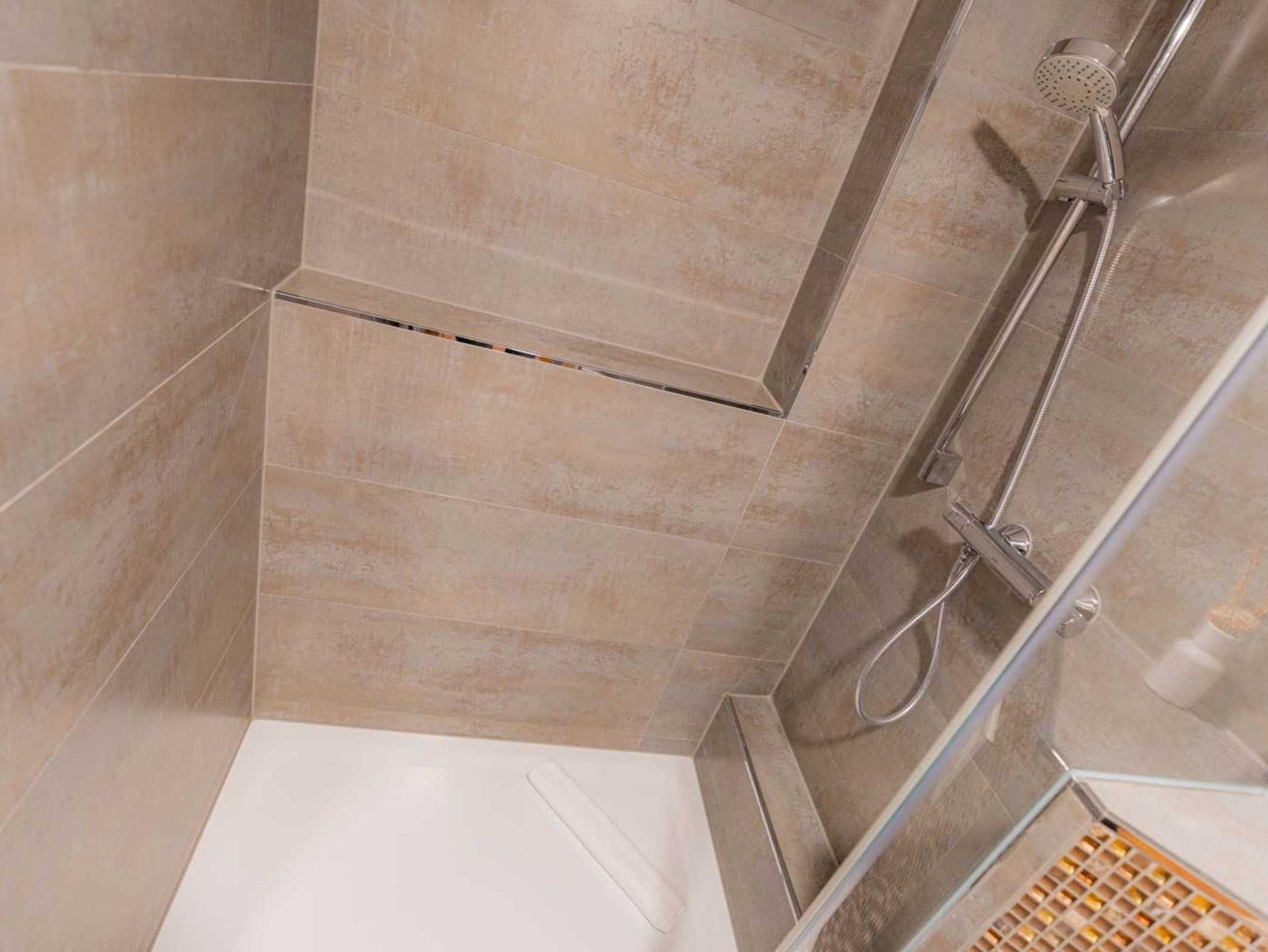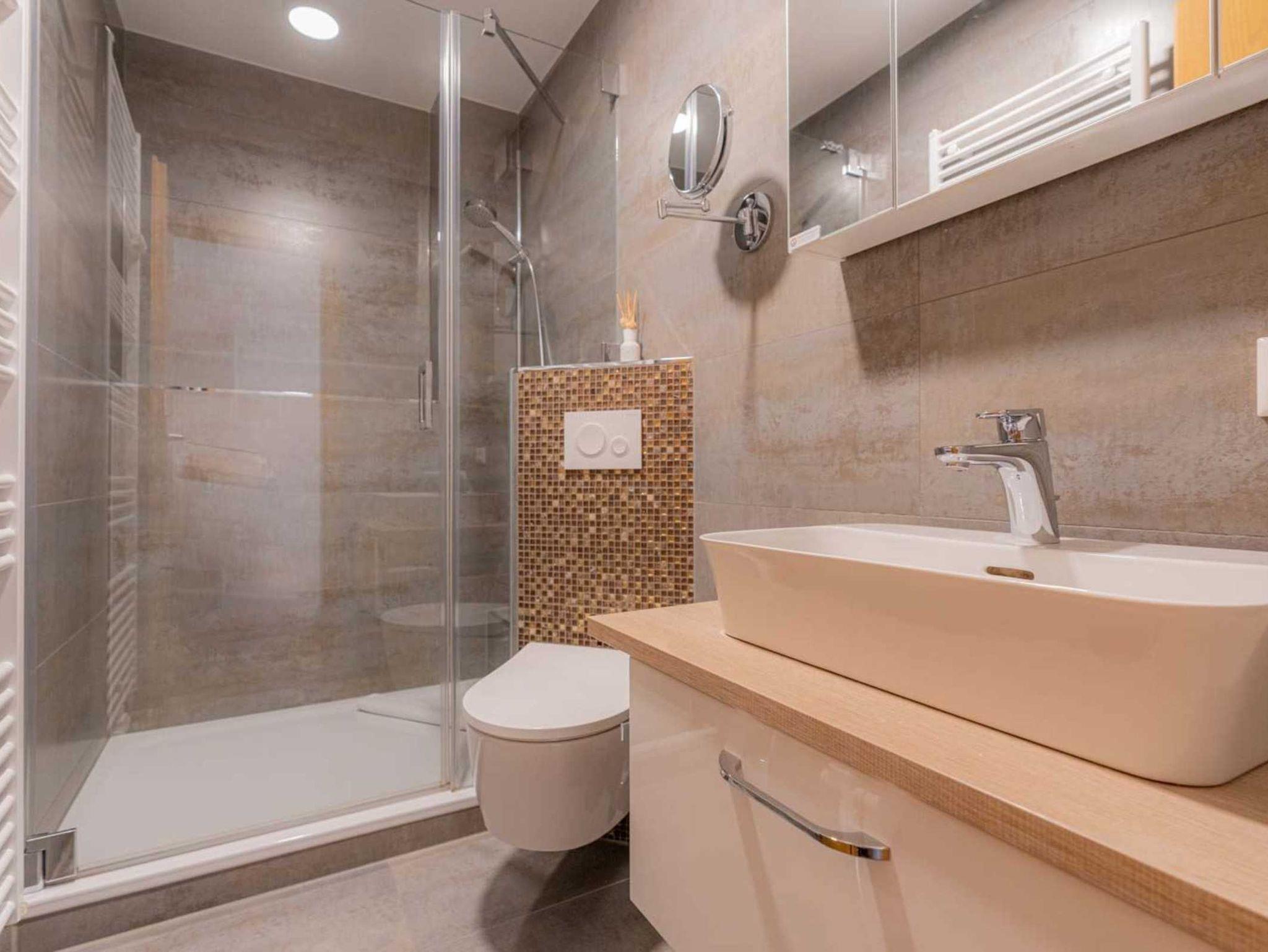 Badezimmer (Duschbad) mit Dusche, WC, Handtuchwärmer und Föhn.