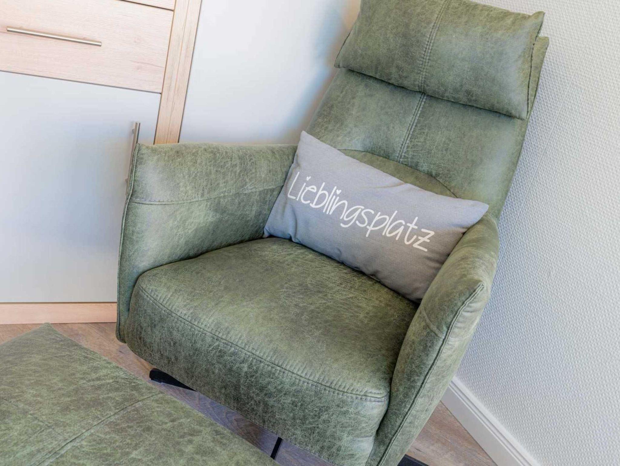 Wohnzimmer mit ausklappbarem (Schlaf-) Sofa (160x195cm), Sessel, TV (Kabel), Bluetooth-Soundsystem und Esstisch mit 4 Stühlen. Direkter Zugang zum möblierten 1. Balkon nach Westen.