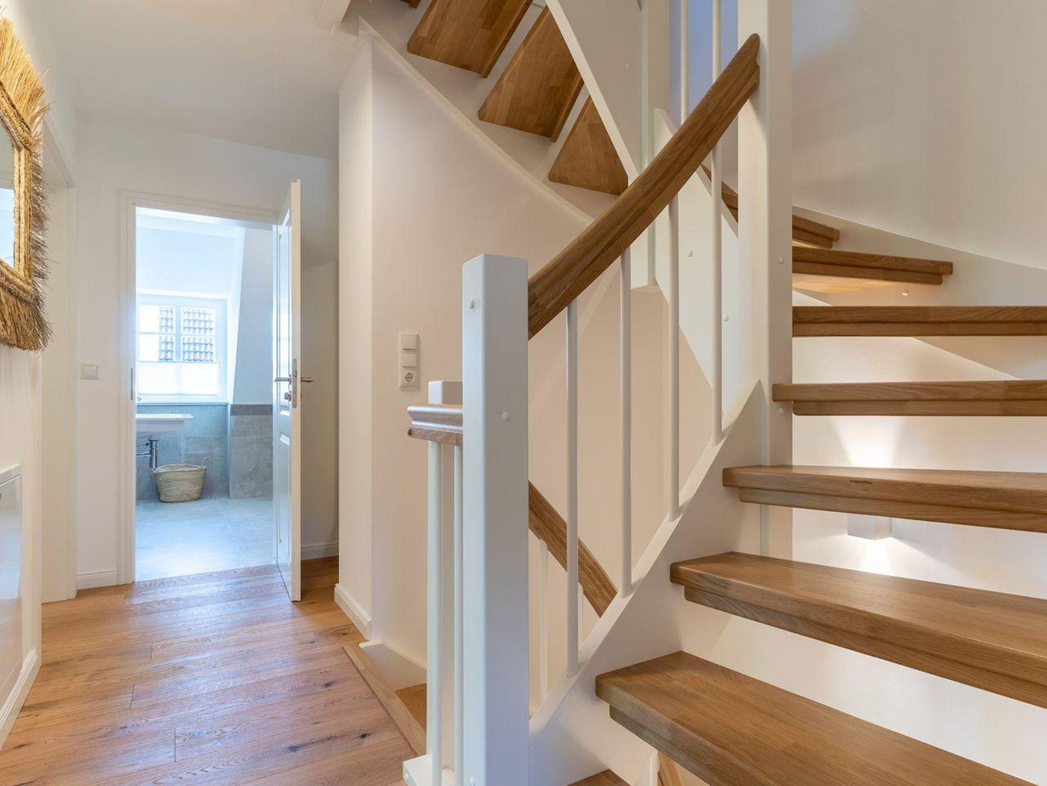 Im ersten Obergeschoss bieten zwei komfortabel ausgestattete Schlafzimmer ruhevolle Erholung. Ein Zimmer verfügt über ein Boxpring-Doppelbett mit TV, das andere über zwei Boxspring-Einzelbetten. Große Einbauschränke bieten ausreichend Ablagefläche. Für eine angenehme Auszeit sorgt das Badezimmer mit großer Wellness-Dusche und Kneippschlauch.