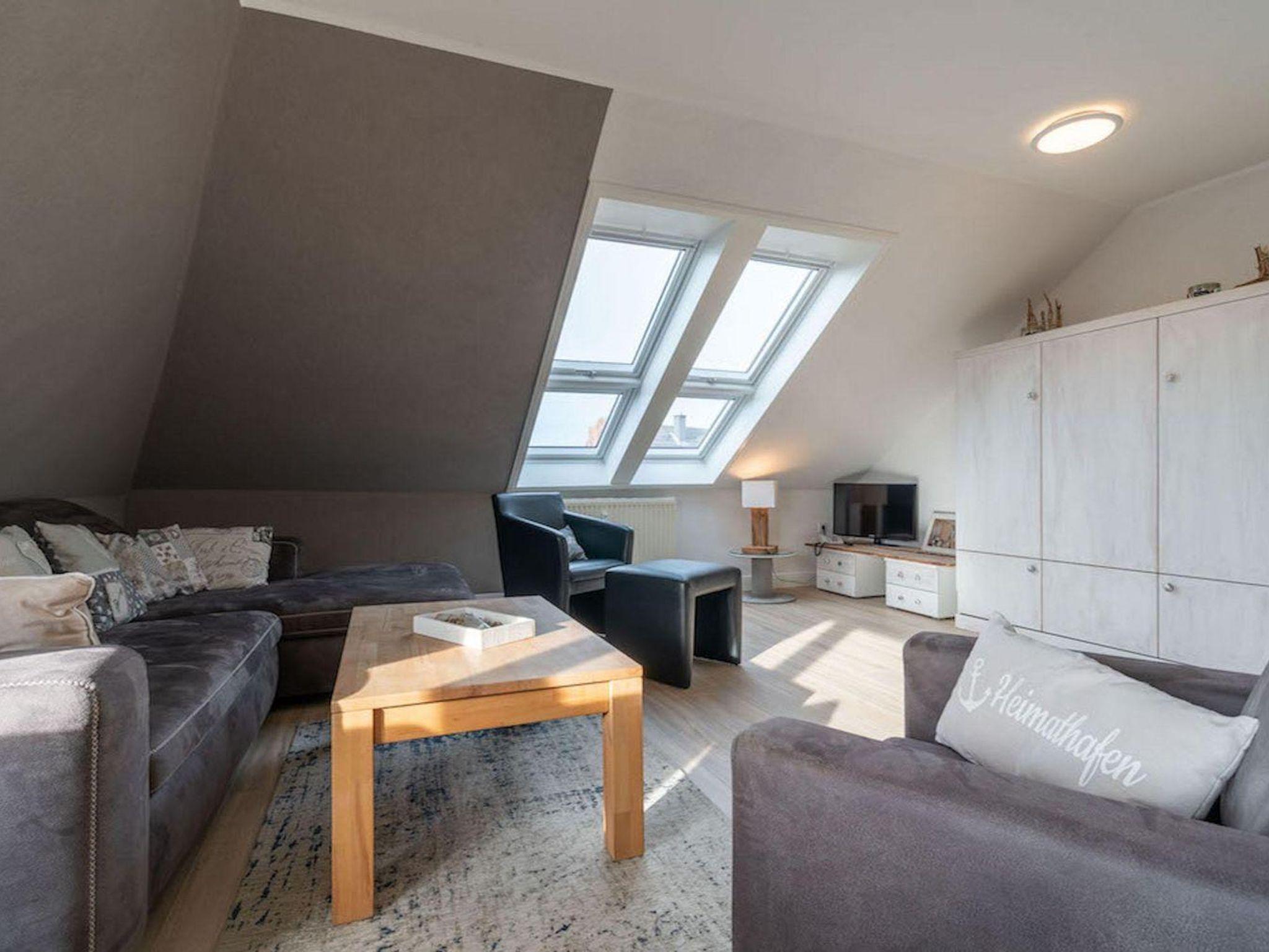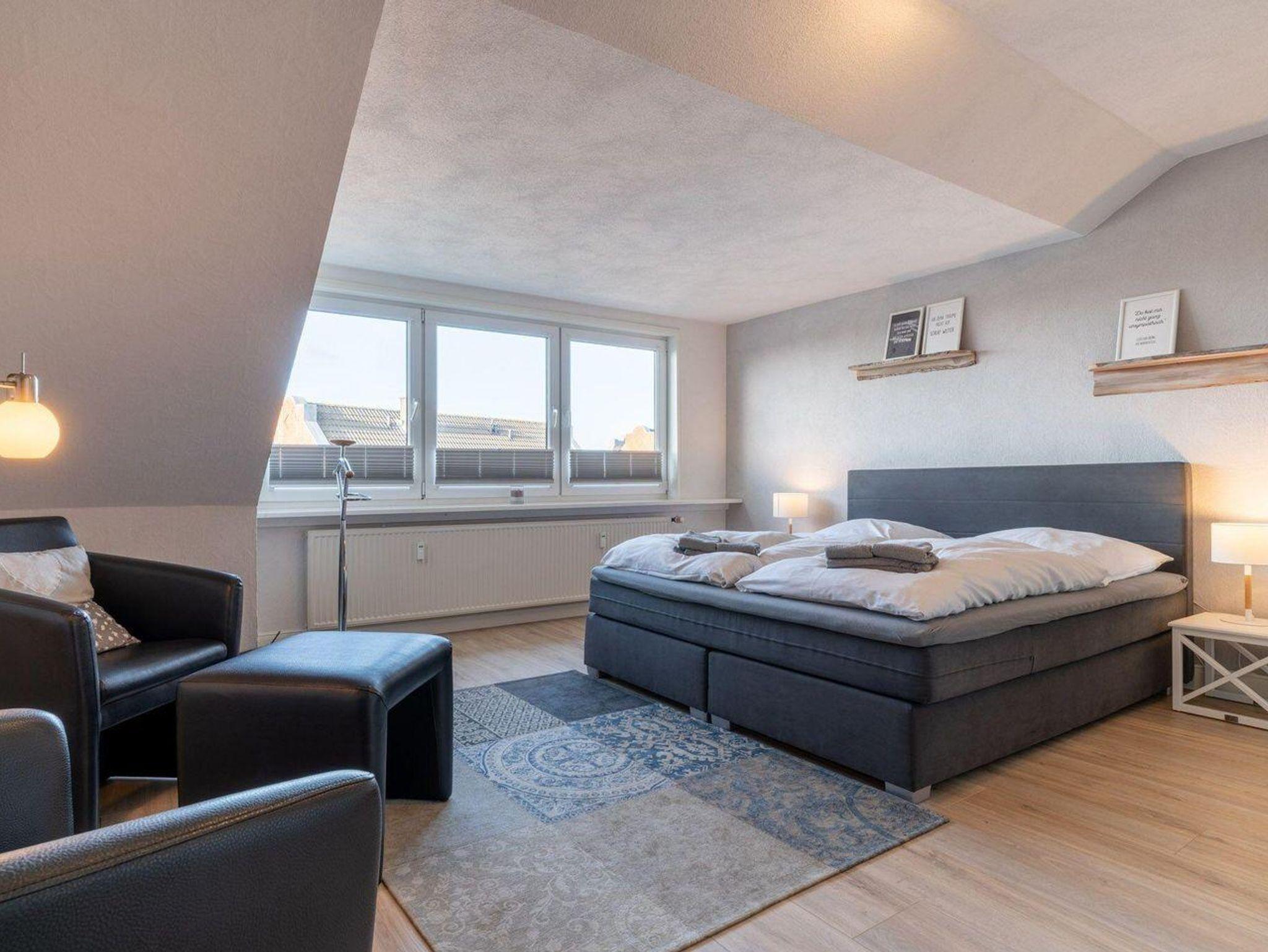 In diesem Appartement im 2. Obergeschoss haben sie komfortabel Platz für 4 Personen und blicken direkt über den Deich auf die Strandkörbe und Pfahlbauten am Strand.
