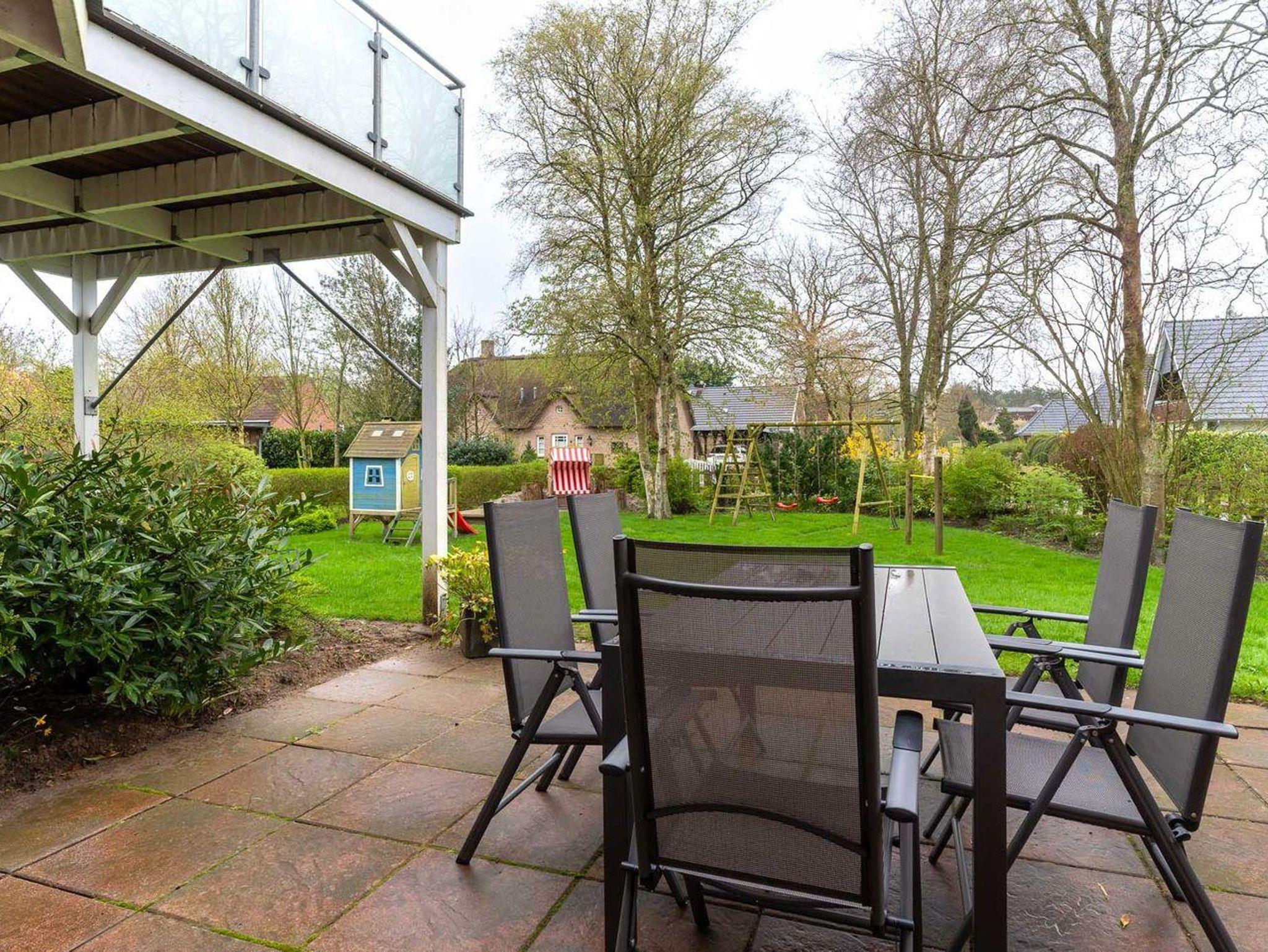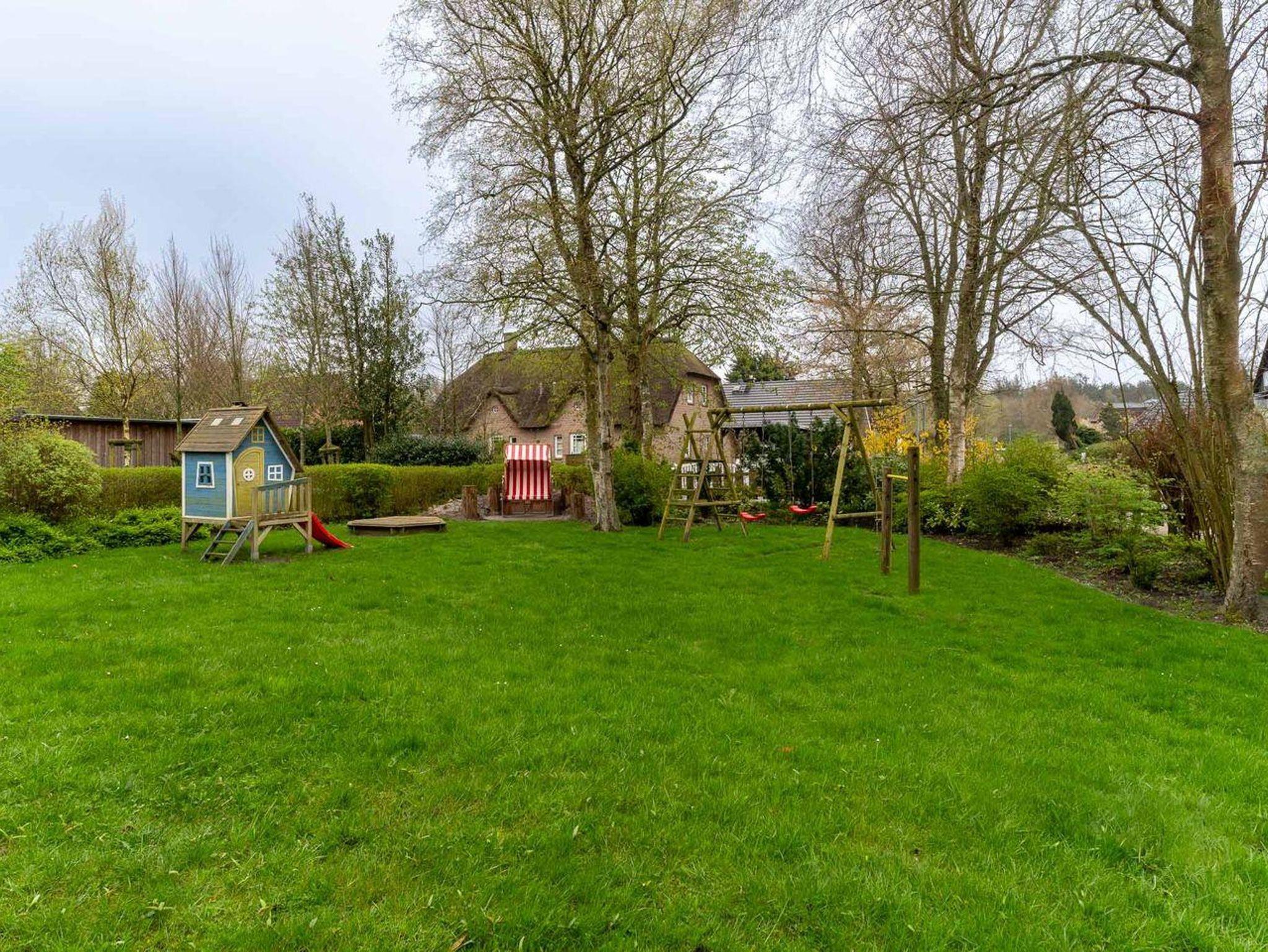 Großer Garten mit Spielgeräten und Strandkorb