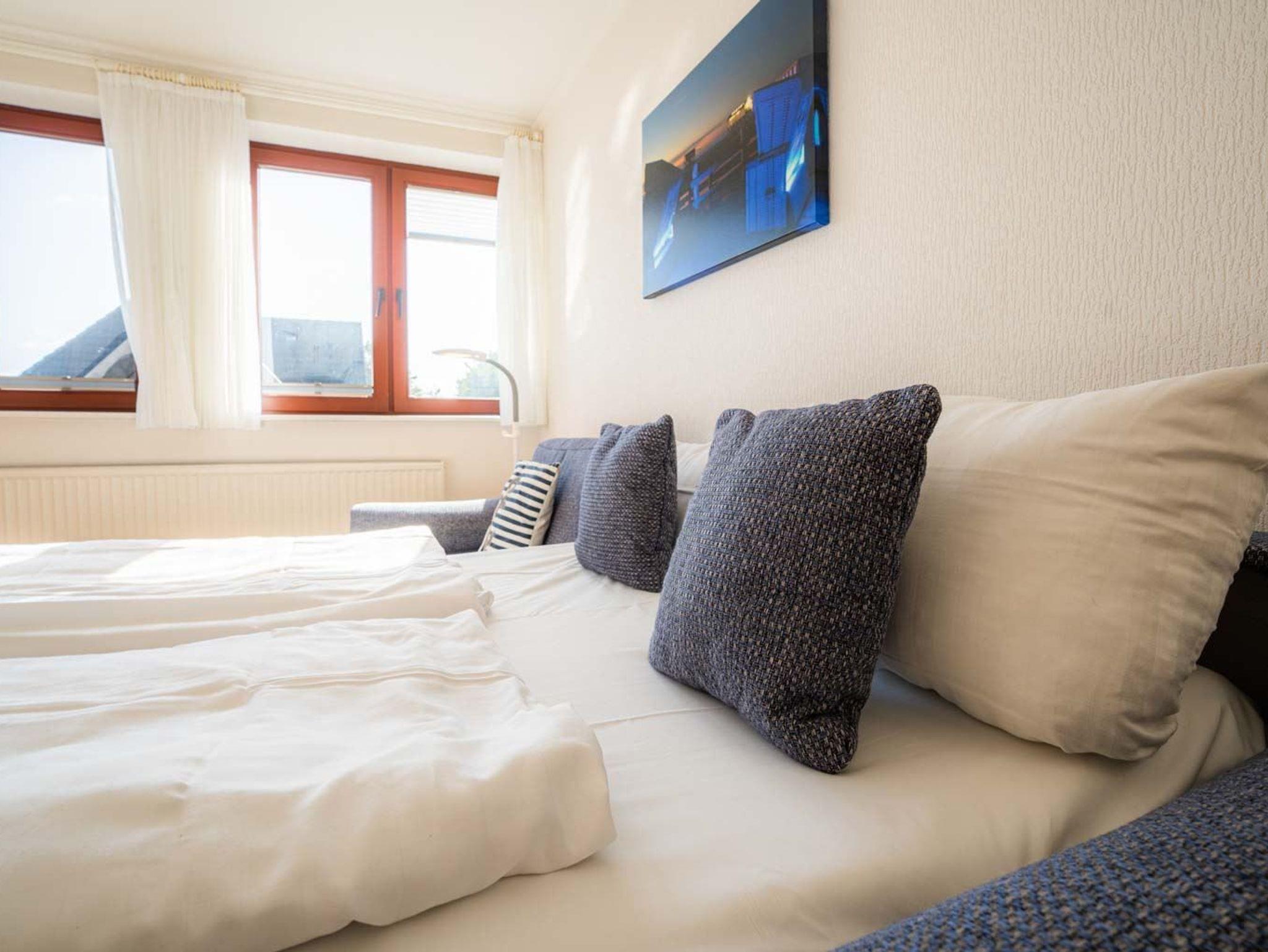 Schlafzimmer mit Doppelbett (2x 80x200cm) und Kleiderschrank.