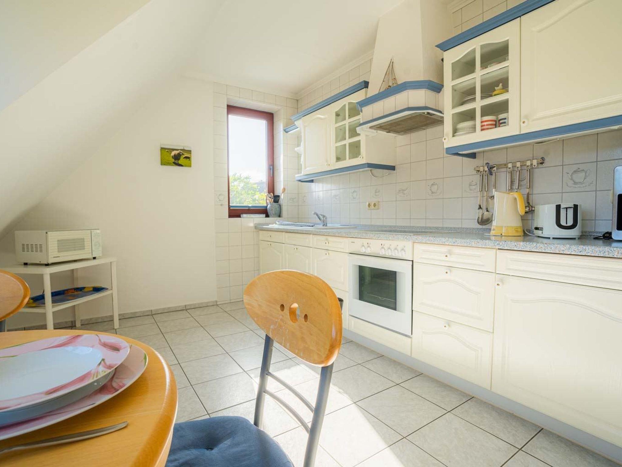 Große, separate Küche mit Backofen, Kühlschrank mit Gefrierfach und Esstisch mit 4 Stühlen.