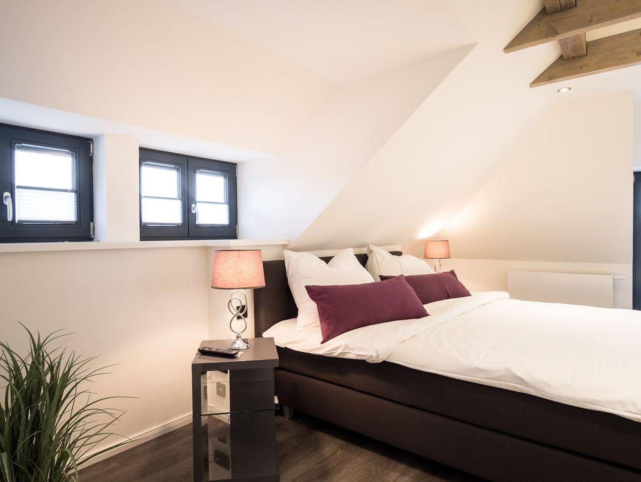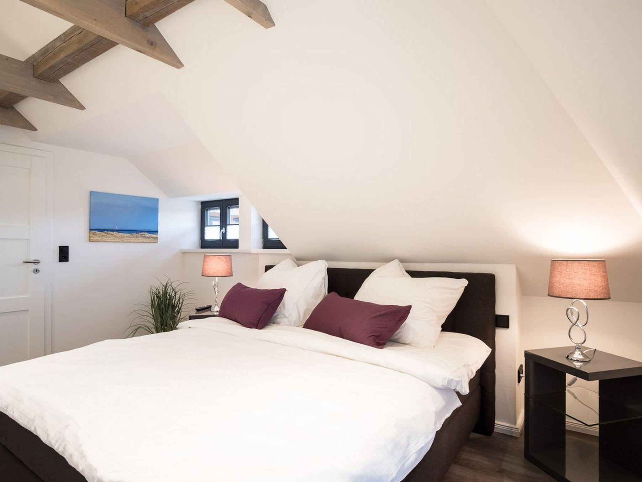 Über eine Holztreppe gelangt man in das Obergeschoss mit zwei großzügigen und liebevoll eingerichteten Schlafzimmern.