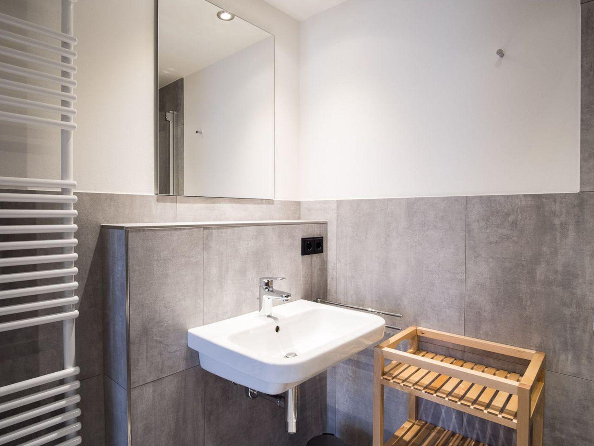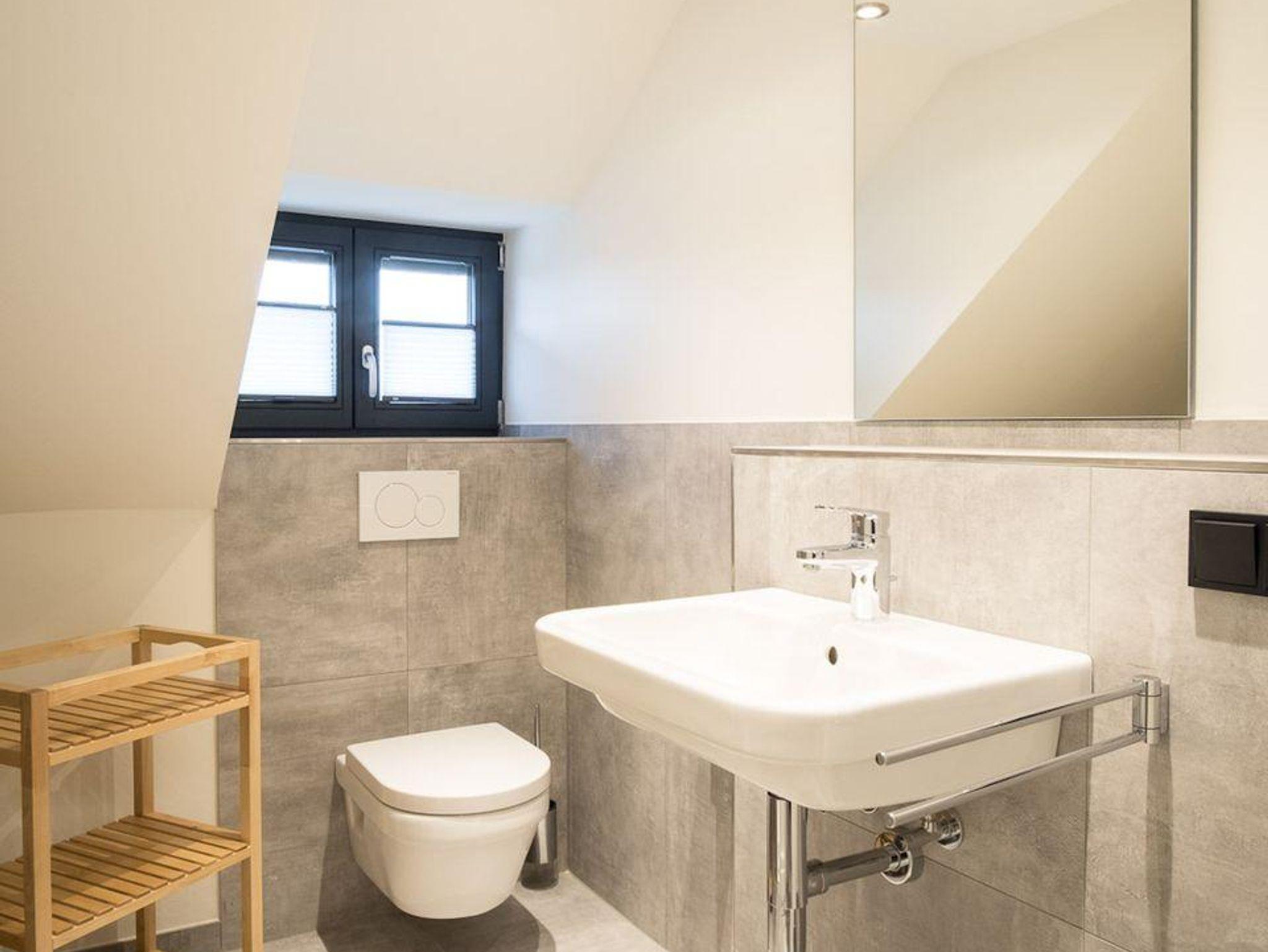 Im Erdgeschoss ist ebenso ein Doppelschlafzimmer mit TV, sowie ein gegenüberliegendes Duschbad mit WC und eine Sauna mit Zugang in den Garten.