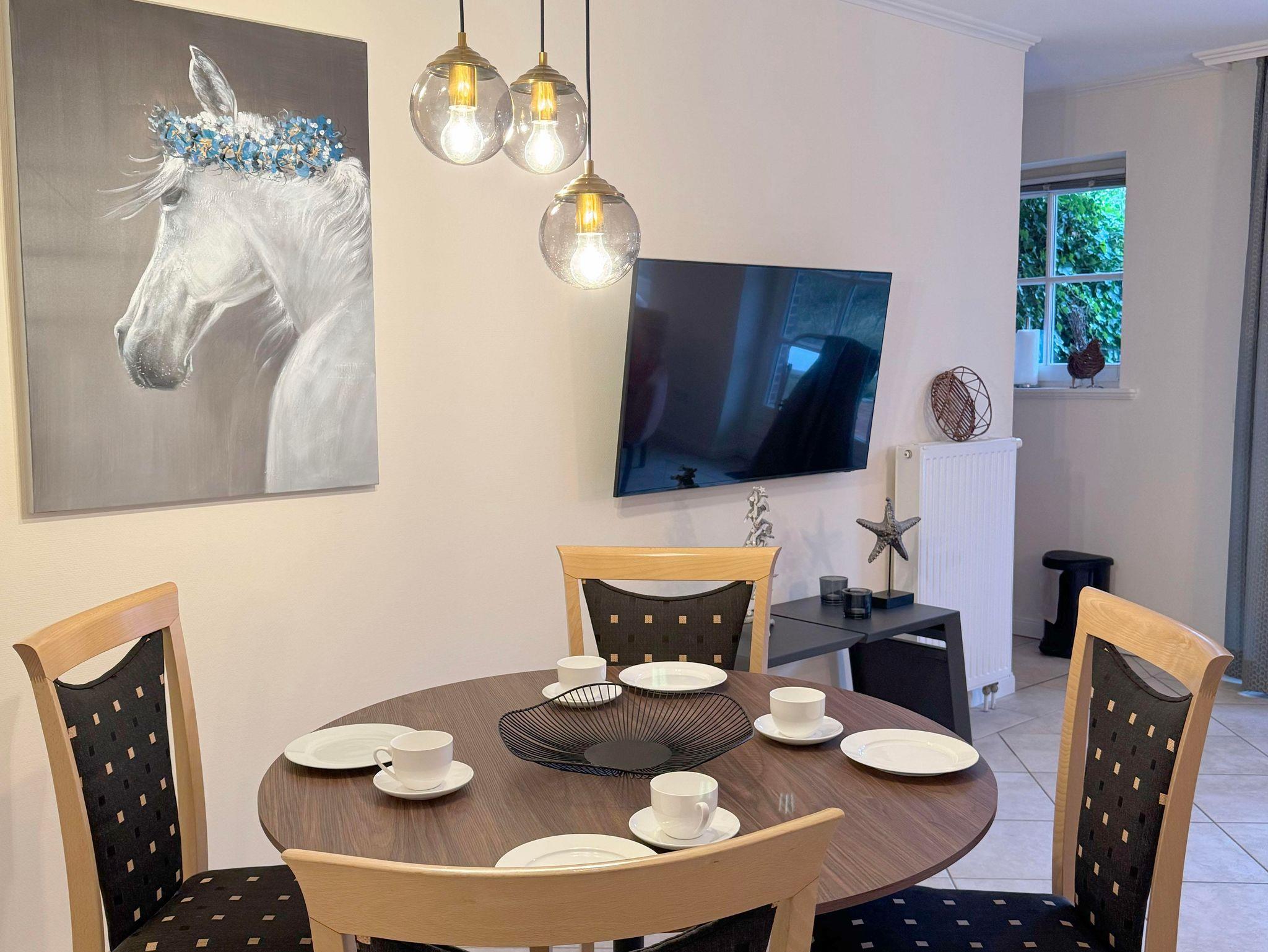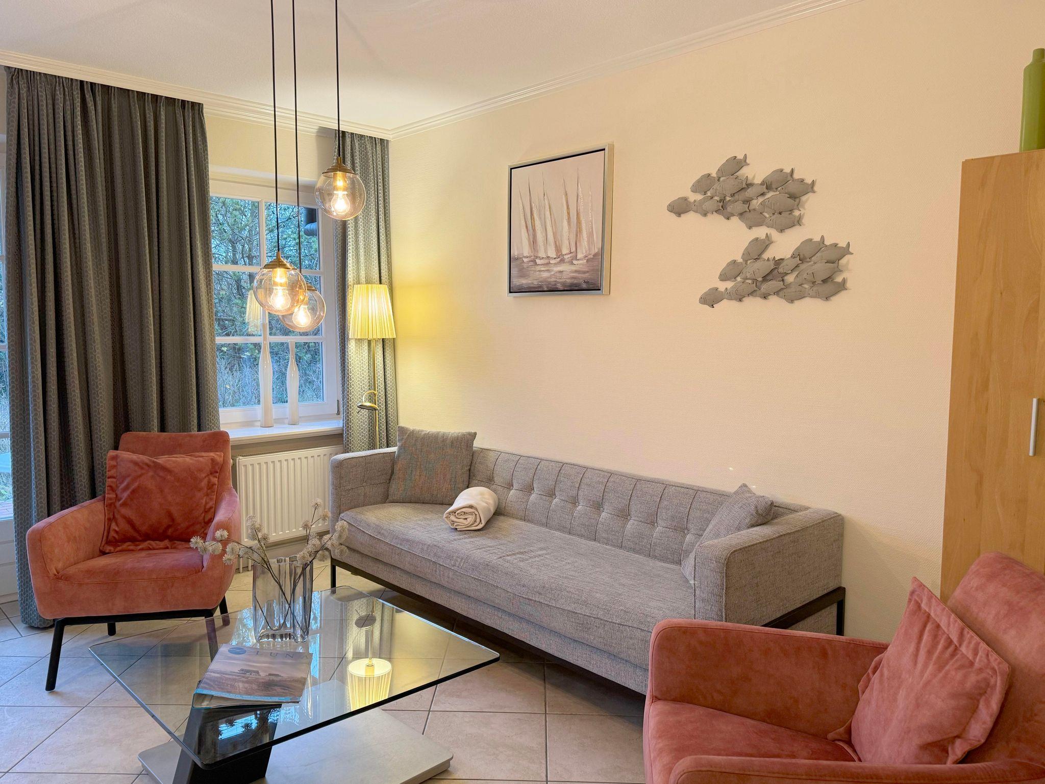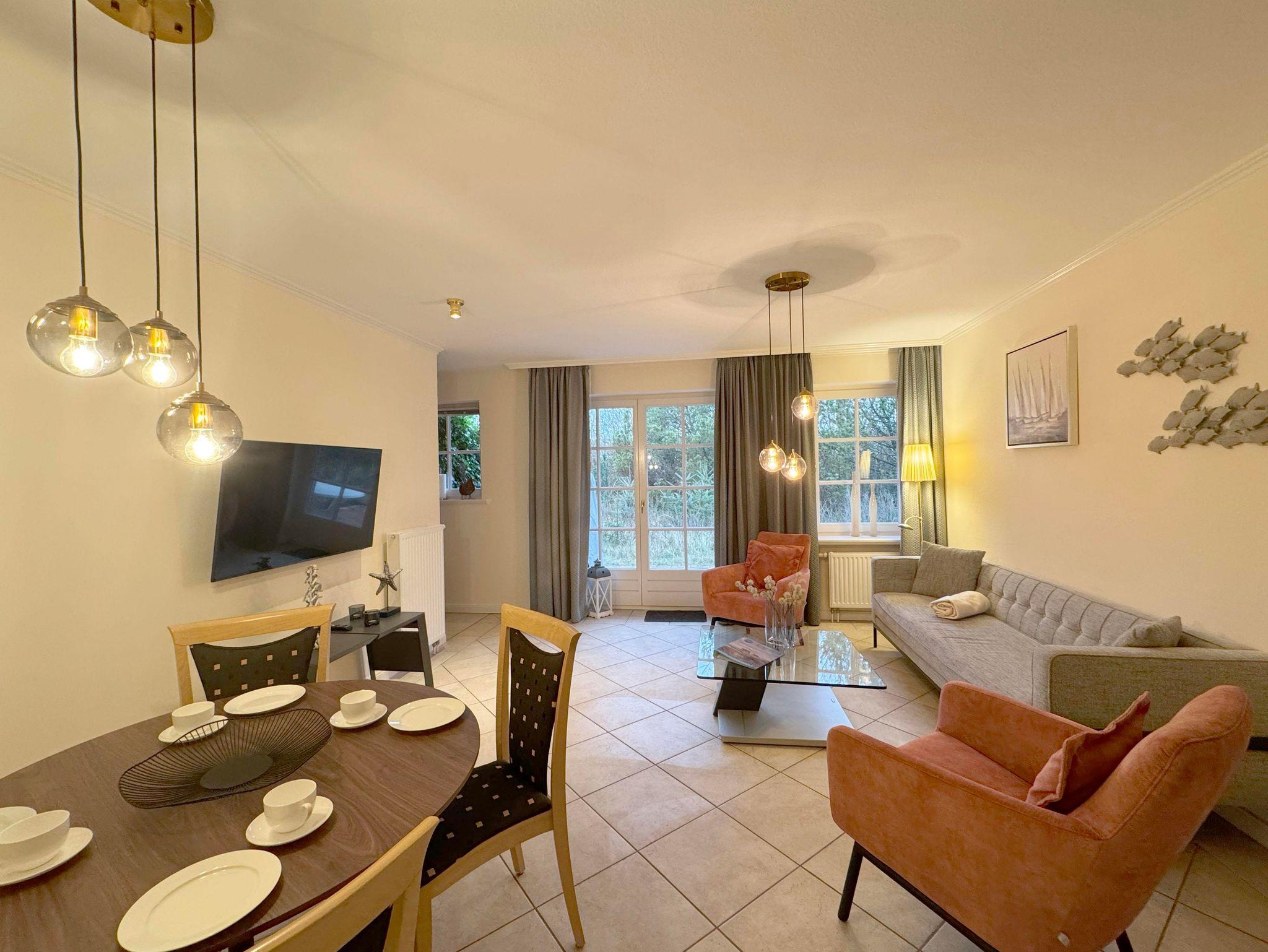Eingangsdiele mit Garderobe, großzügiger Wohn-Essbereich mit direktem Zugang auf eine große, durch Friesenwälle und Gehölze abgeschirmte Terrasse in Westlage mit Gartenmöbeln und einem Strandkorb, zwei Schlafzimmer mit Doppelbetten, zwei Duschbäder/WC, separate Küche. Im Untergeschoss befindet sich eine Gemeinschaftssauna mit Ruheraum, verschiedene Duschen, Fußbäder, WC, Umkleideraum, Solarium, Fitnessraum, Tischtennis. Im Außenbereich befindet sich ein Spielplatz für die Kleinsten, Stellplatz, Fahrradständer und ein wunderschön angelegtes Gartengelände umsäumt von Grünland.
