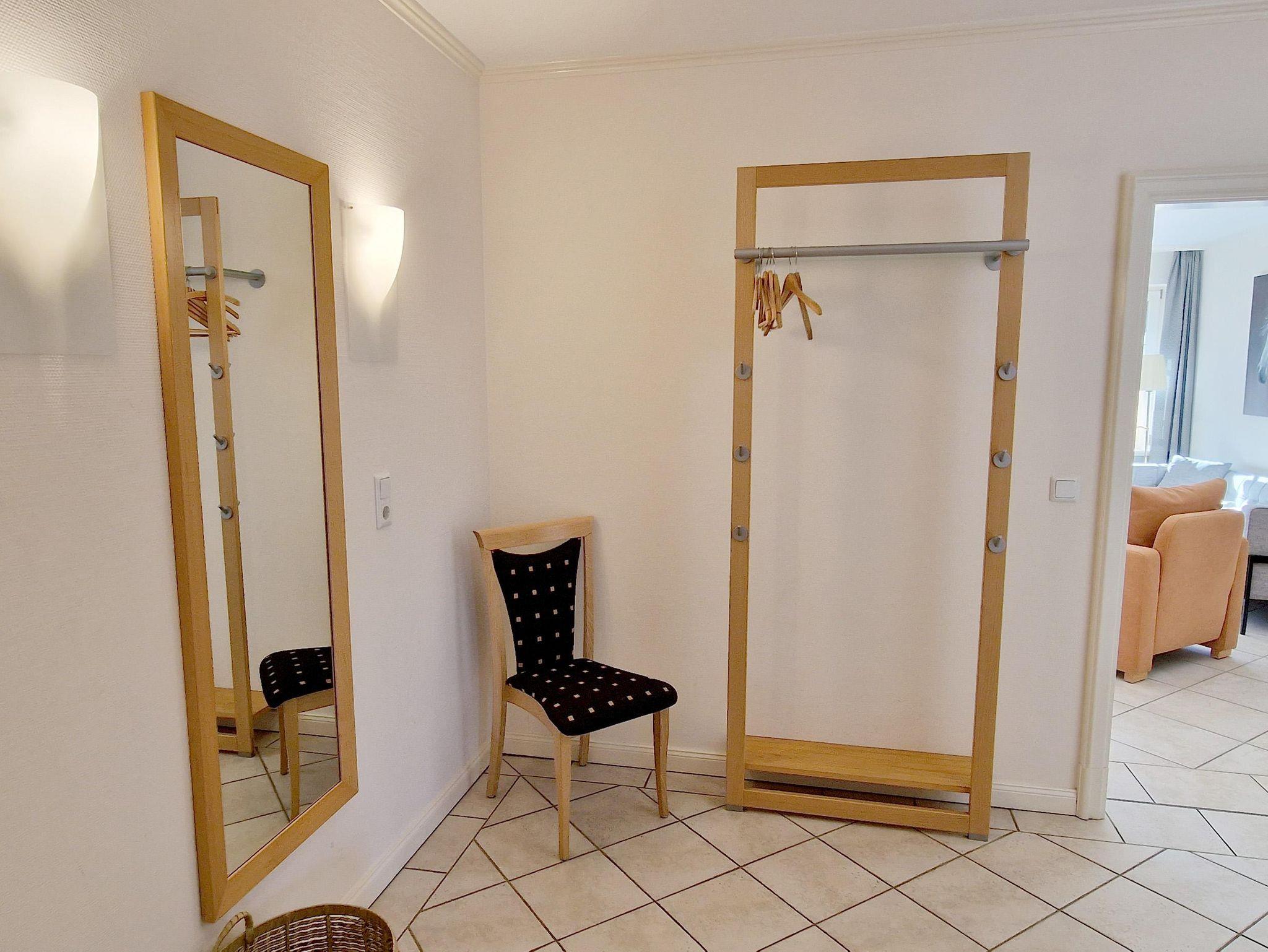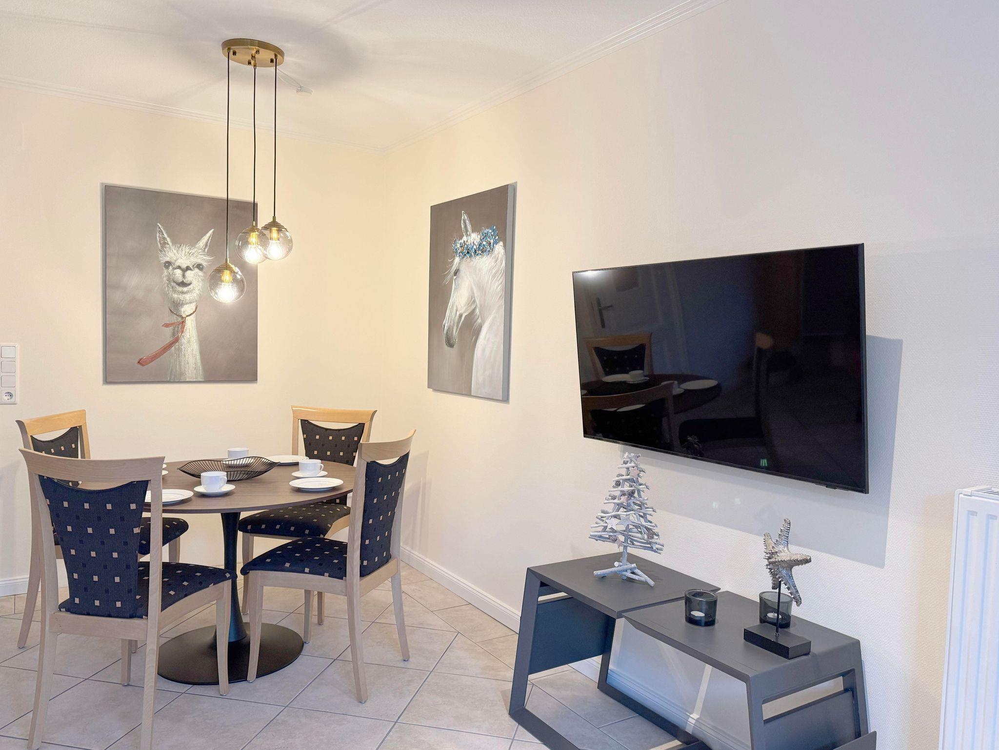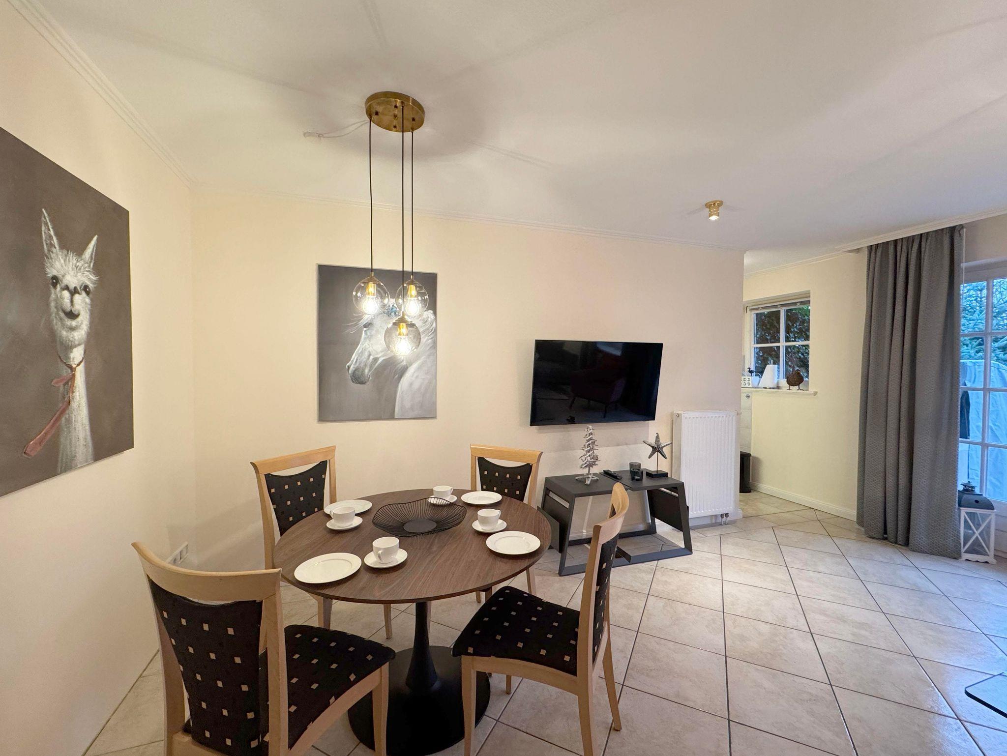 Eingangsdiele mit Garderobe, großzügiger Wohn-Essbereich mit direktem Zugang auf eine große, durch Friesenwälle und Gehölze abgeschirmte Terrasse in Westlage mit Gartenmöbeln und einem Strandkorb, zwei Schlafzimmer mit Doppelbetten, zwei Duschbäder/WC, separate Küche. Im Untergeschoss befindet sich eine Gemeinschaftssauna mit Ruheraum, verschiedene Duschen, Fußbäder, WC, Umkleideraum, Solarium, Fitnessraum, Tischtennis. Im Außenbereich befindet sich ein Spielplatz für die Kleinsten, Stellplatz, Fahrradständer und ein wunderschön angelegtes Gartengelände umsäumt von Grünland.