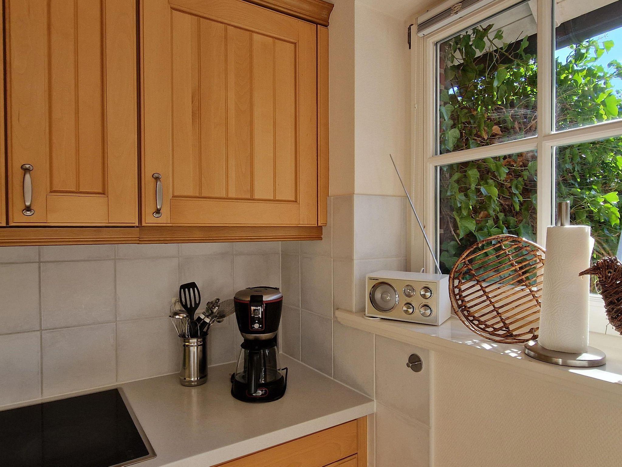 komplett eingerichtete Küche mit Ceranfeld, Mikrowelle, Backofen, Geschirrspüler, Kühlschrank mit Gefrierfach, Wasserkocher, Kaffeemaschine (Filter), Kaffeepadmaschine, Toaster.